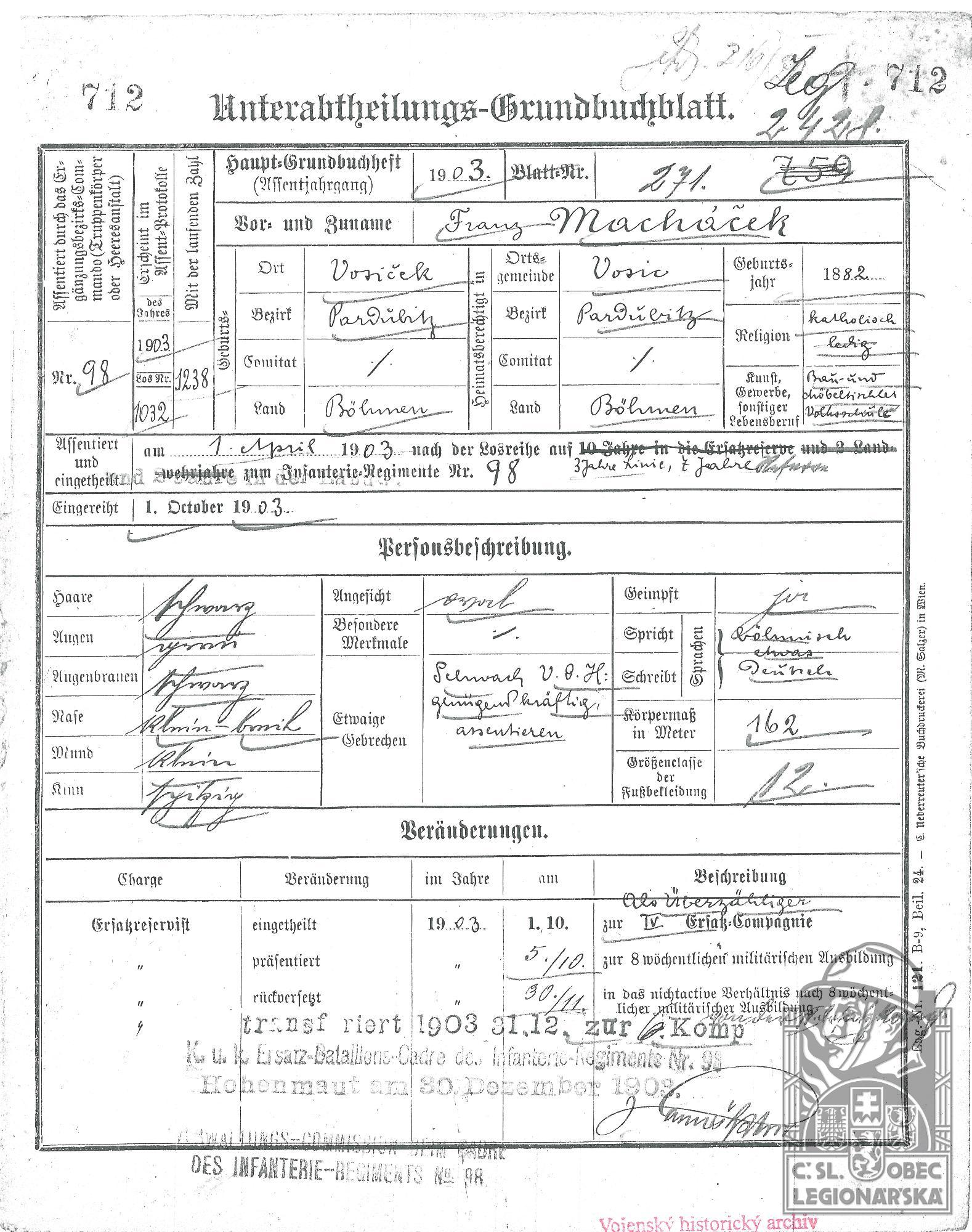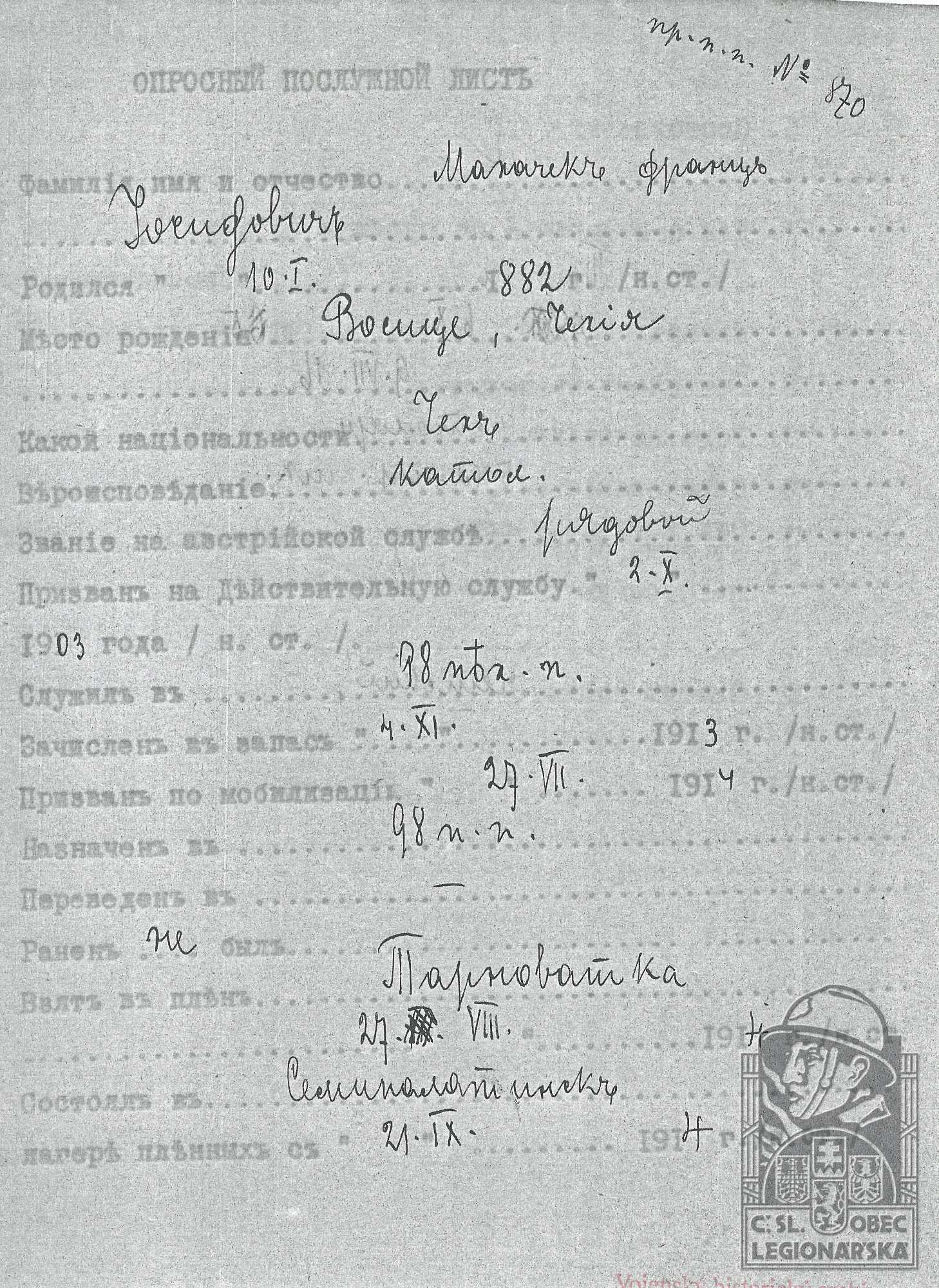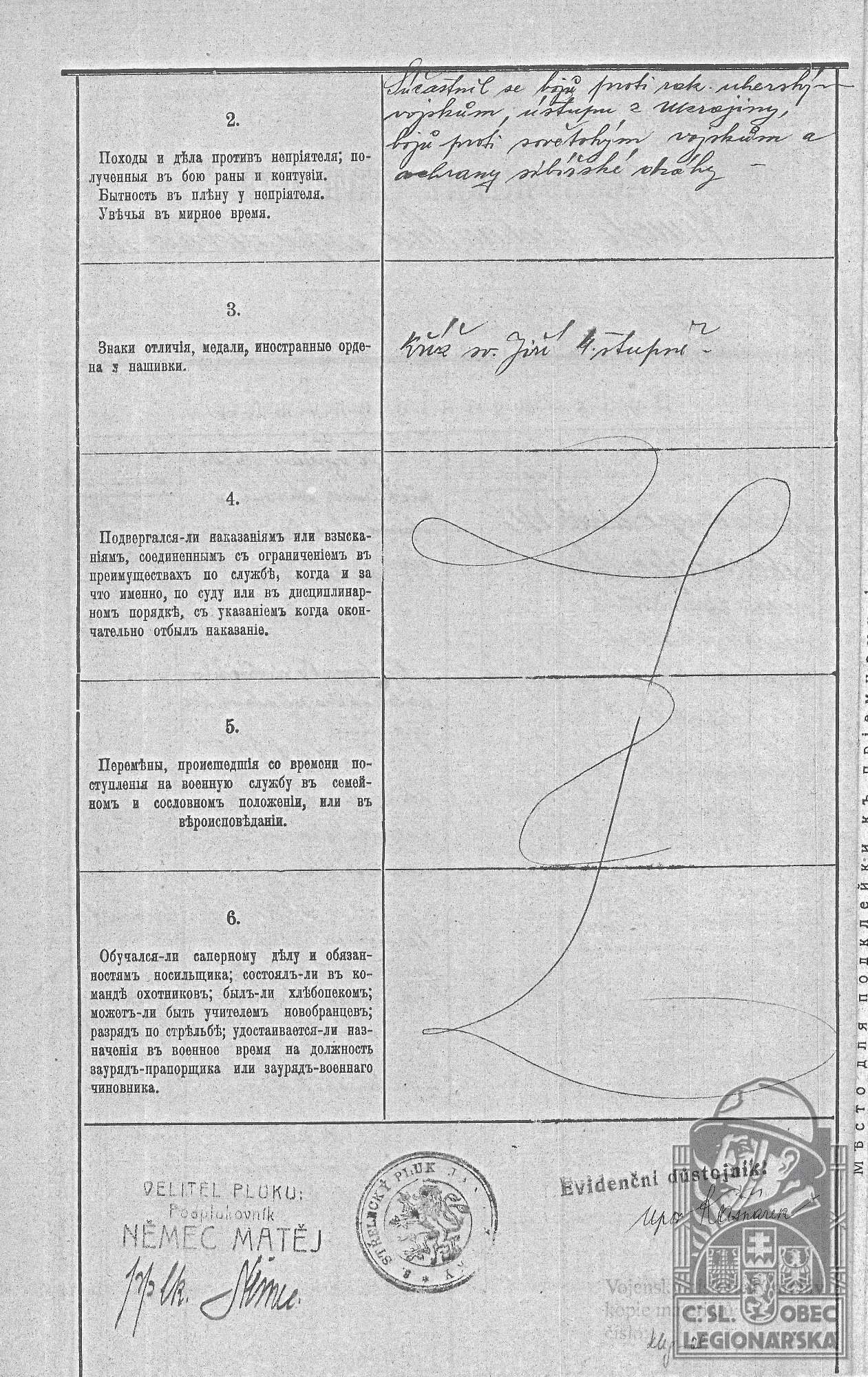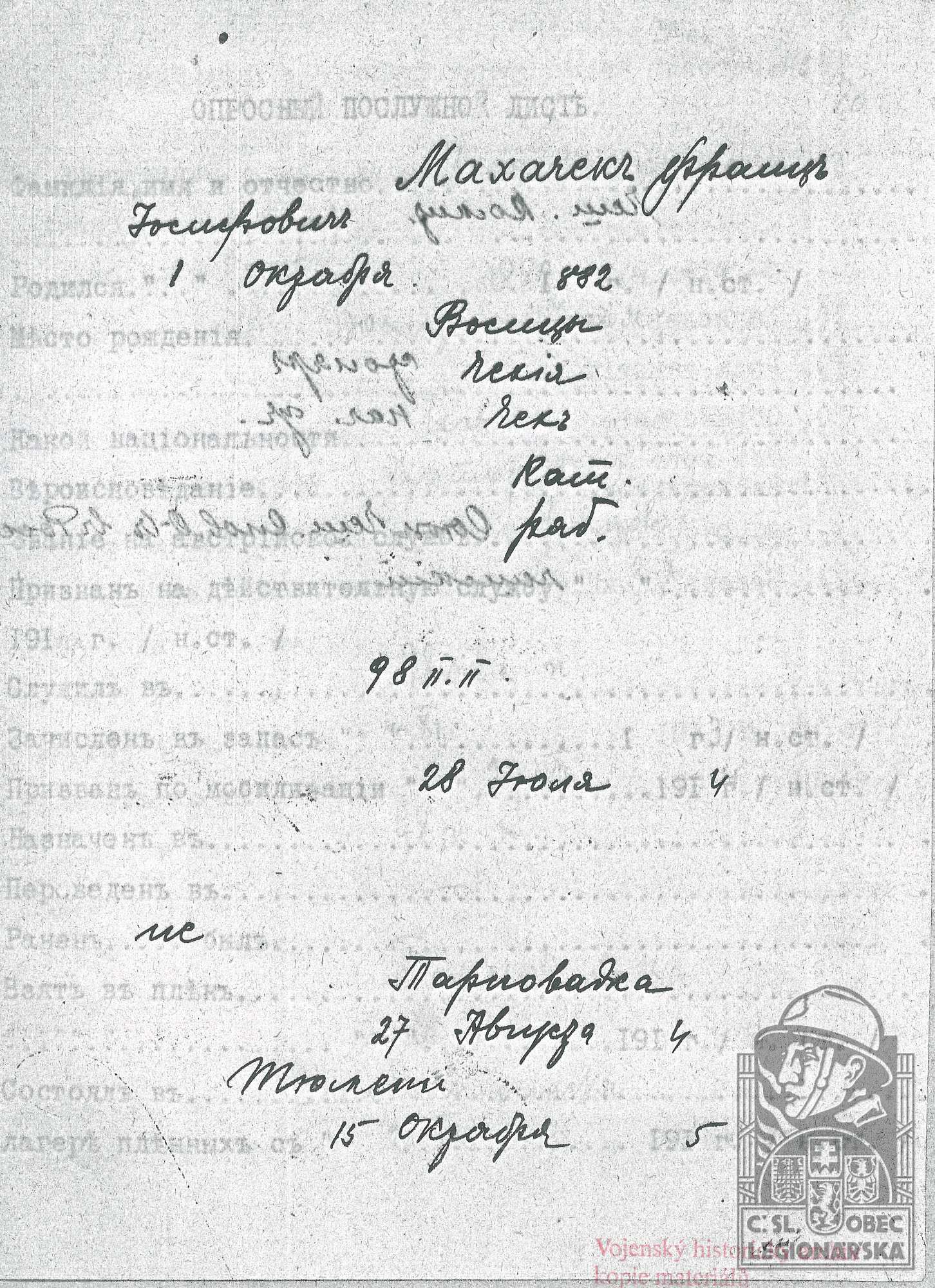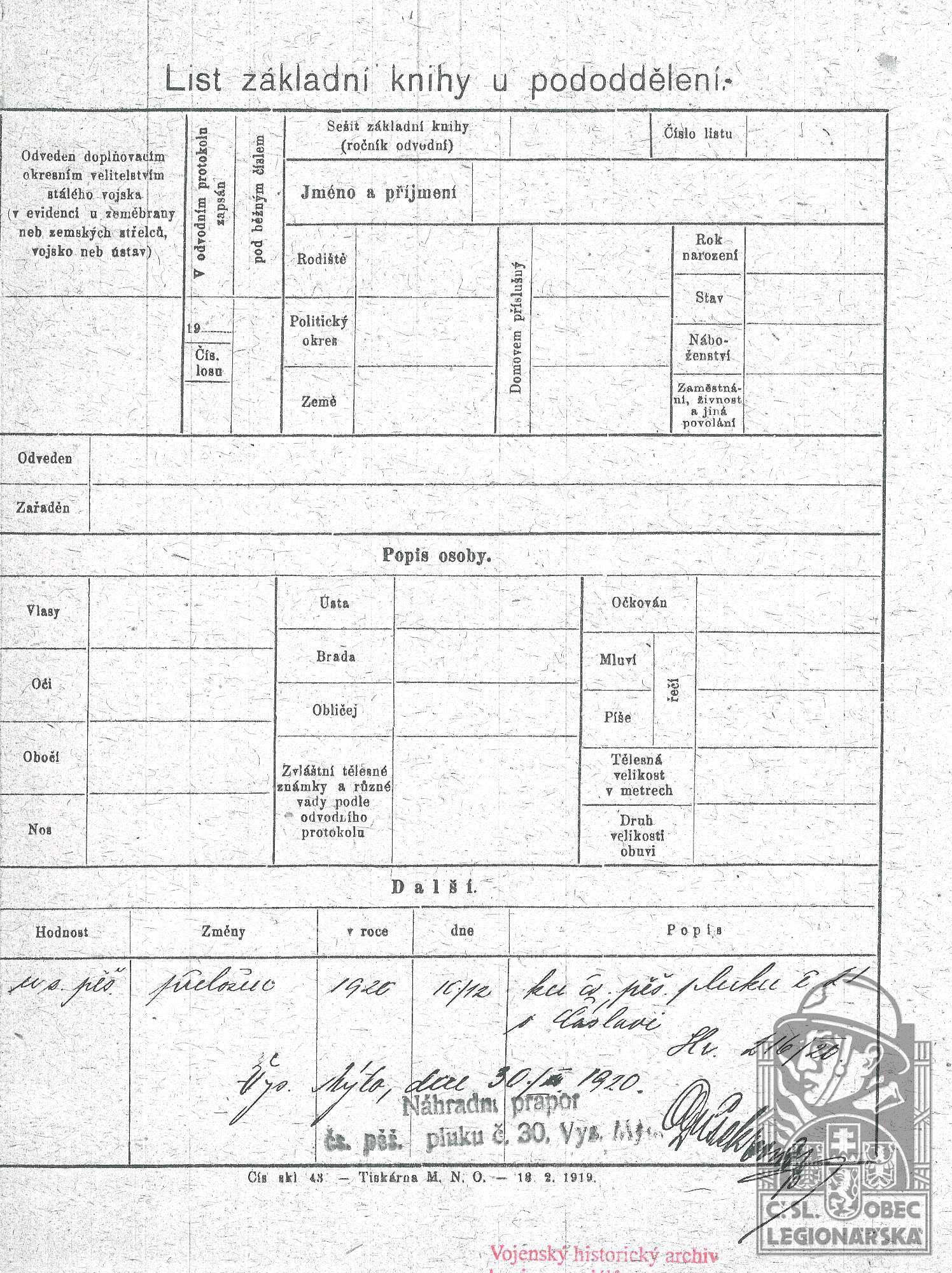 Zdroj informací: legionářský poslužný spis osobní karta legionáře