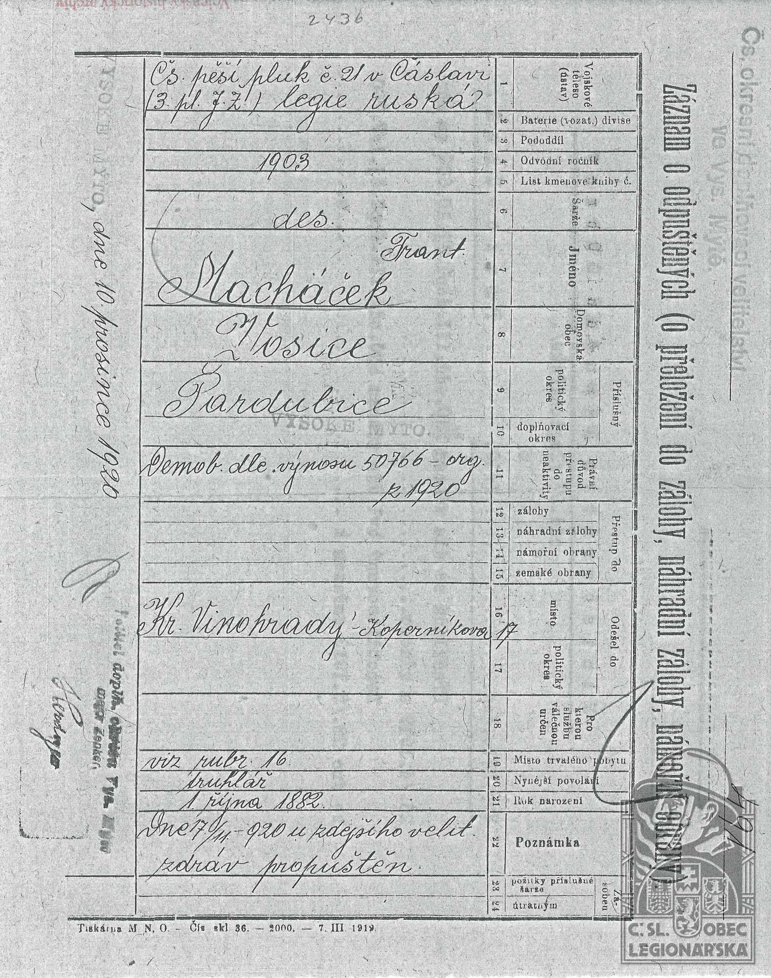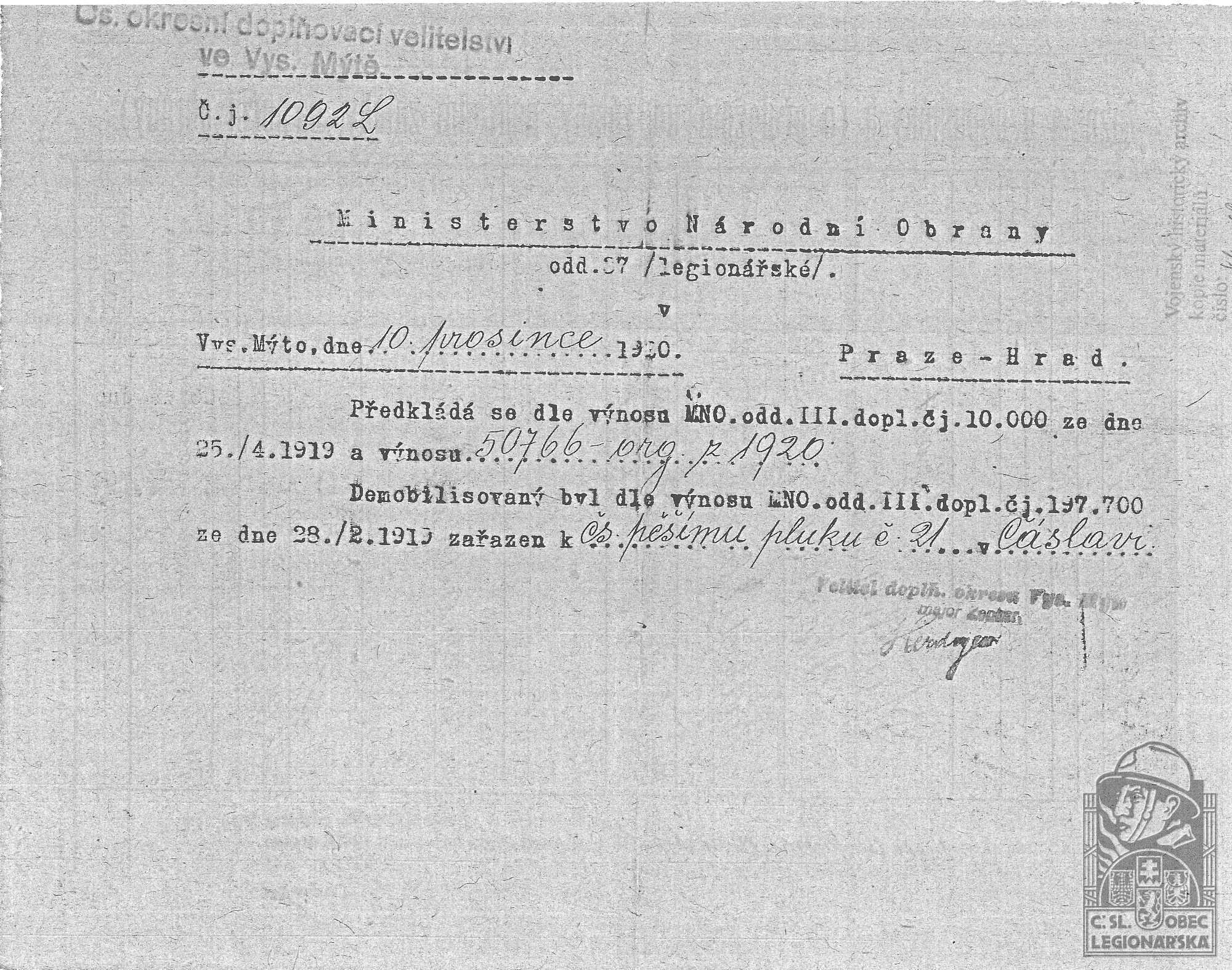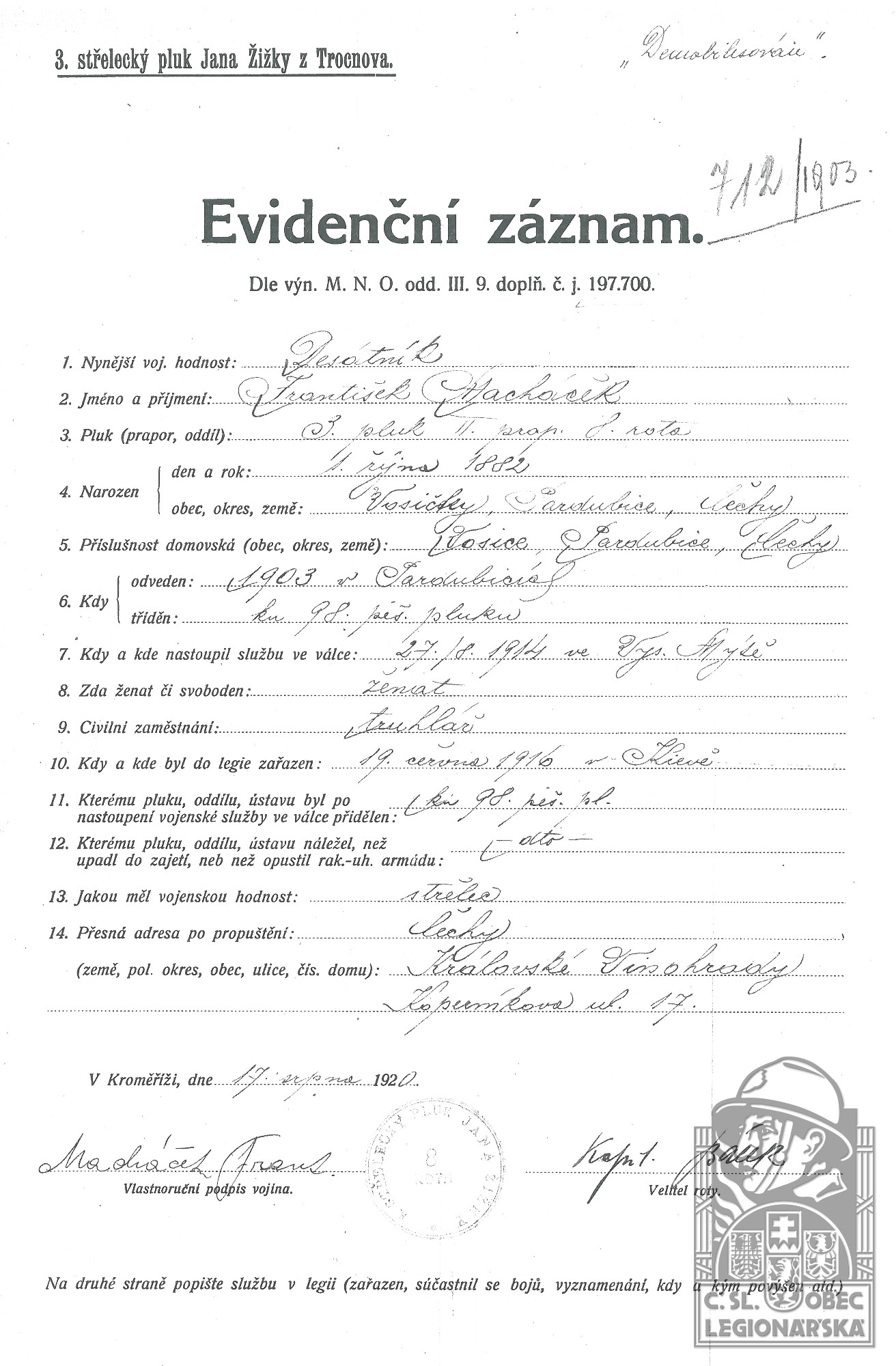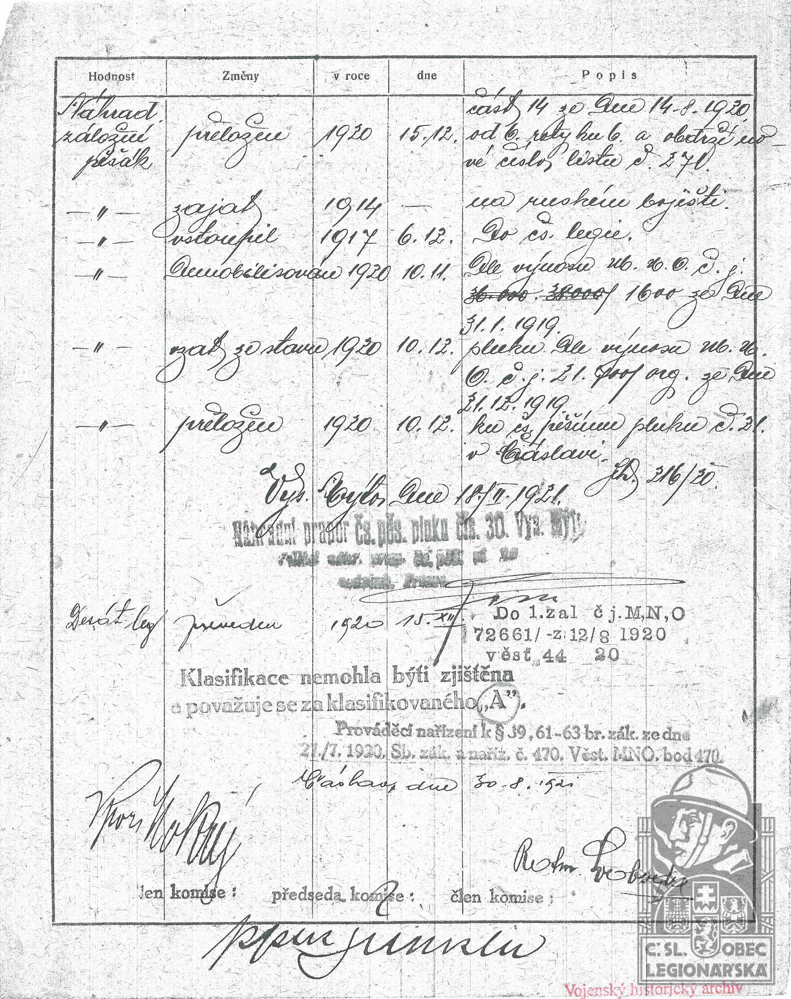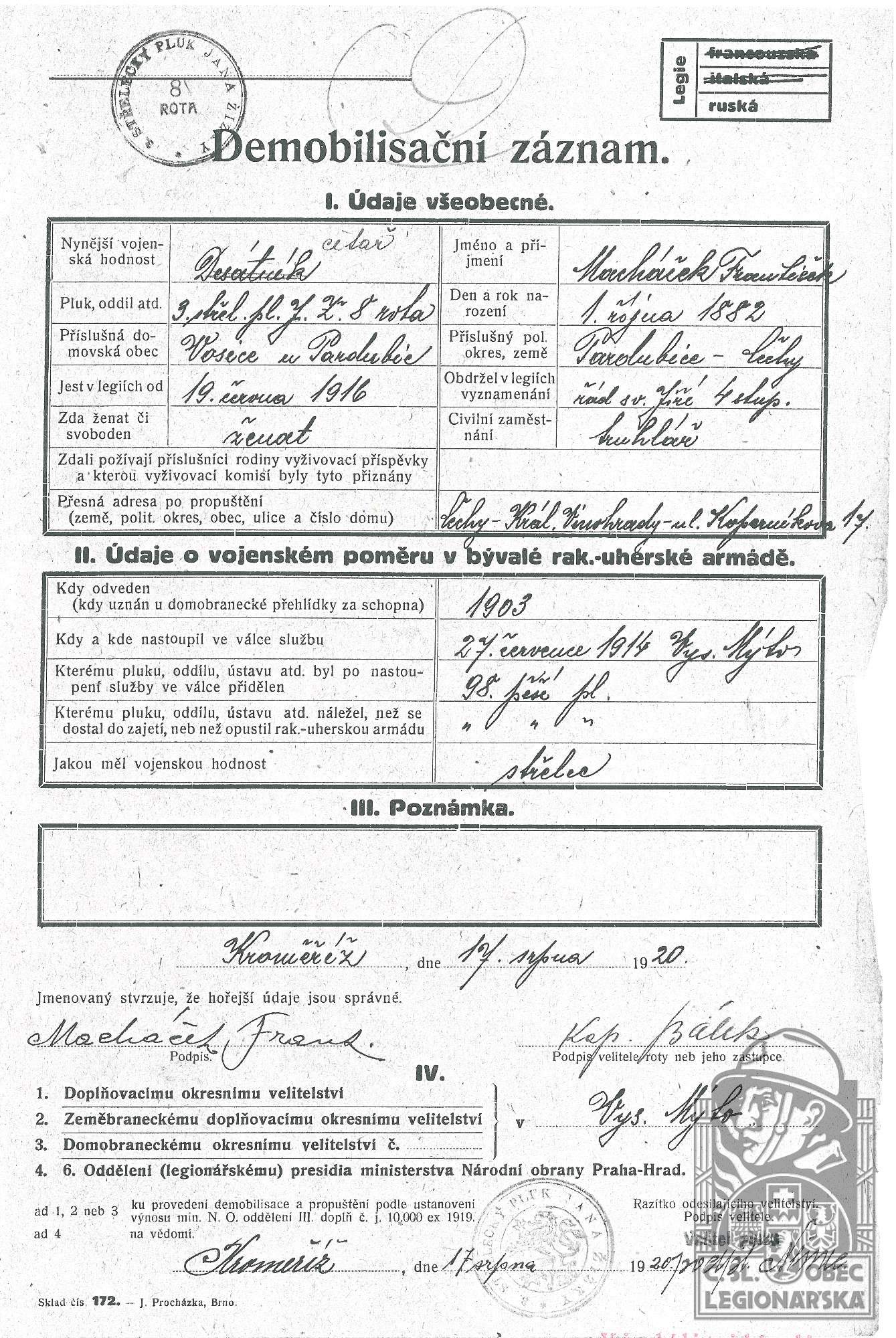 Konec v legiích:17.11.1920 ( Demobilizován )