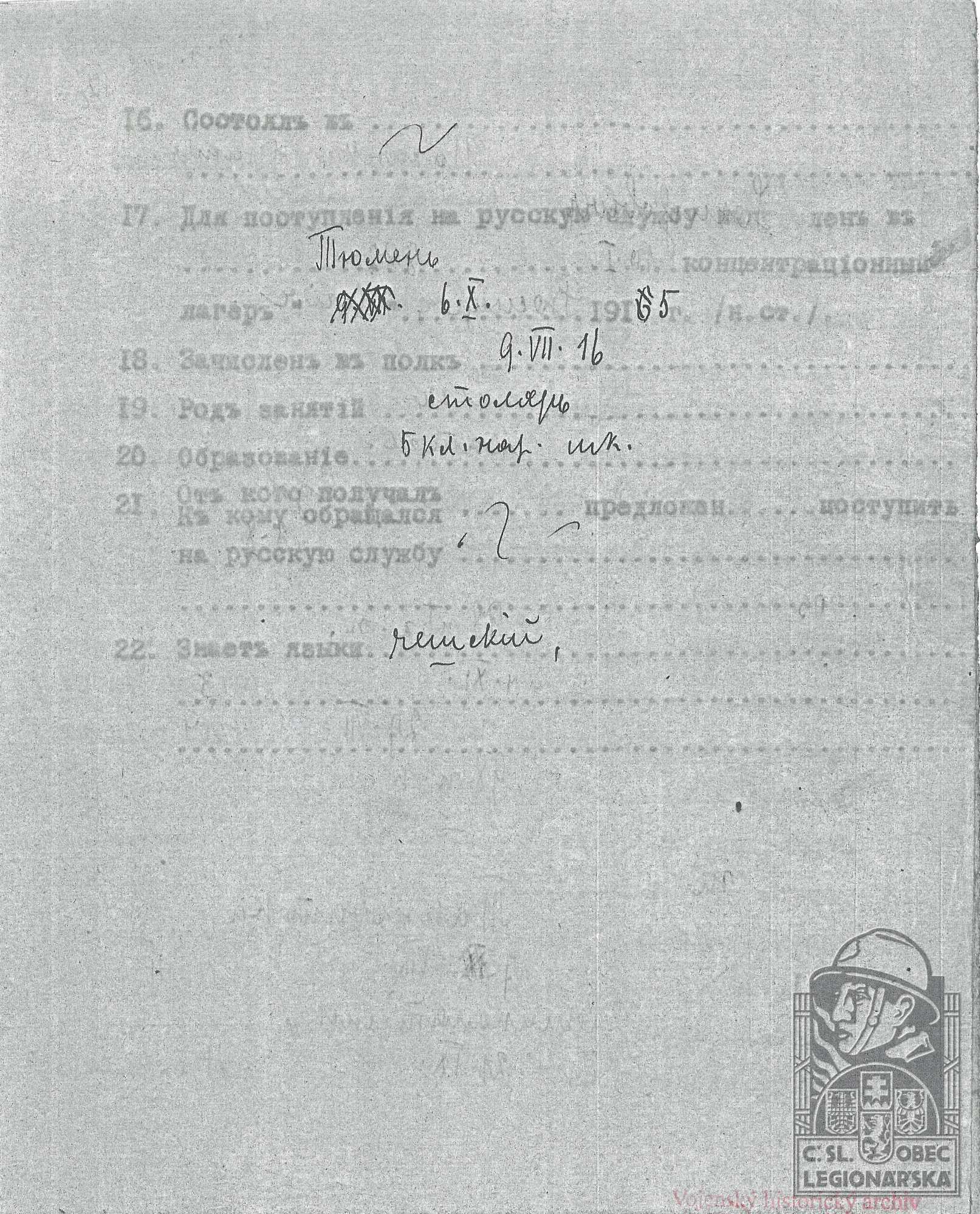Datum zařazení do legií:10.7.1916