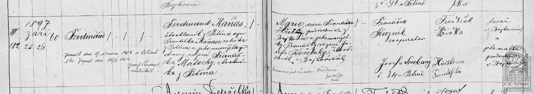 Životopis:Ferdinand Maňas se narodil 25.9.1897 v Pitíně, č. p. 60 do rodiny Ferdinanda Maňase a Marie Hřičkové. Po vychození obecné školy se živil jako rolník, byl i politicky angažovaný u národních socialistů. Do války odešel v řadách 25. zeměbraneckého pěšího pluku z Kroměříže. Do ruského zajetí upadl 2.7.1916 u Lucku na východní frontě. Za necelý rok se v Penze přihlásil do československého vojska na Rusi. V srpnu 1917 rozšířil řady 8. roty 7. čs. střeleckého pluku Tatranského. Více než rok působil v sapérském oddílu. Od 15.11.1918 byl Ferdinand převeden do 2. roty 7. střeleckého pluku. Se svým plukem se účastnil tažení u Jevgeněvky, Spasskoje a Kaulu, operací u Tatarské Birmy, Kunguru a Ašap. závodu na levém břehu řeky Iren. Do vlasti se vrací 26. transportem, lodí Ixion, která plula východní trasou do Kanady. Z Kanady pokračovala část 7. pluku spolu s Ferdinandem Maňasem na lodi Carica směrem do Evropy. Ferdinand se vrátil do své rodné obce, do Pitína, kde se 28.8.1922 oženil s Františkou Navrátilovou. Živil se jako rolník a ve 30. letech byl členem i obecního zastupitelstva. Ruský legionář Ferdinand Maňas zemřel 17.2.1954 v Pitíně.