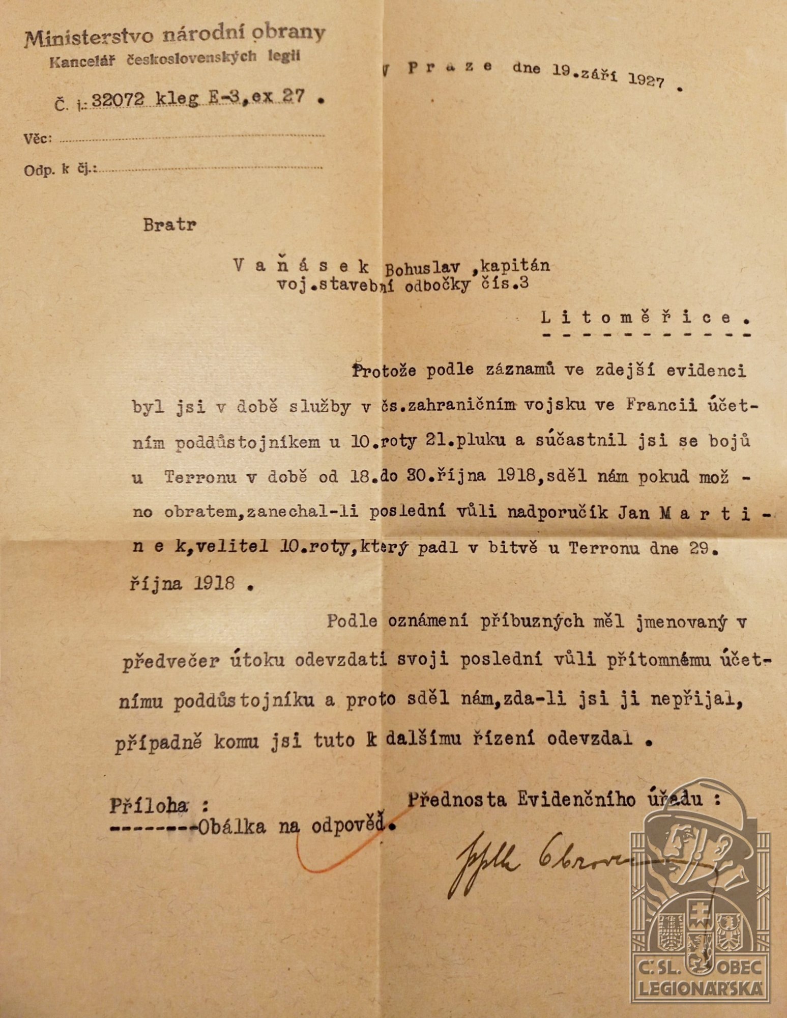 dokumenty spojené s osobou legionáře