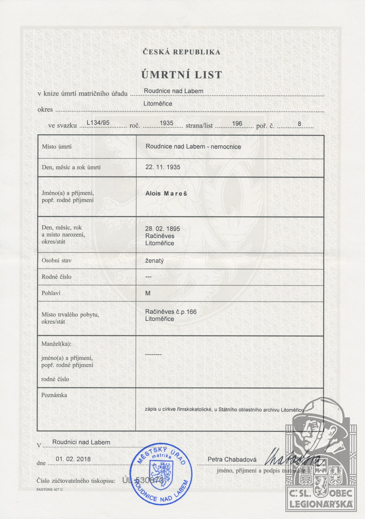 Místo úmrtí:Roudnice nad Labem - nemocnice