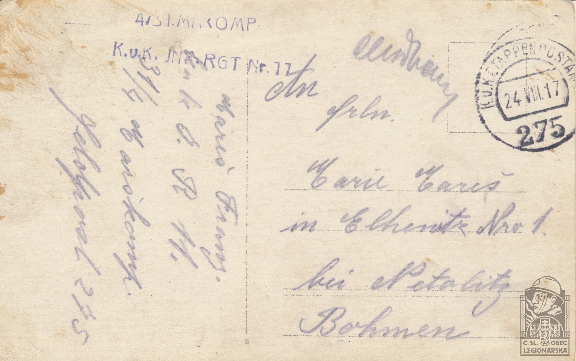 Jednotka v době zařazení:33.p.pl. ( Čs. legie v Itálii )