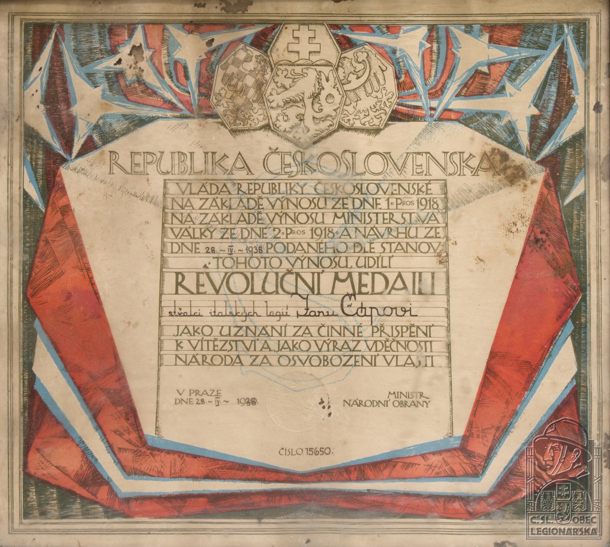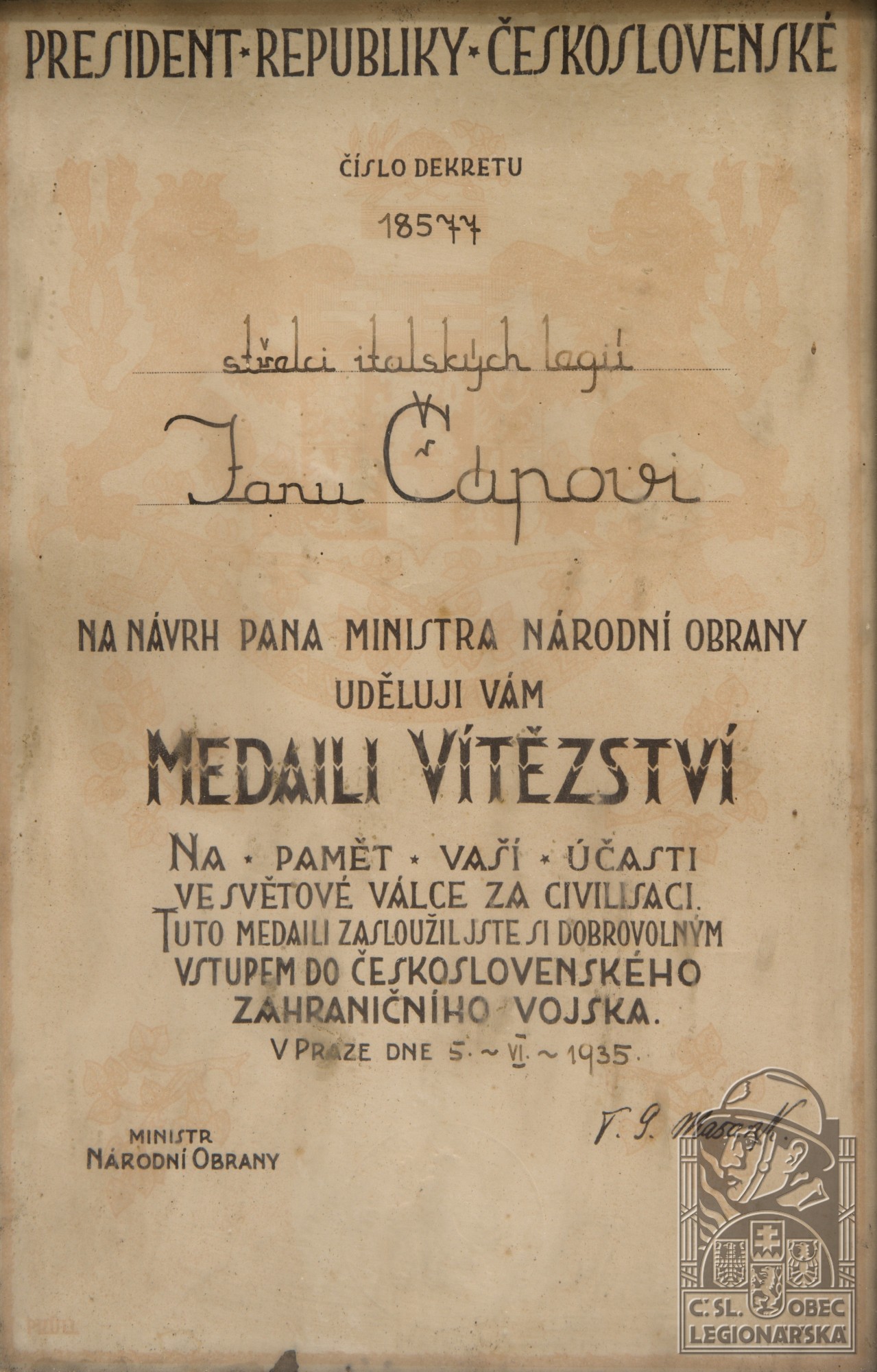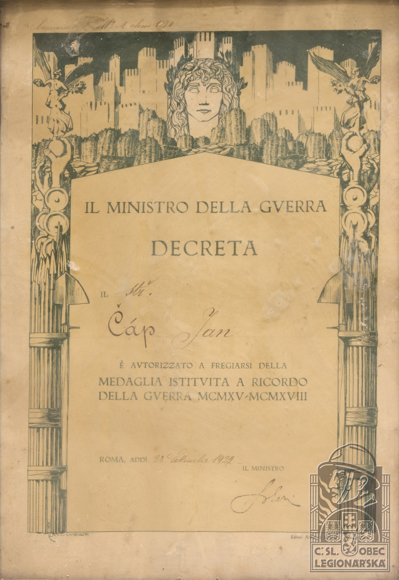 Jednotka v době zařazení:34.p.pl. ( Čs. legie v Itálii )