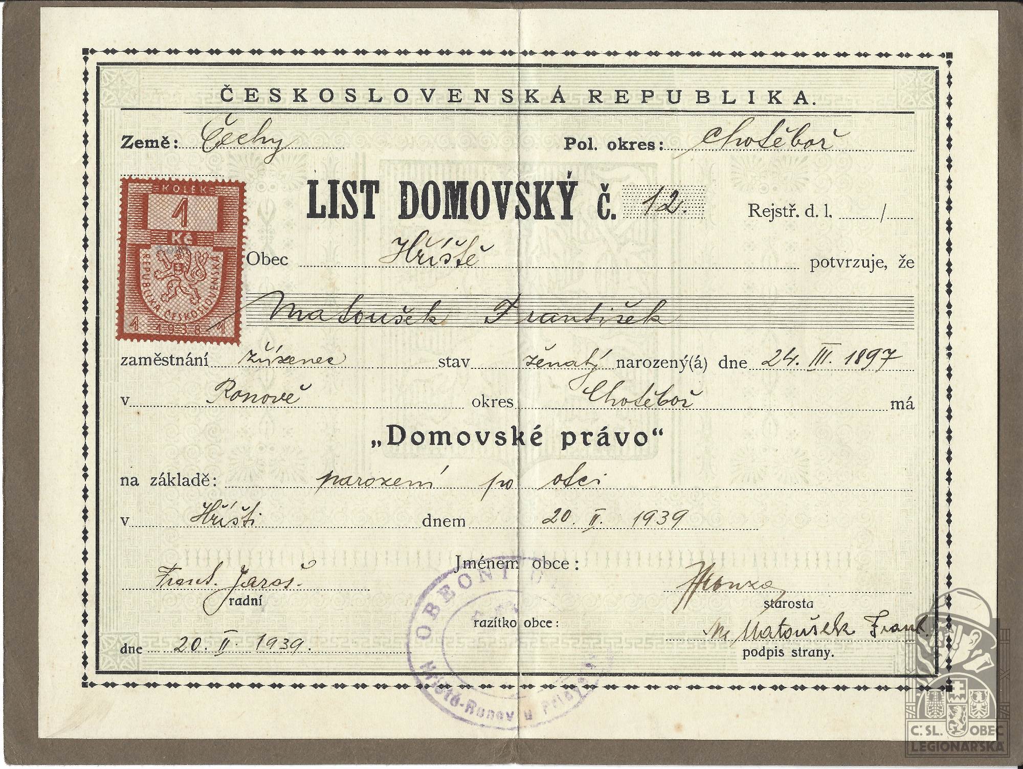 Zdroj informací: legionářský poslužný spis osobní karta legionáře