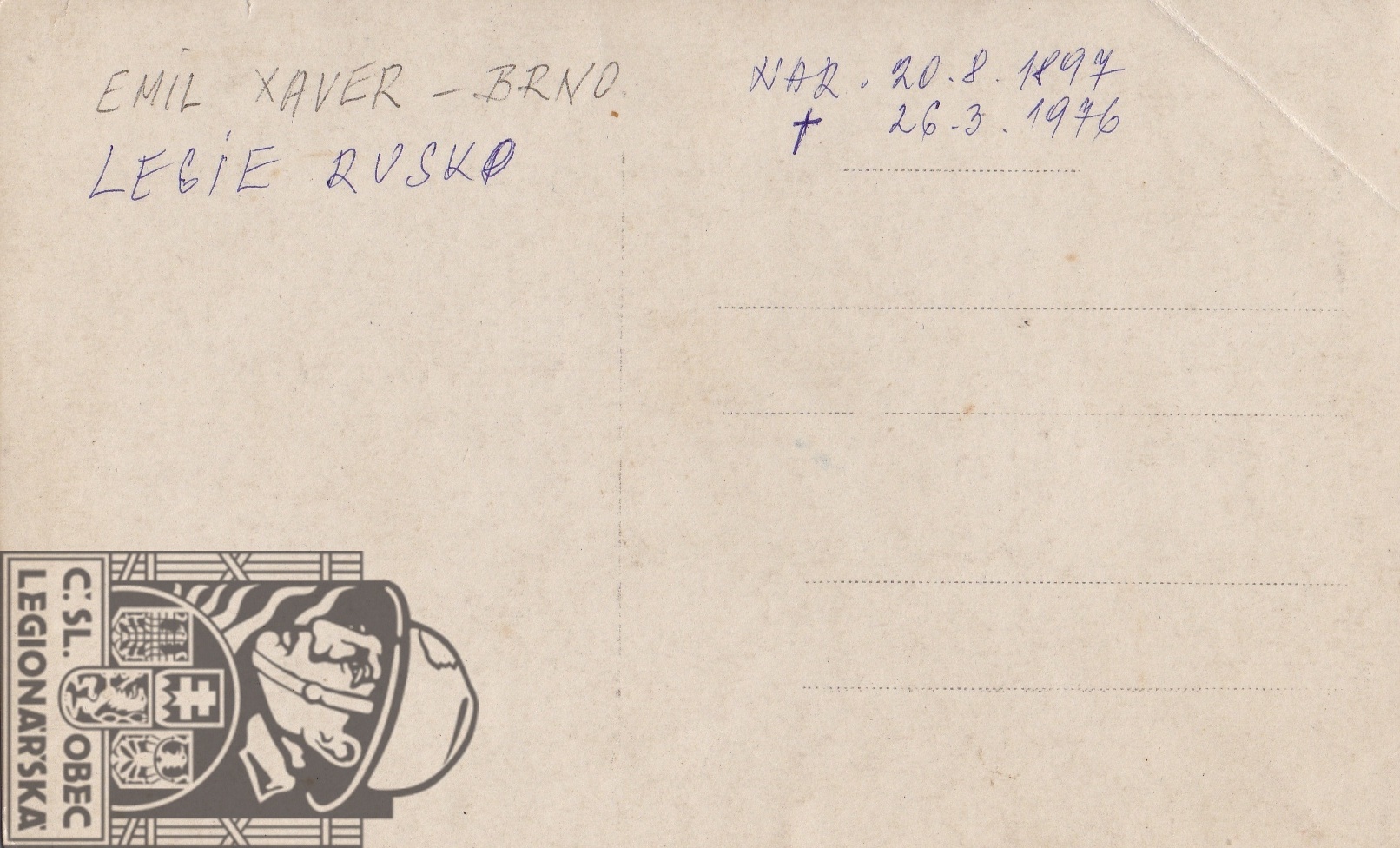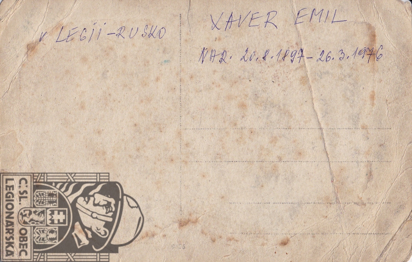 Poznámka:služba v legii od 2.4.1917 do 10.8.1920