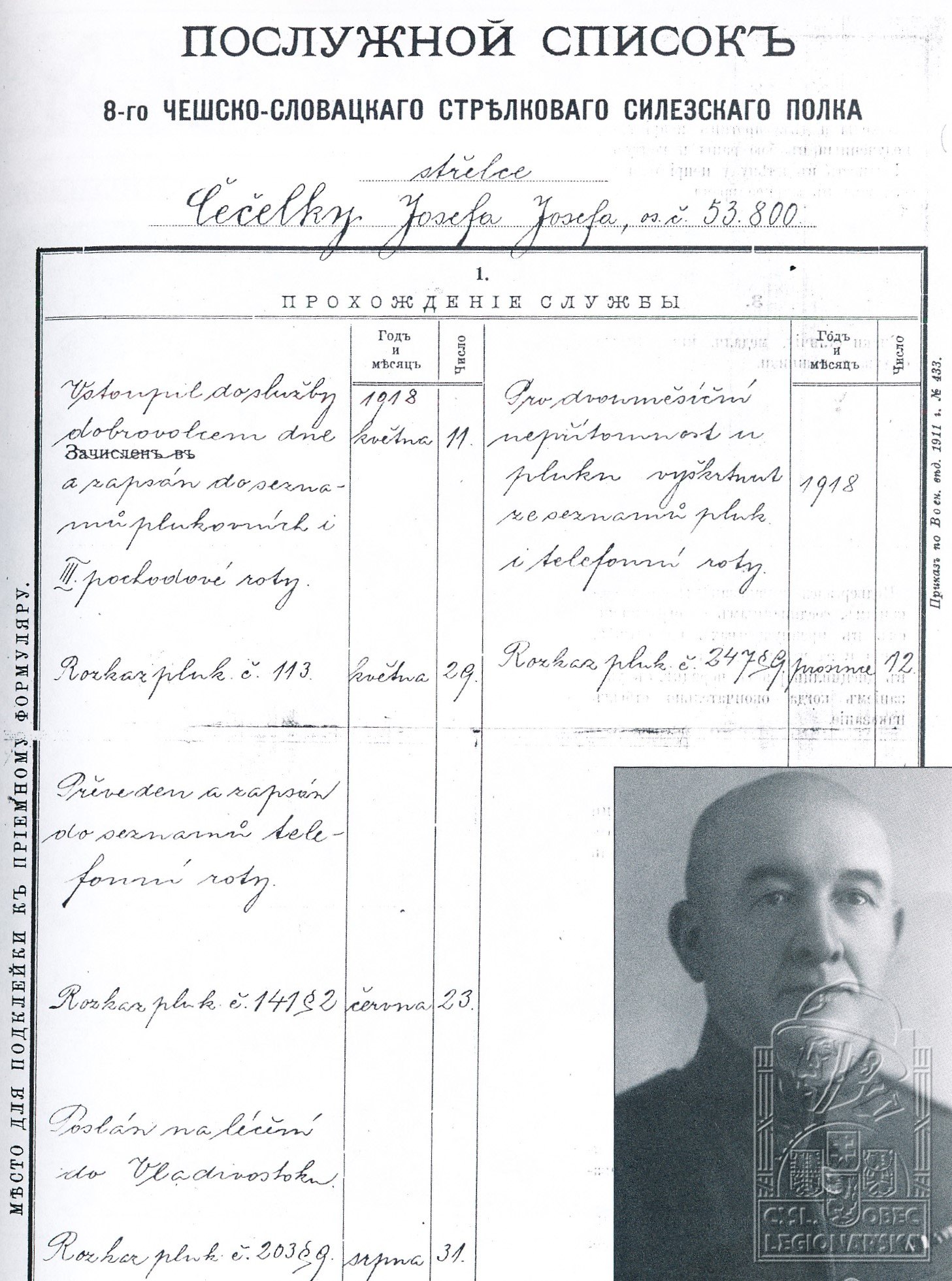 Jednotka v době zařazení:8.stř.pl. ( Čs. legie v Rusku )