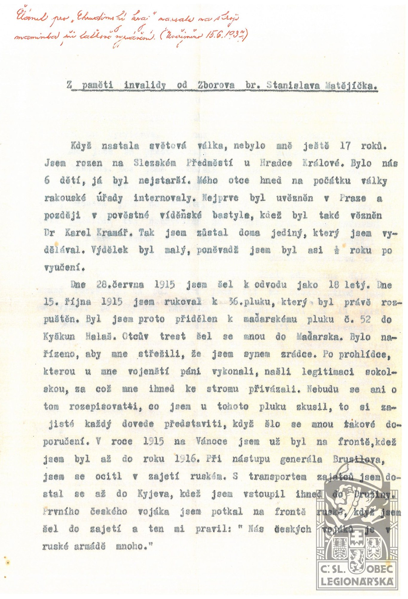 Datum zařazení do legií:16.6.1916