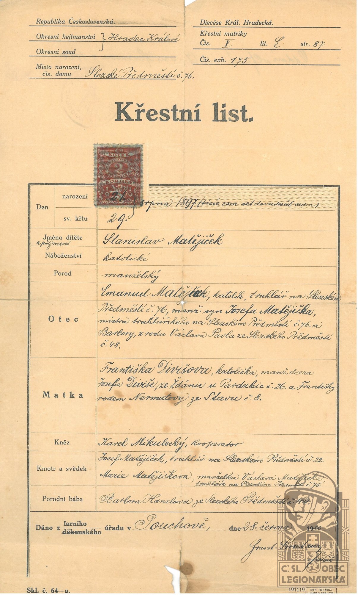 Zdroj informací: legionářský poslužný spis osobní karta legionáře