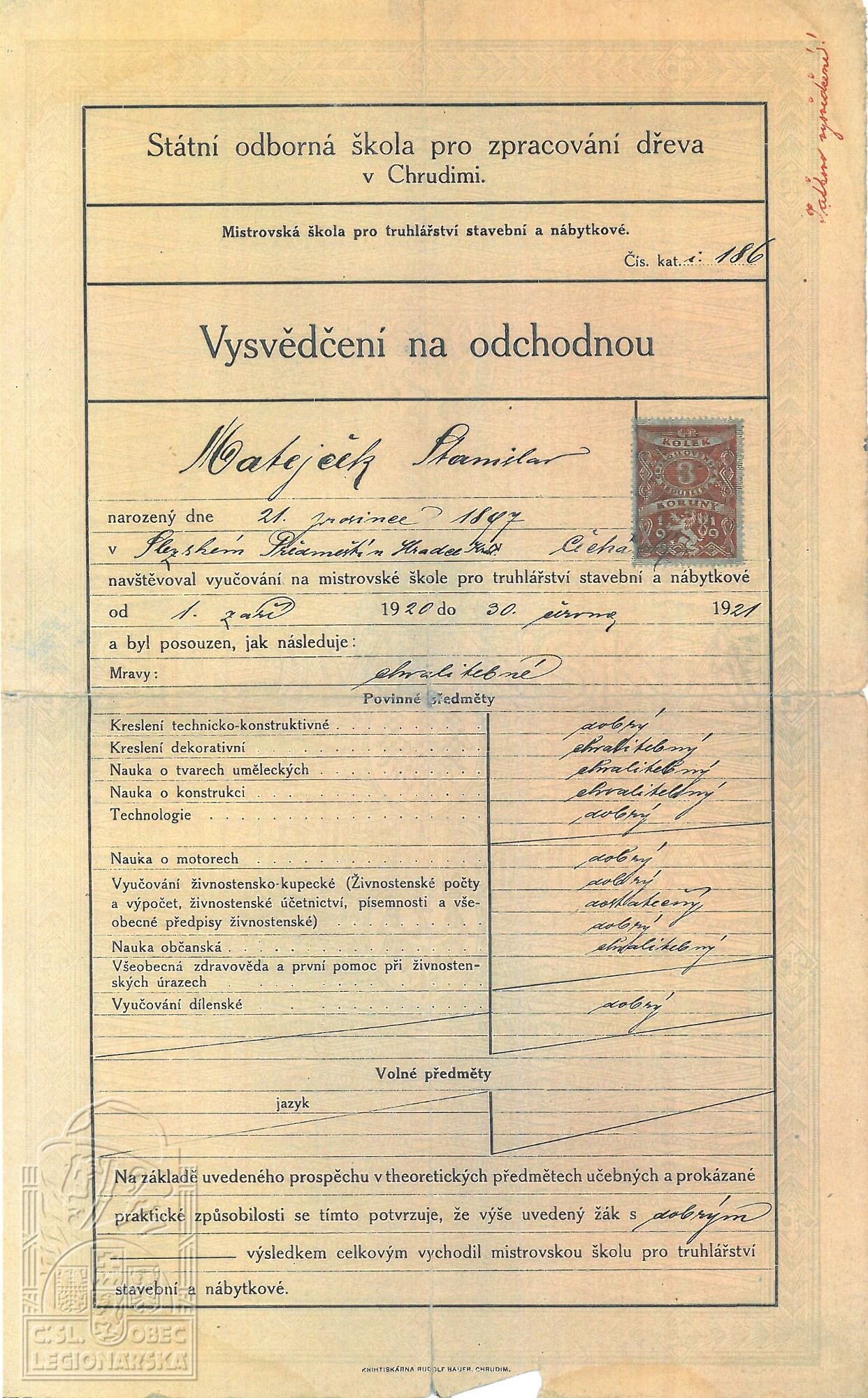 Poslední útvar v legiích:1.stř.pl.