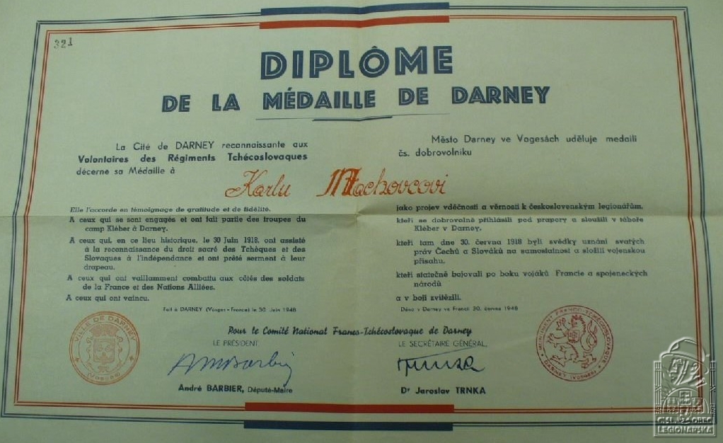 Jednotka v době zařazení:21.stř.pl. ( Čs. legie v Francii )