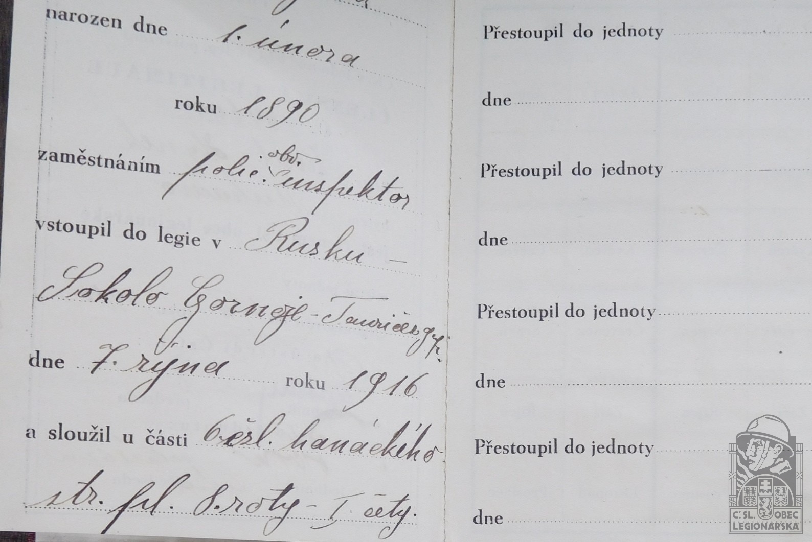 Zdroj informací: legionářský poslužný spis osobní karta legionáře