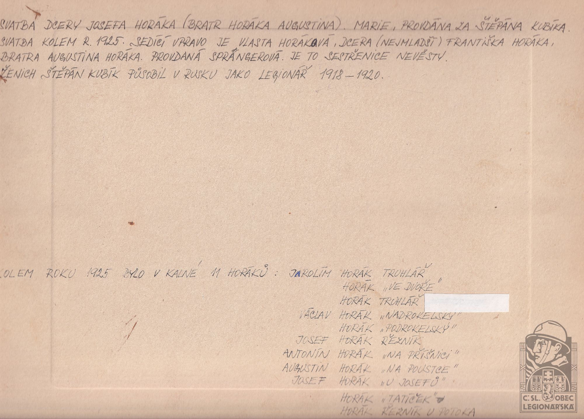 Poznámka:služba v legii od 27.6.1918 do 15.10.1920; svatba 1925.