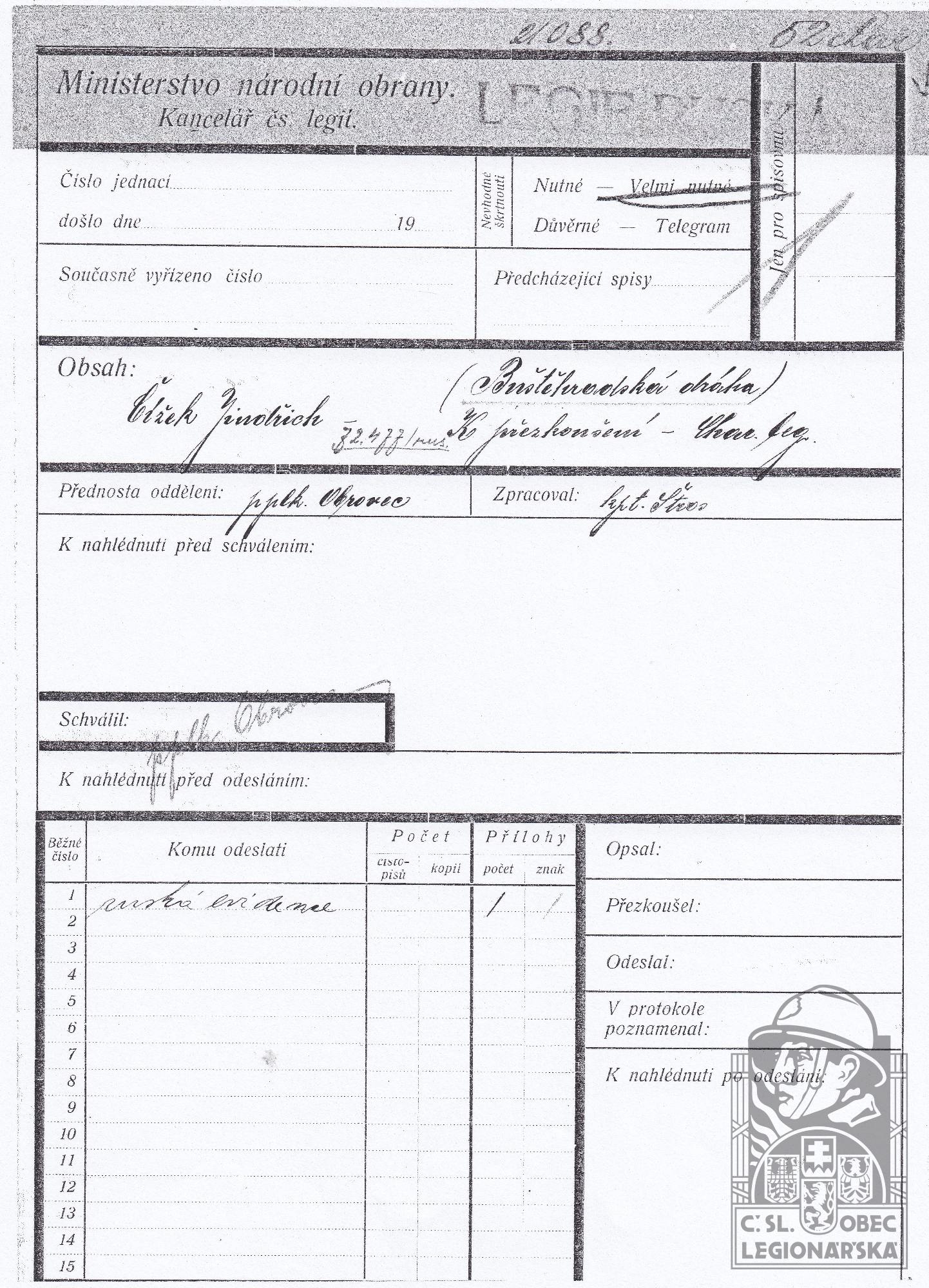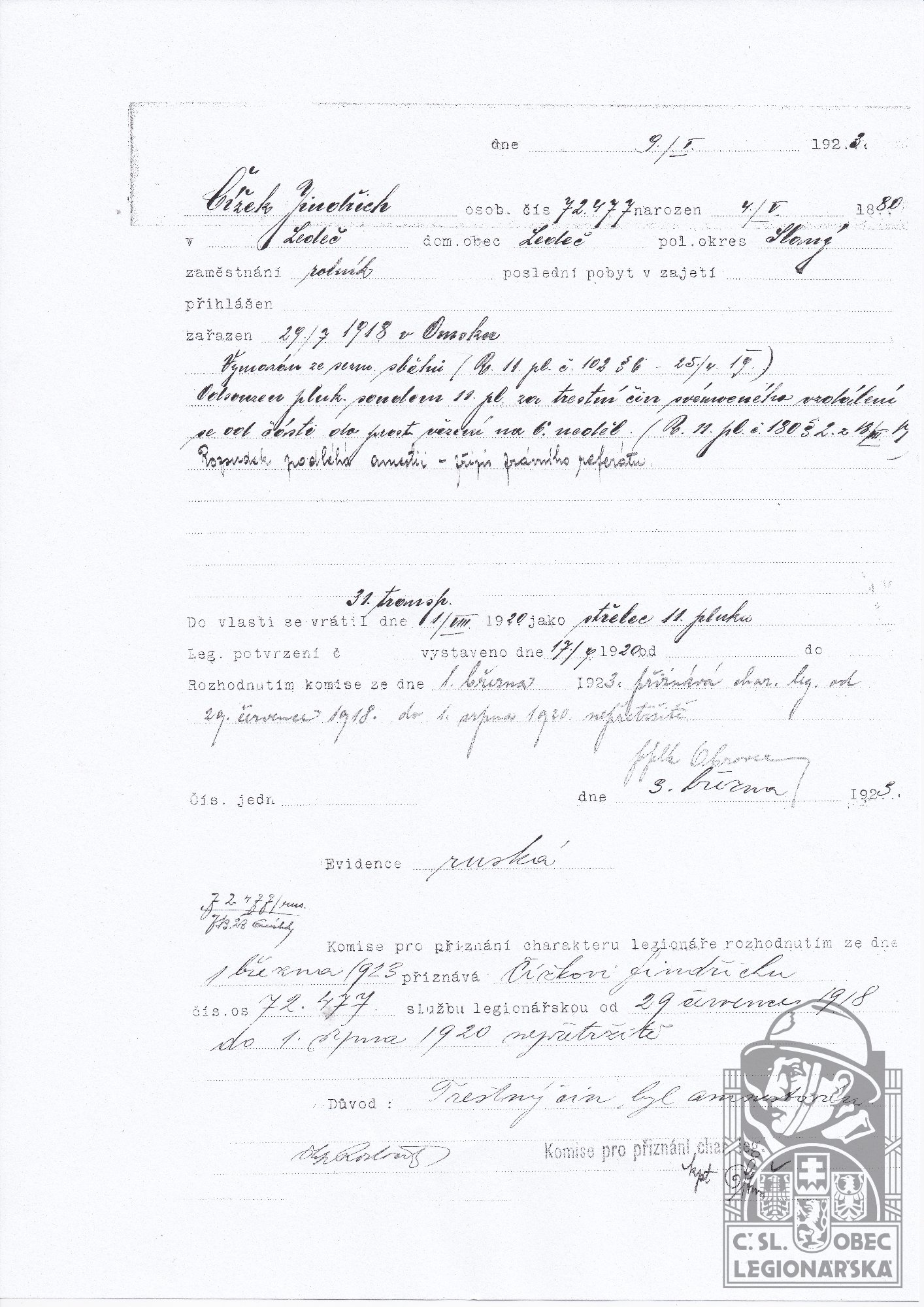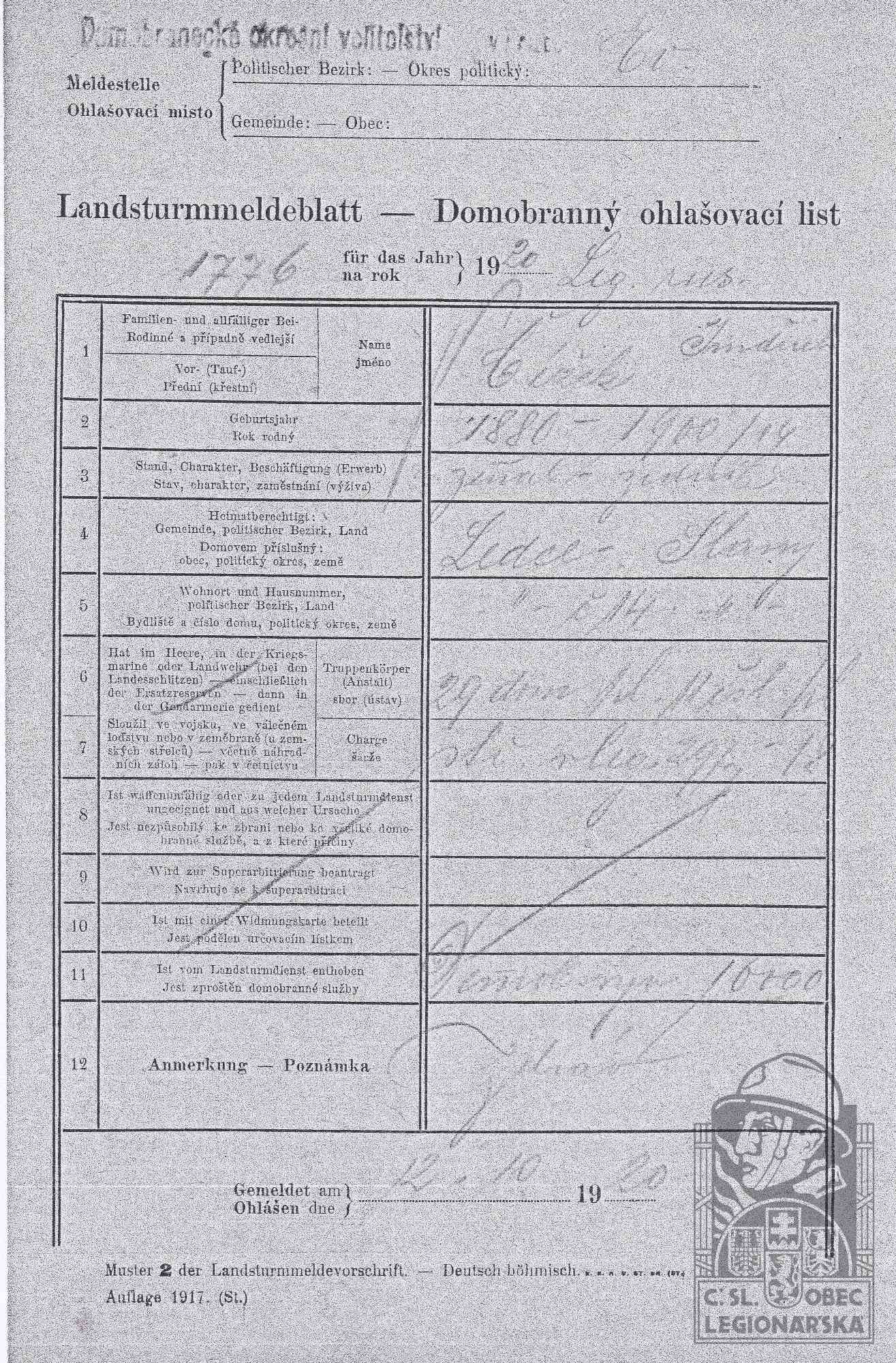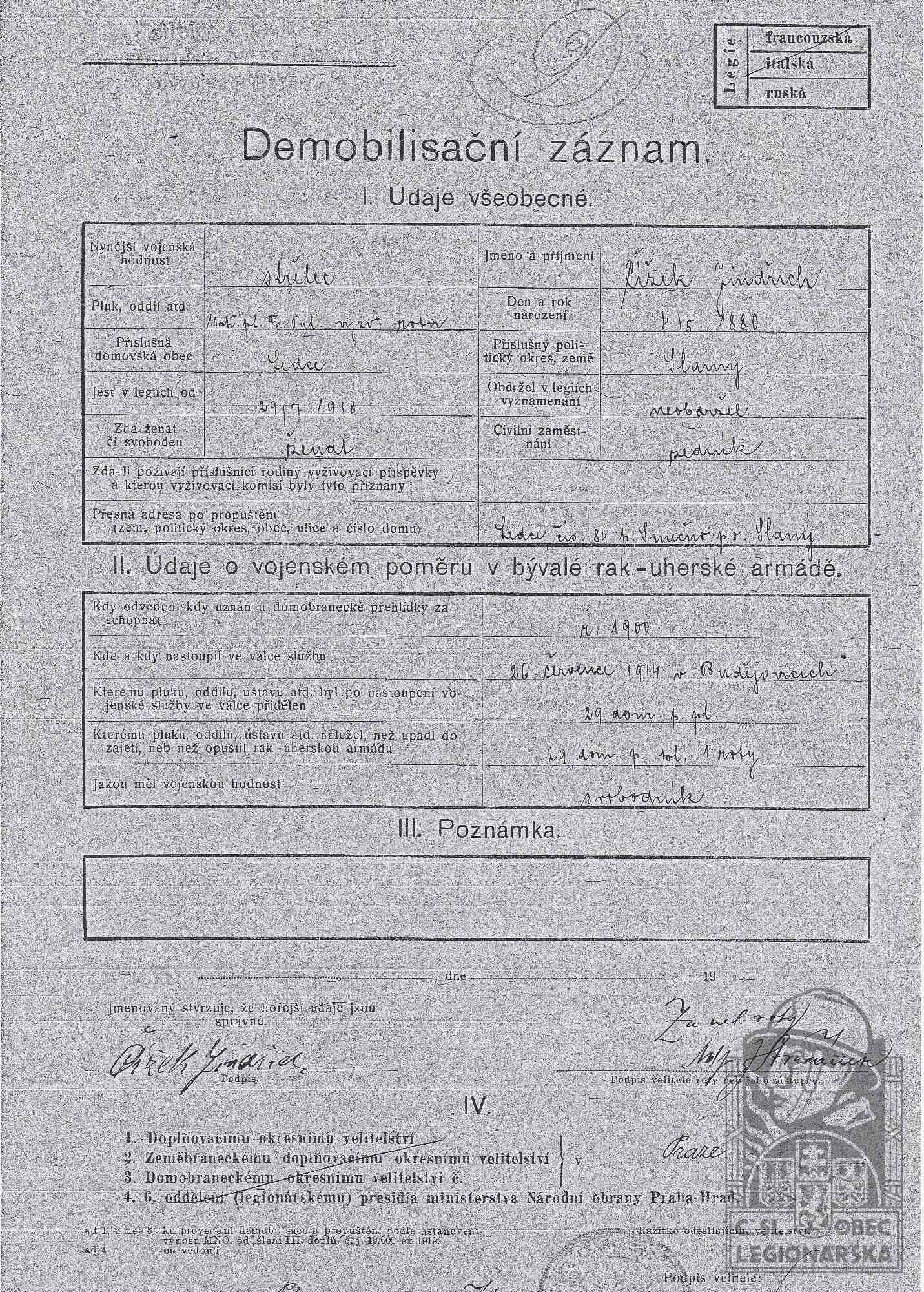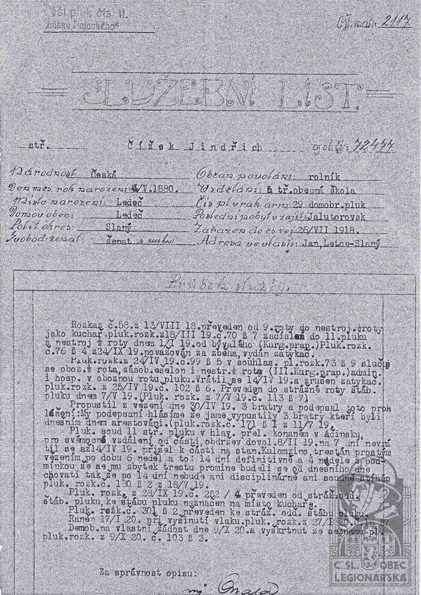 Zdroj informací: legionářský poslužný spis osobní karta legionáře