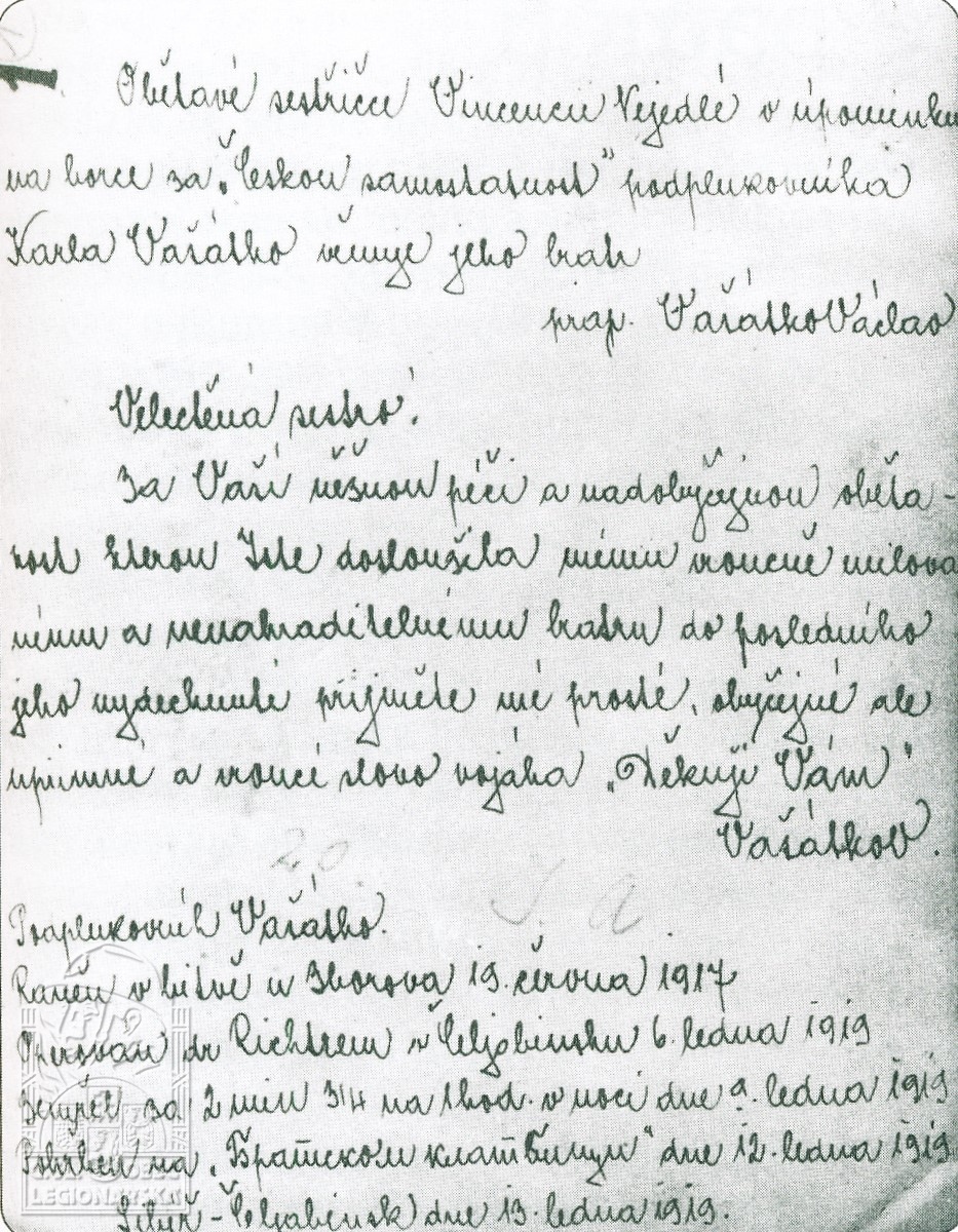 Zdroj informací: legionářský poslužný spis osobní karta legionáře JANKŮ, Radka. Legionáři Jičínska. Jičín: OkÚ Jičín, 2000.