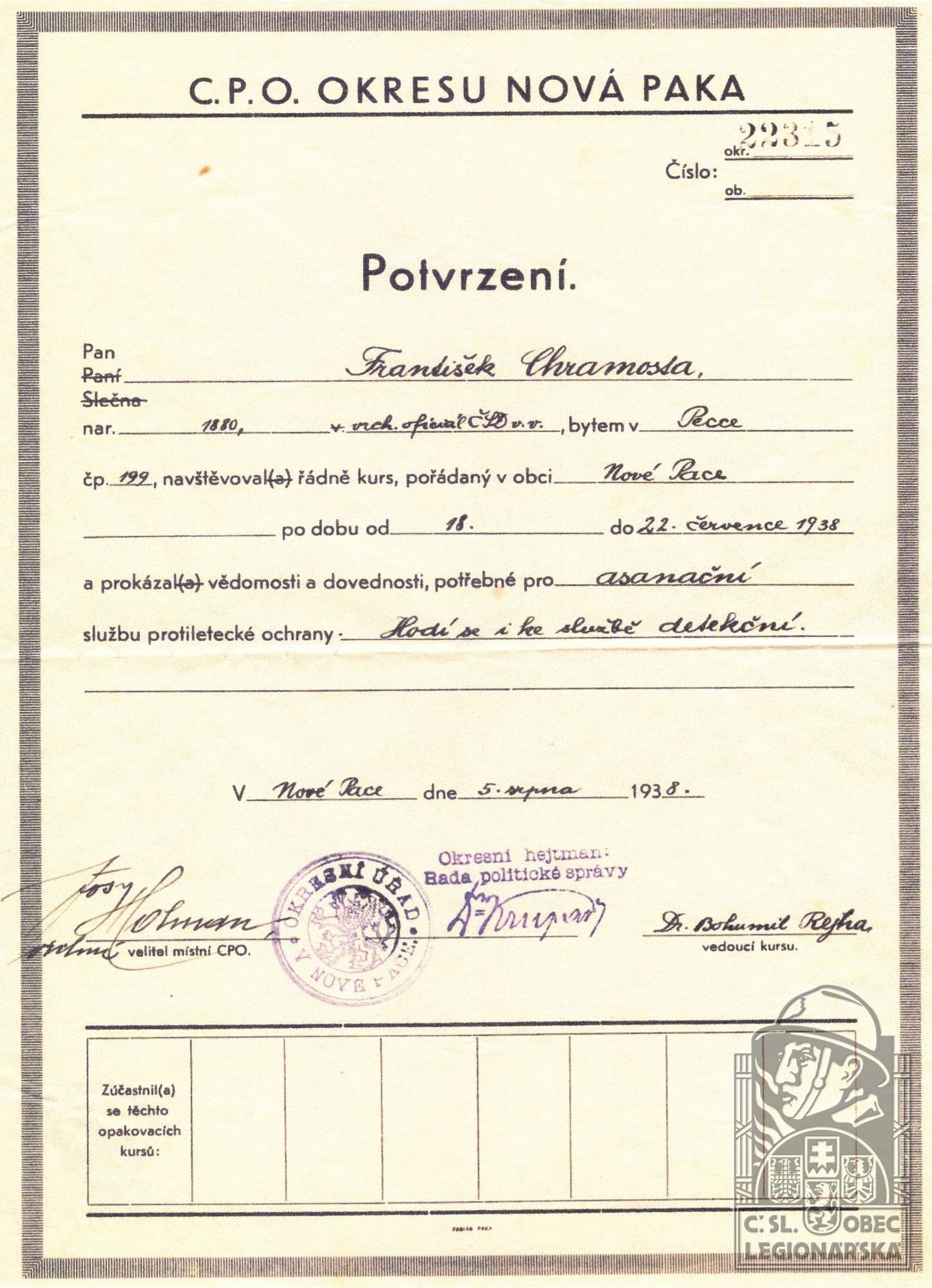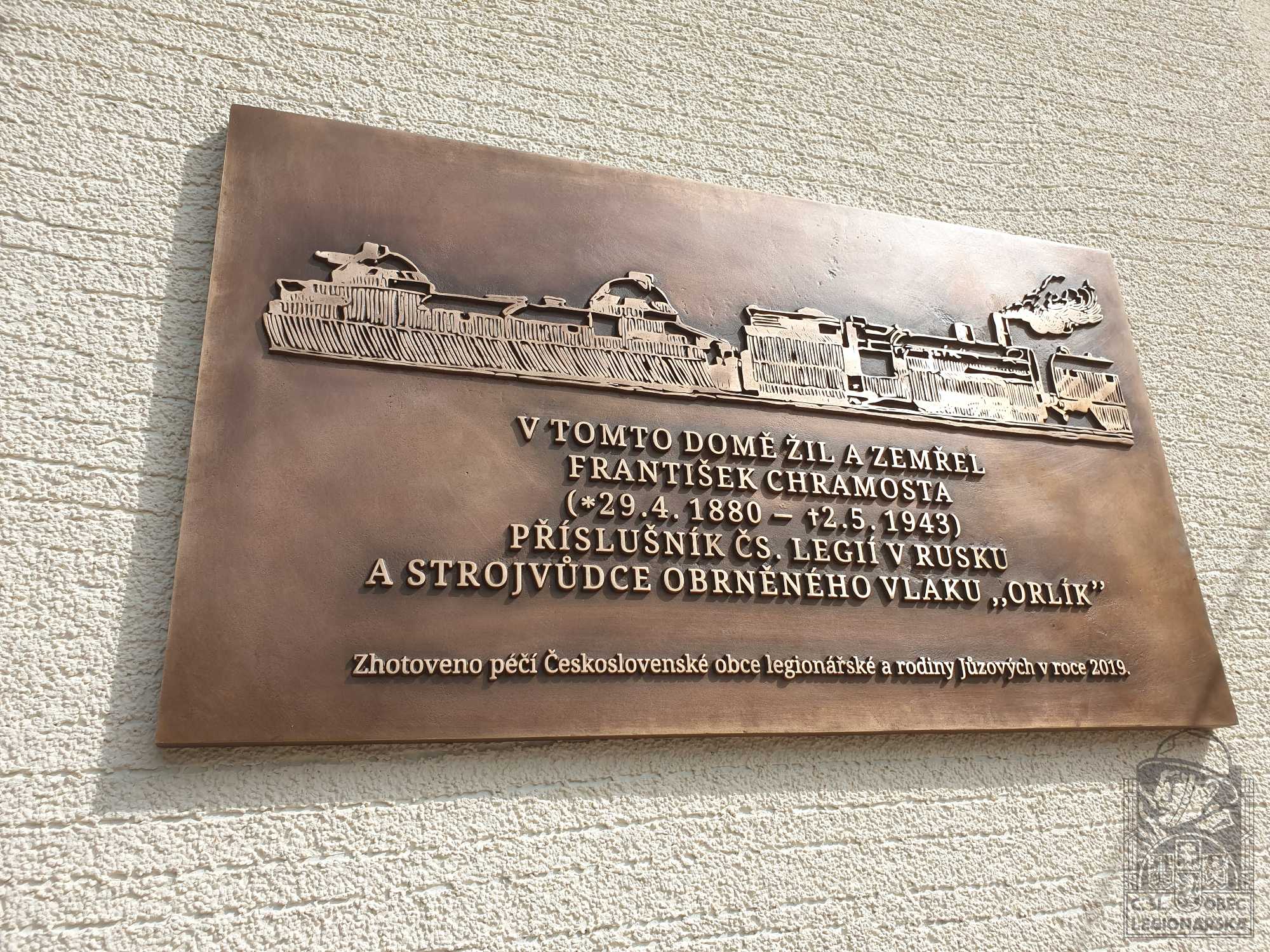 Životopis:Legionář František Chramosta se narodil 24.4.1880 v obci Jizerní Vtelno (okr. Mladá Boleslav). Před první světovou válkou žil v obci Sedlec, než odešel na Slovensko do Medzilaborců v tehdejší Zemplínské župě. Získal dobré technické vzdělání a stal se strojvedoucím. Svou profesi uplatnil i během prezenční vojenské služby v armádě Rakousko-Uherska, kdy sloužil u železničního vojska s úkolem provádět obnovu železničních tratí a zabezpečování provozu na železnici. Stejně jako tisíce ostatních českých mužů byl po vyhlášení války povolán do řad rakousko-uherské armády a musel odejít na východní frontu. Stal se jedním z 110 000 obránců pevnosti Přemyšl u stejnojmenného haličského města. Pevnost byla během ofenzívy ruské armády v Haliči obklíčena, ovšem pokusům o dobytí statečně odolávala. Pevnost nebylo možné nadále zásobovat a její obránci hladověli. Po několika měsících pevnost padla 22.3.1915 a její obránci se stali válečnými zajatci. Stejně tak František Chramosta, který byl tou dobou desátníkem.