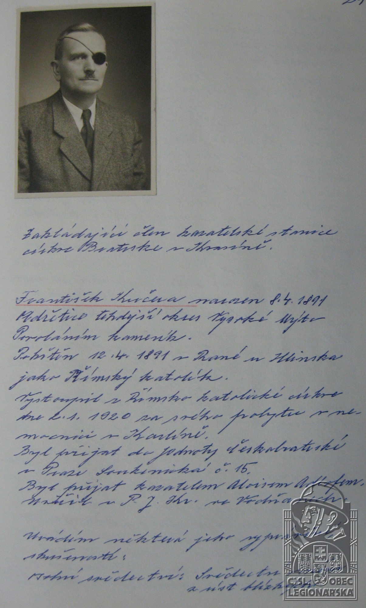 Zdroj informací: legionářský poslužný spis osobní karta legionáře