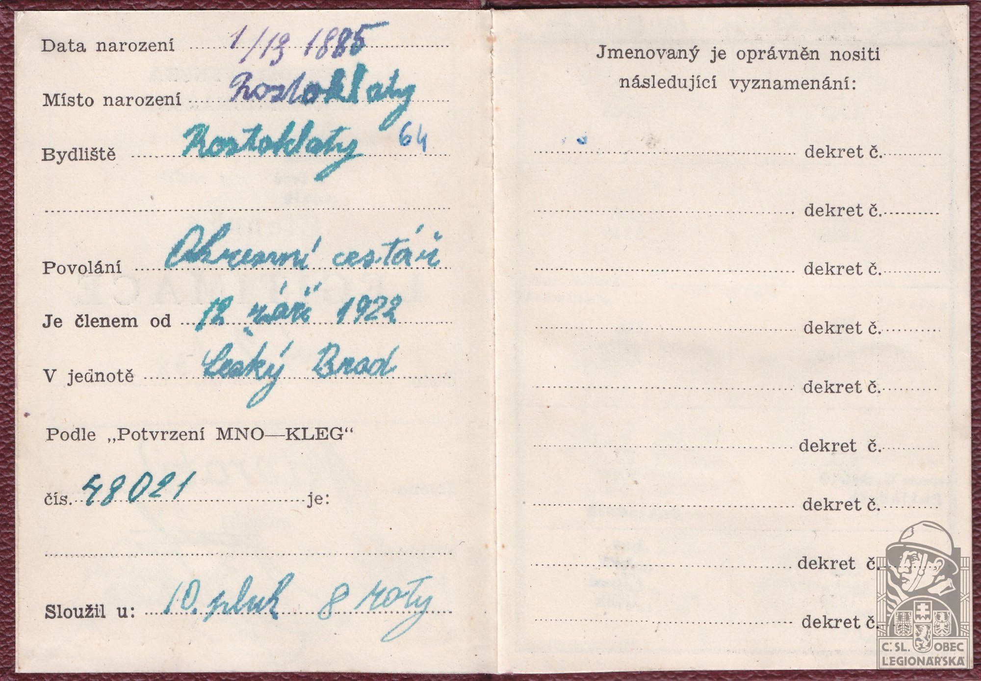 Zdroj informací: legionářský poslužný spis osobní karta legionáře