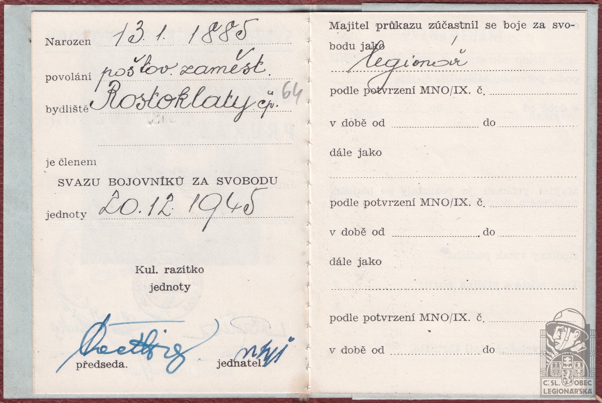 dokumenty spojené s osobou legionáře