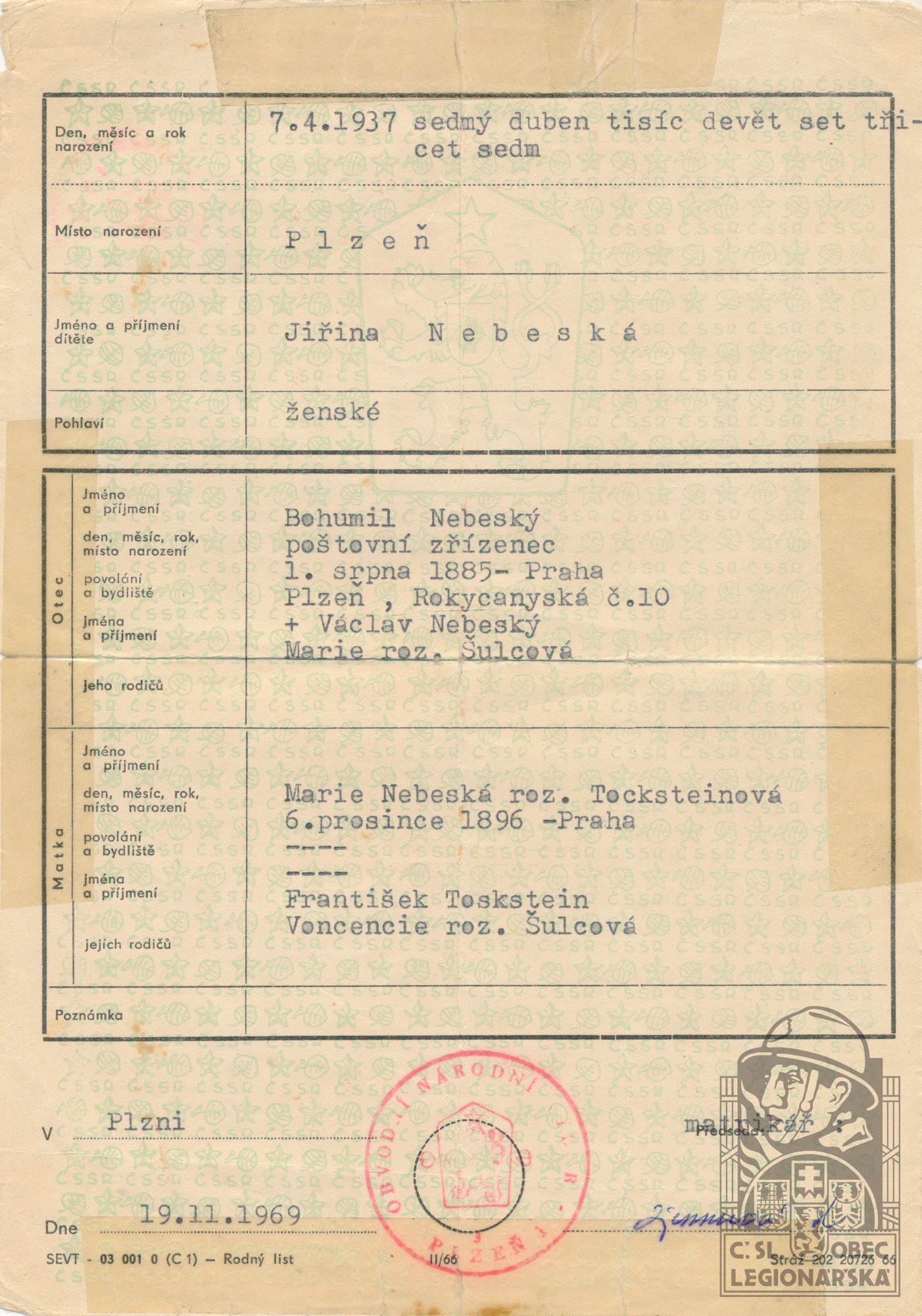 Zdroj informací: legionářský poslužný spis osobní karta legionáře