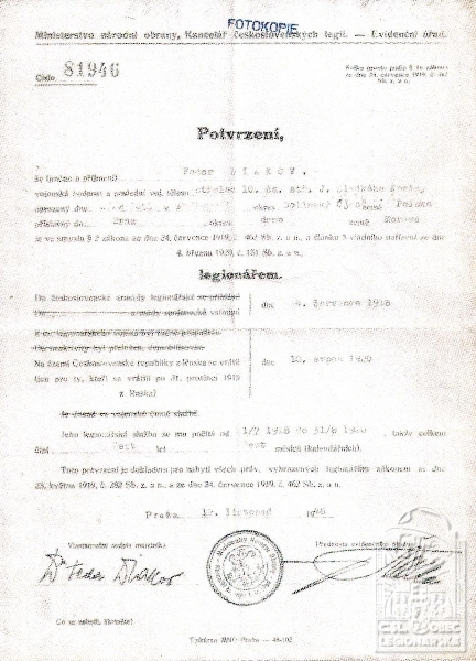 dokumenty spojené s osobou legionáře