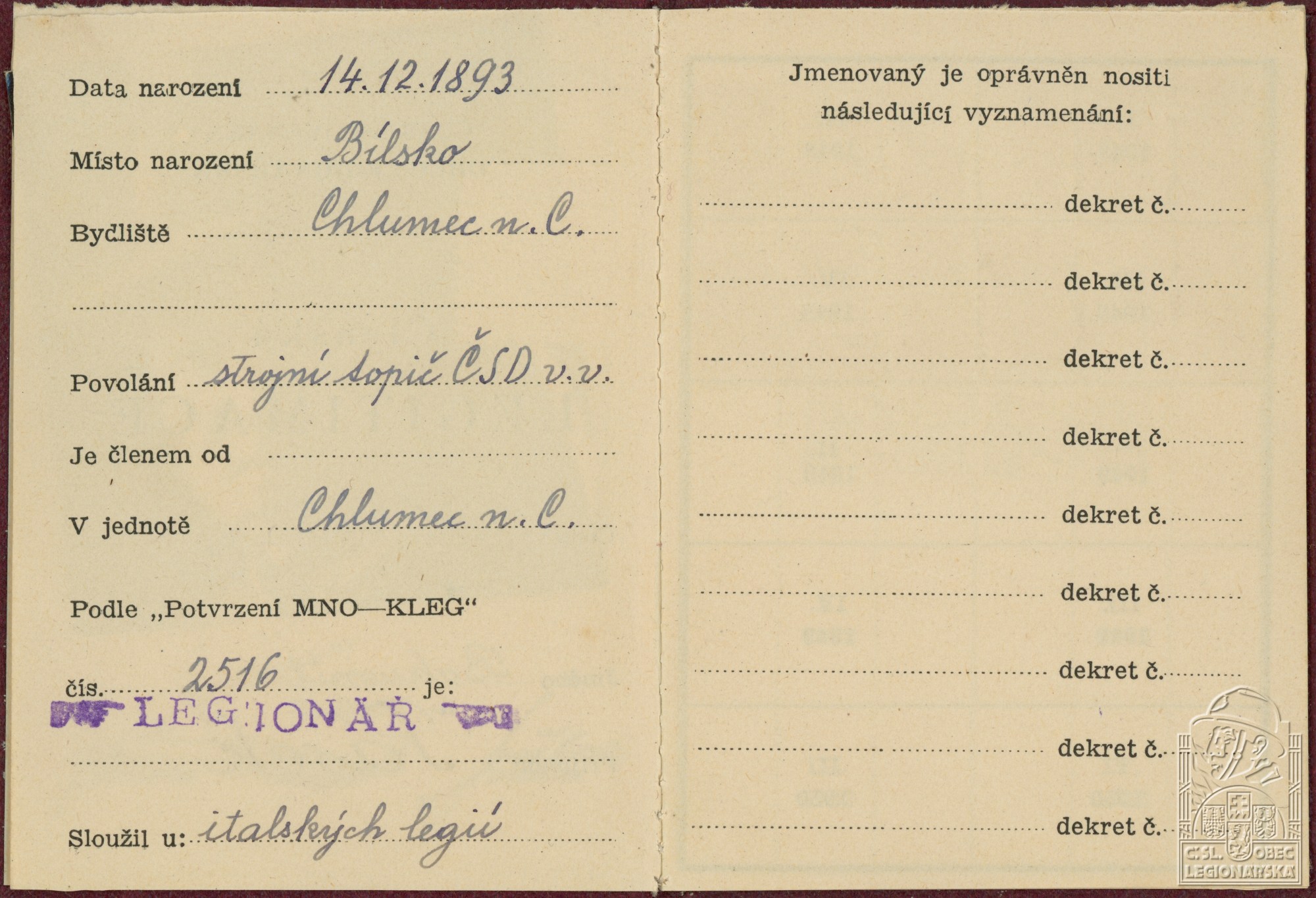 Zdroj informací: legionářský poslužný spis osobní karta legionáře