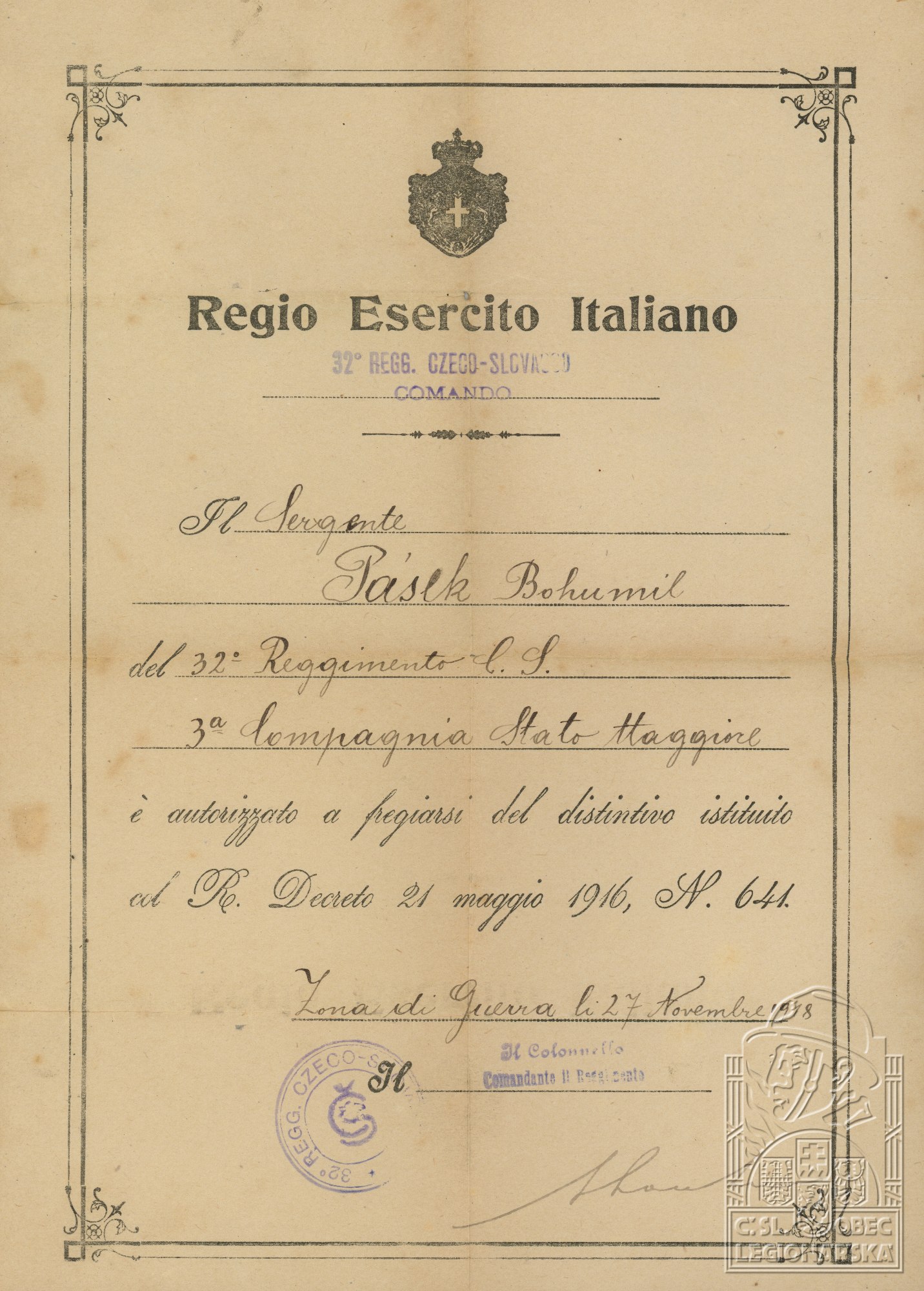 Jednotka v době zařazení:32.stř.pl. ( Čs. legie v Itálii )