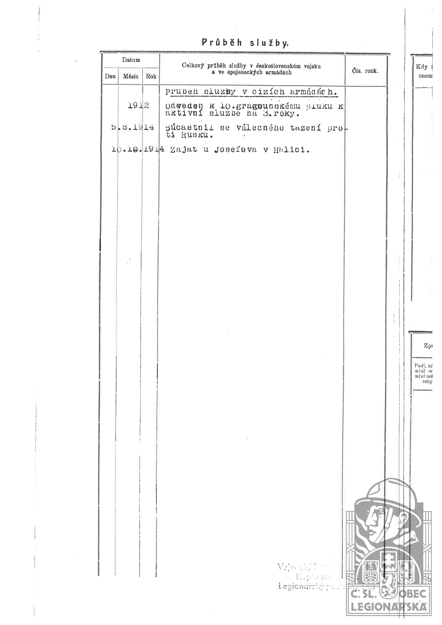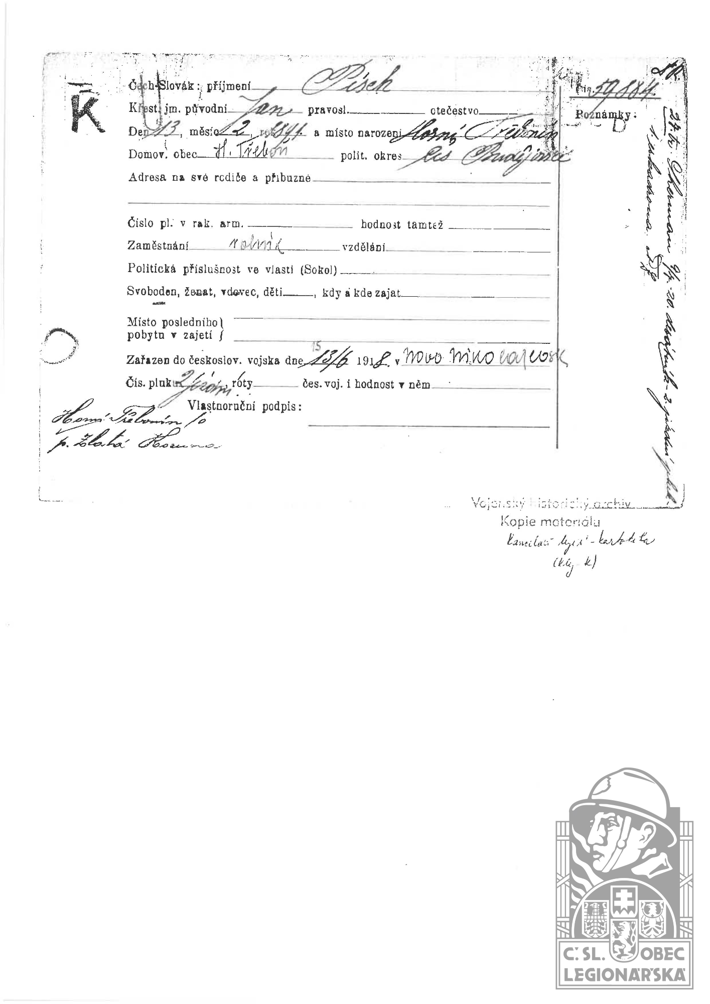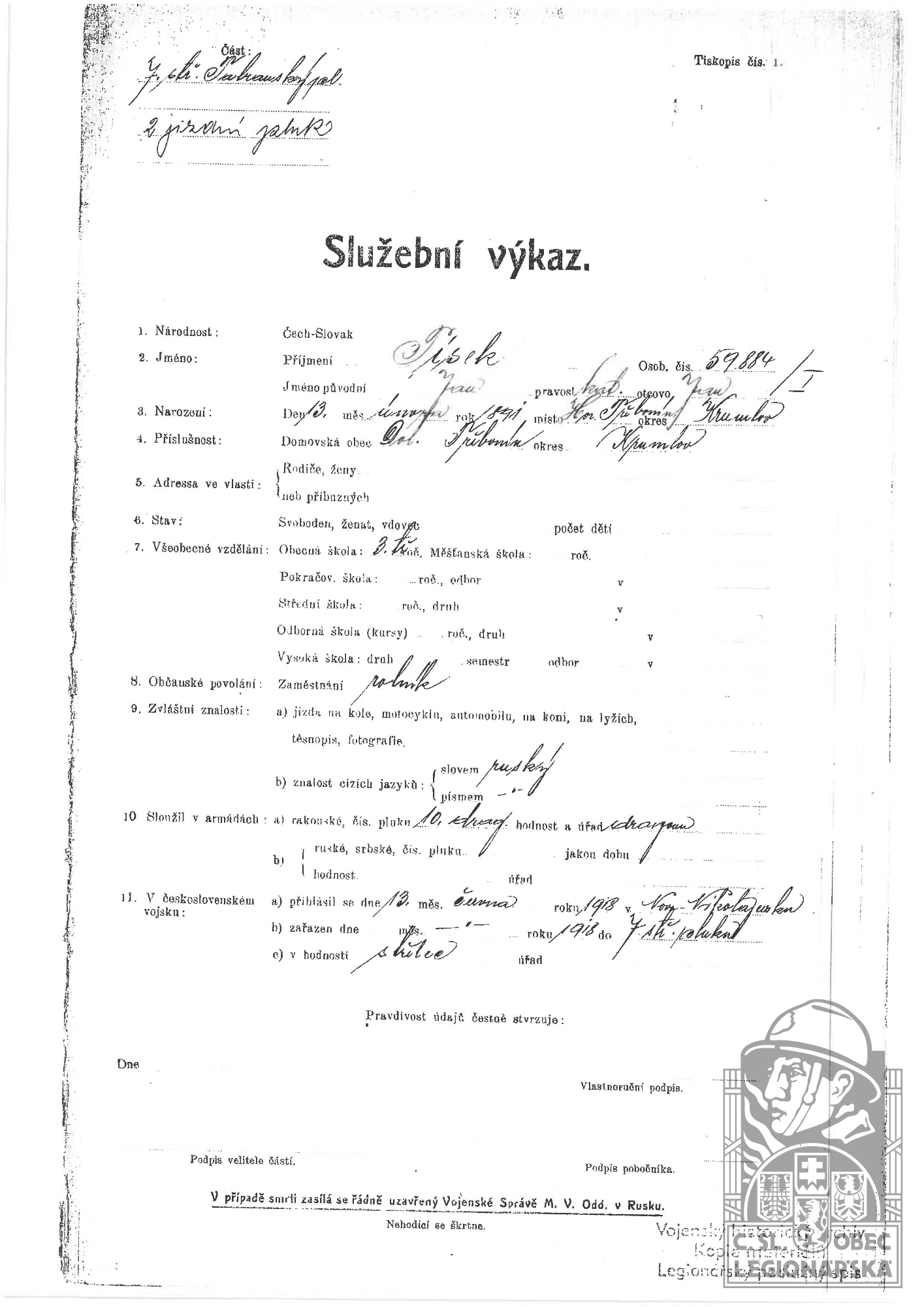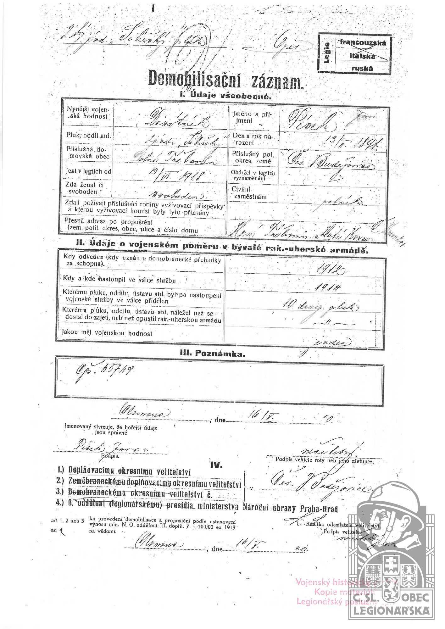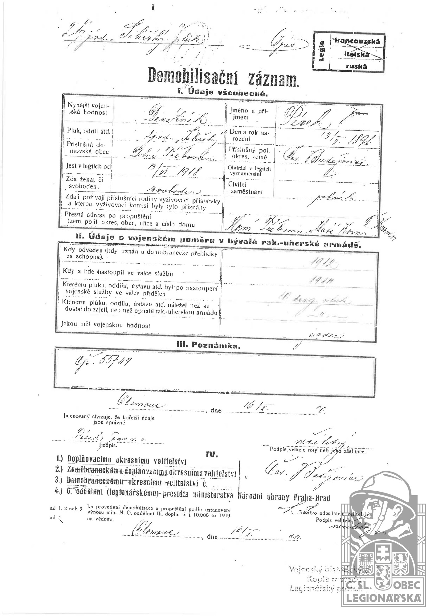 Zdroj informací: legionářský poslužný spis osobní karta legionáře rodinný archiv
