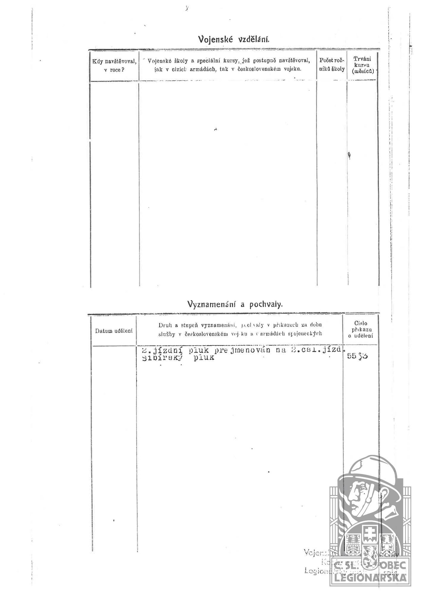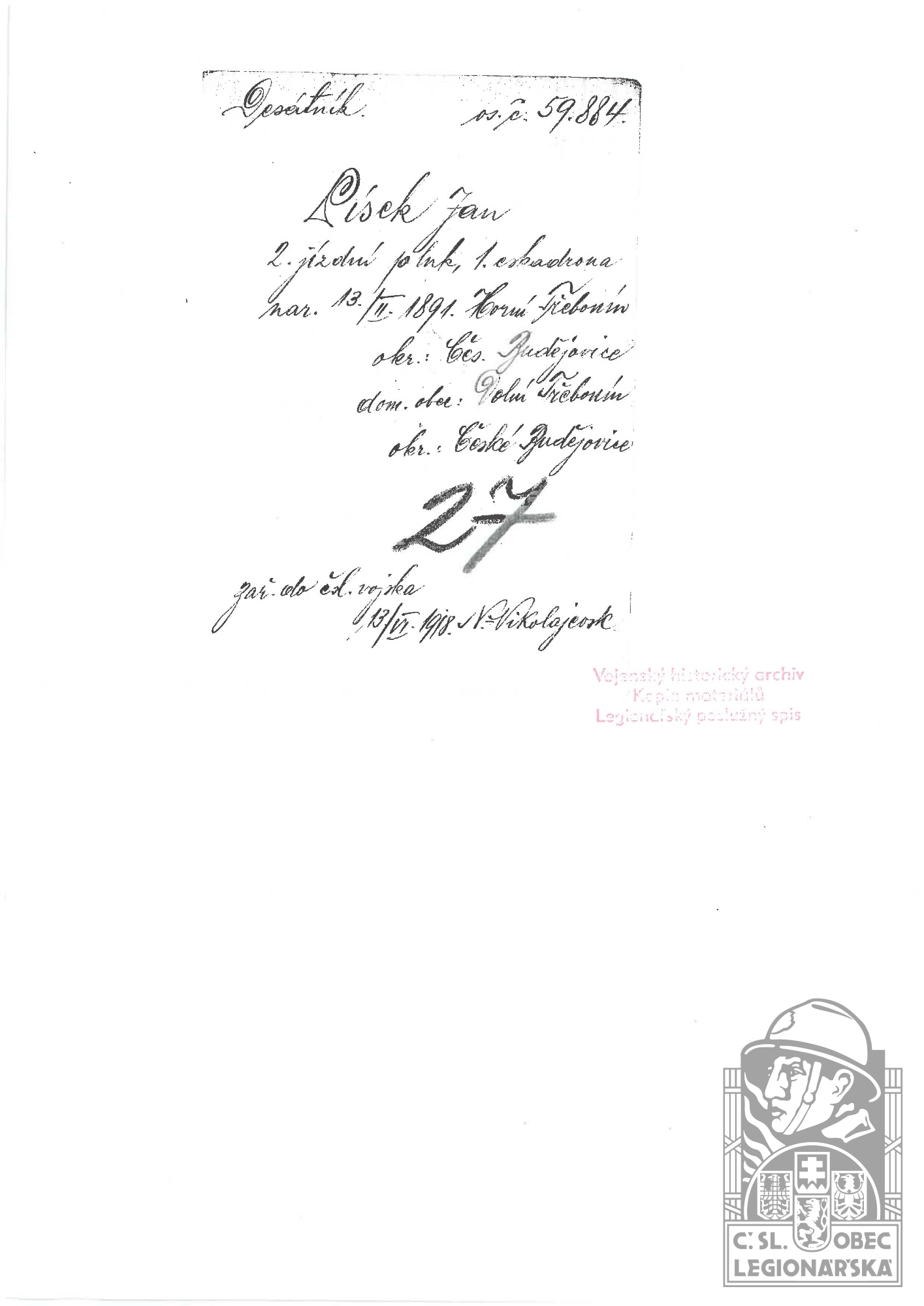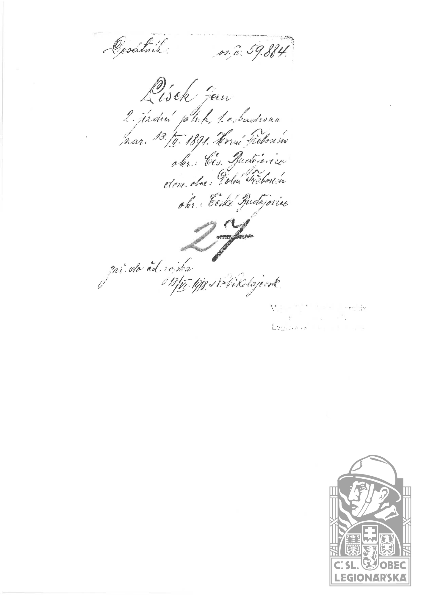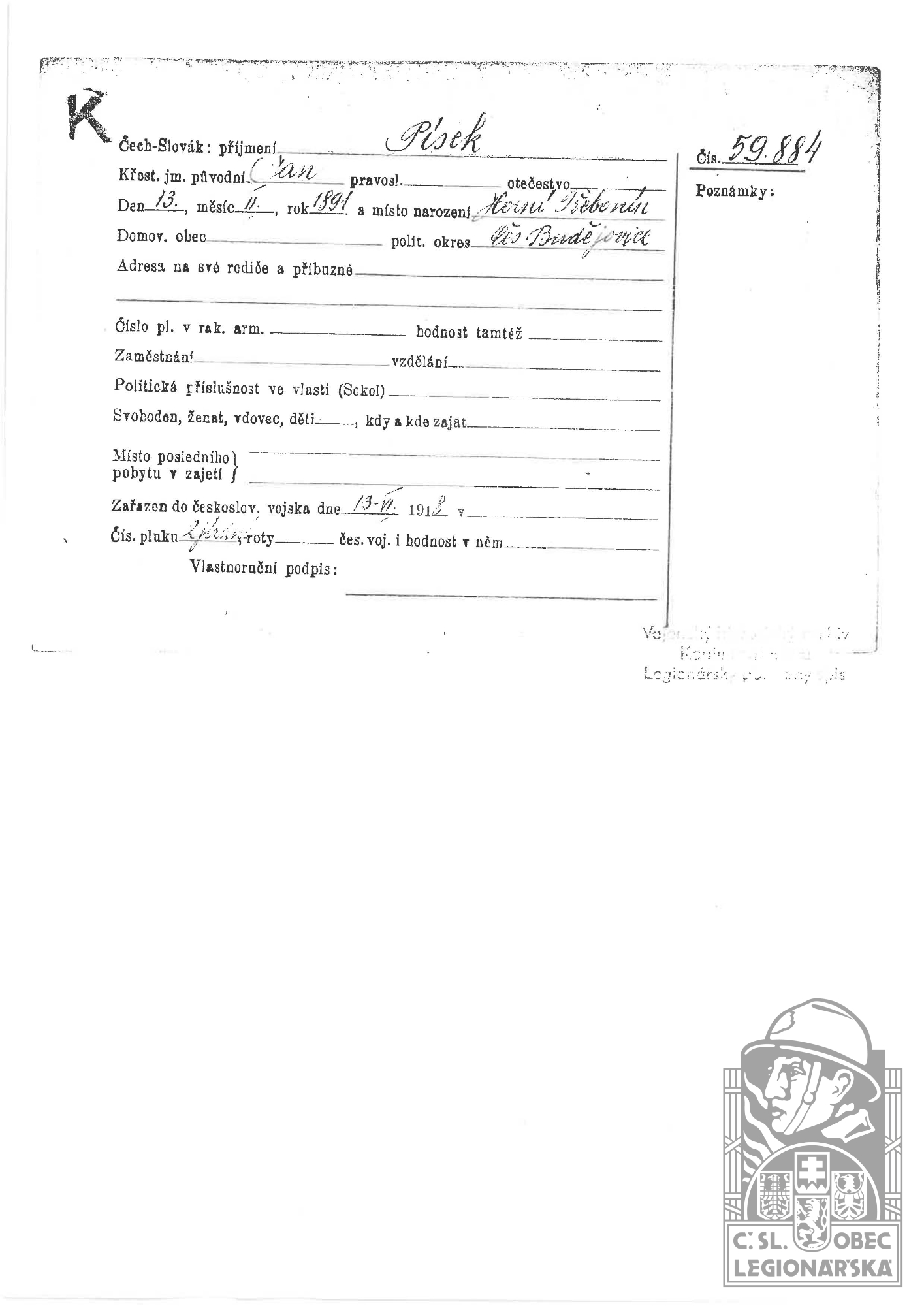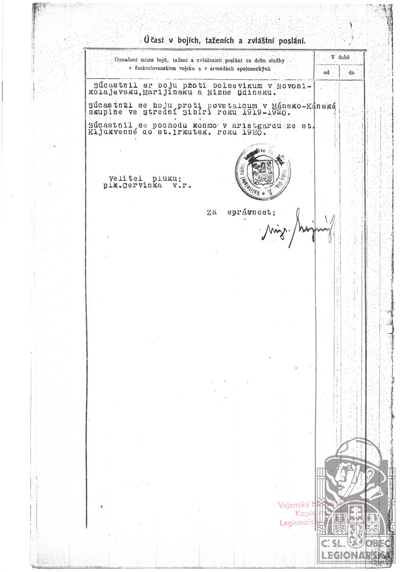 Zdroj informací: legionářský poslužný spis osobní karta legionáře rodinný archiv