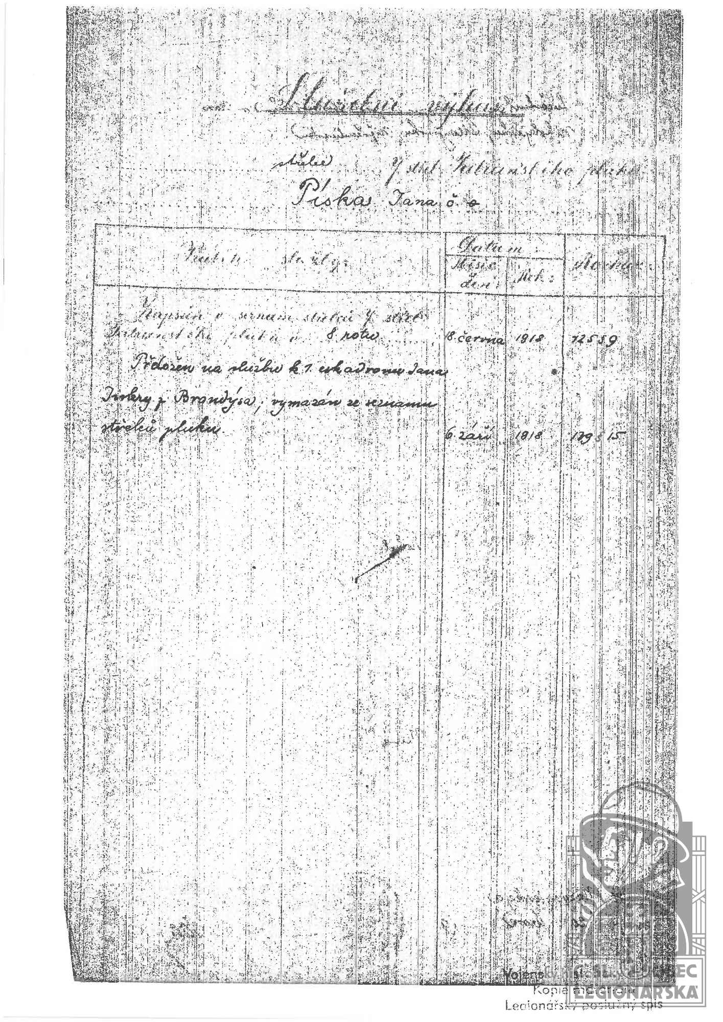 Datum zařazení do legií:15.6.1918
