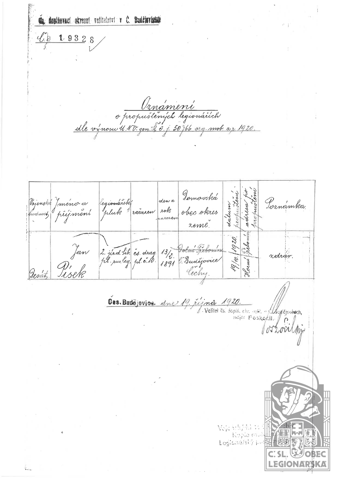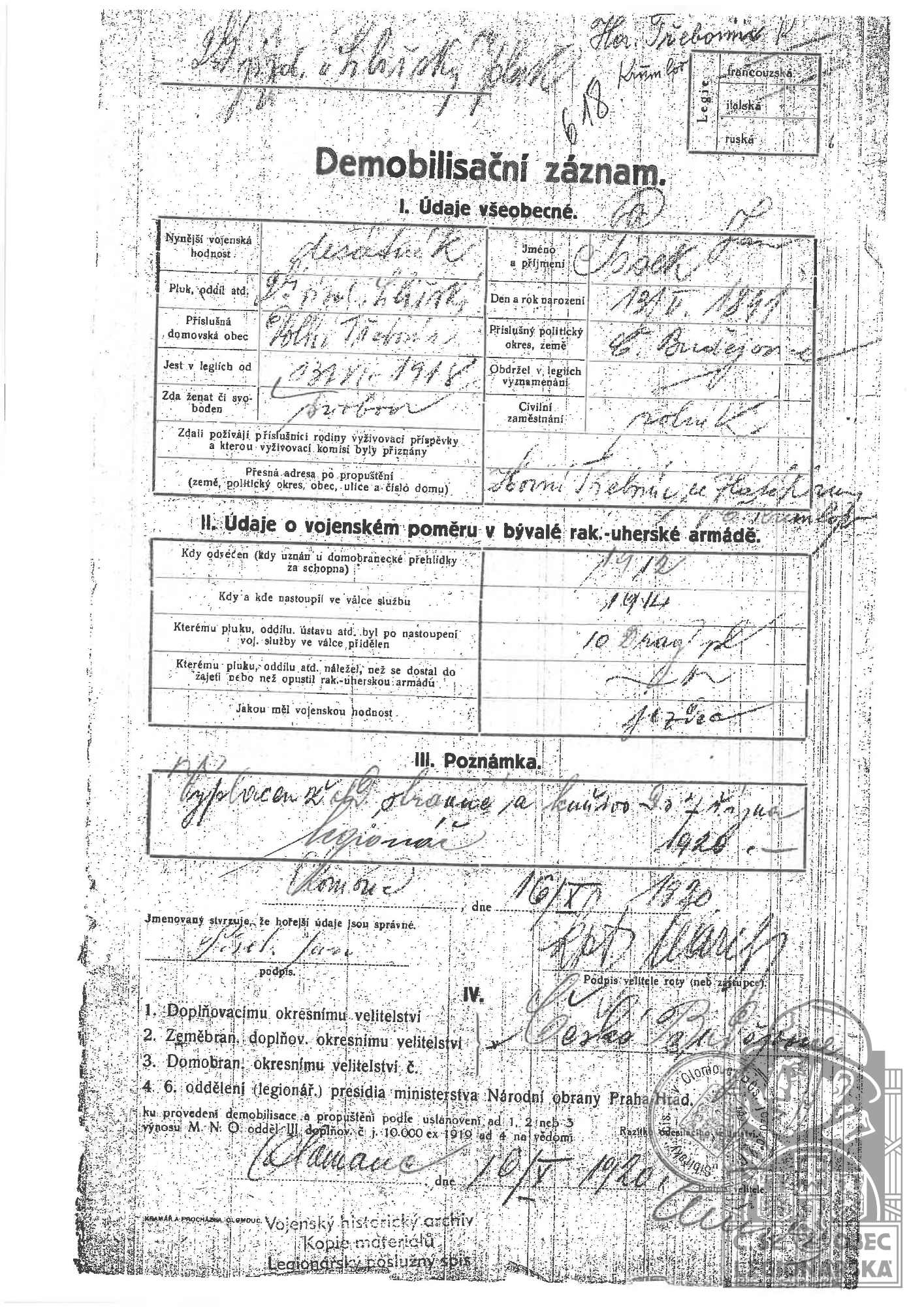 Konec v legiích:19.10.1920 ( Demobilizován )