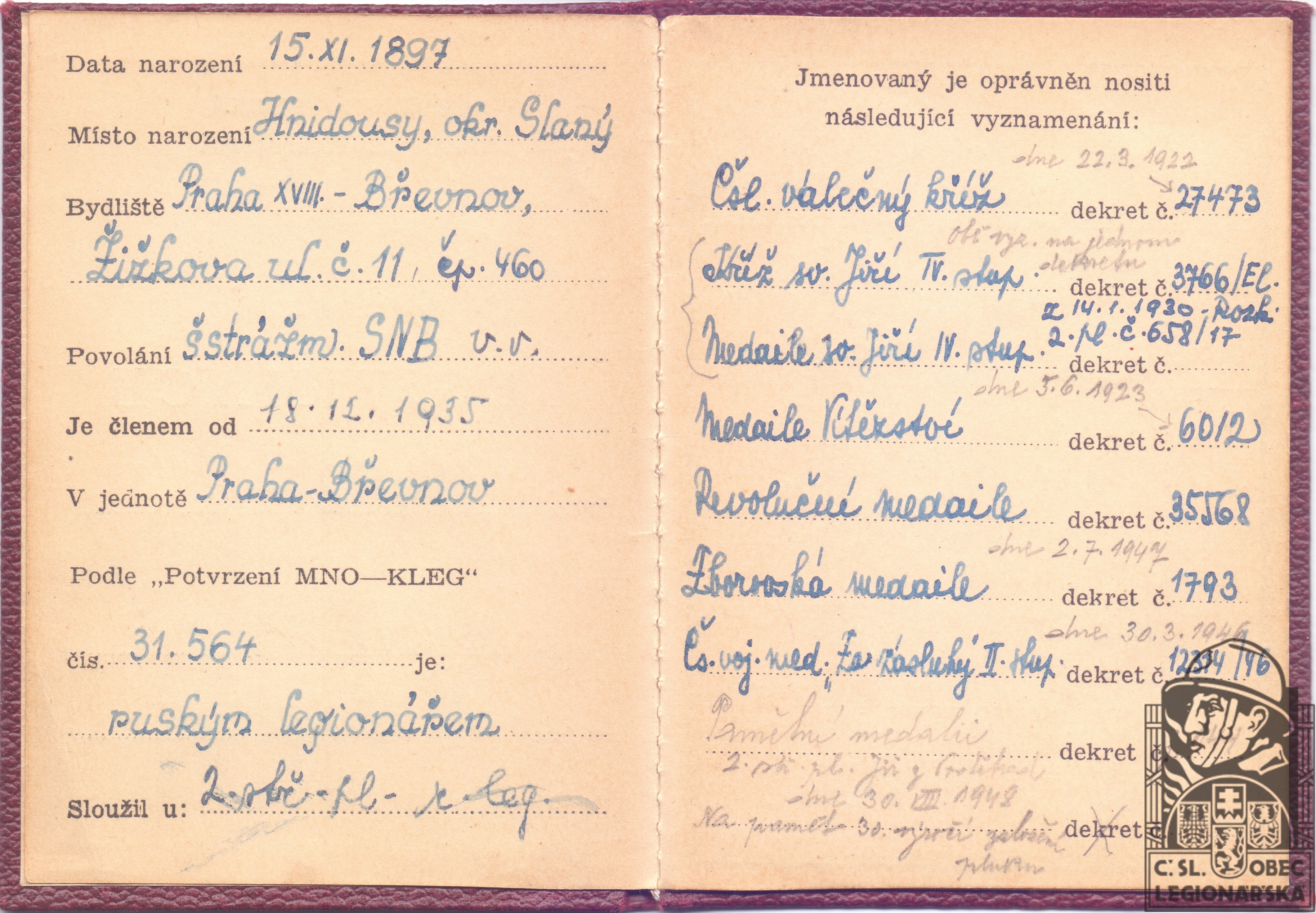 Zdroj informací: legionářský poslužný spis osobní karta legionáře