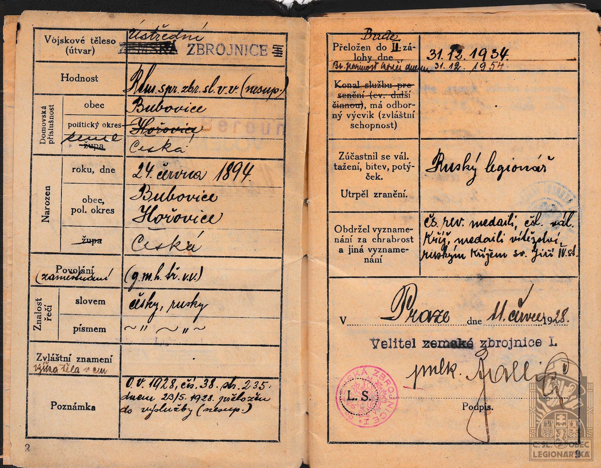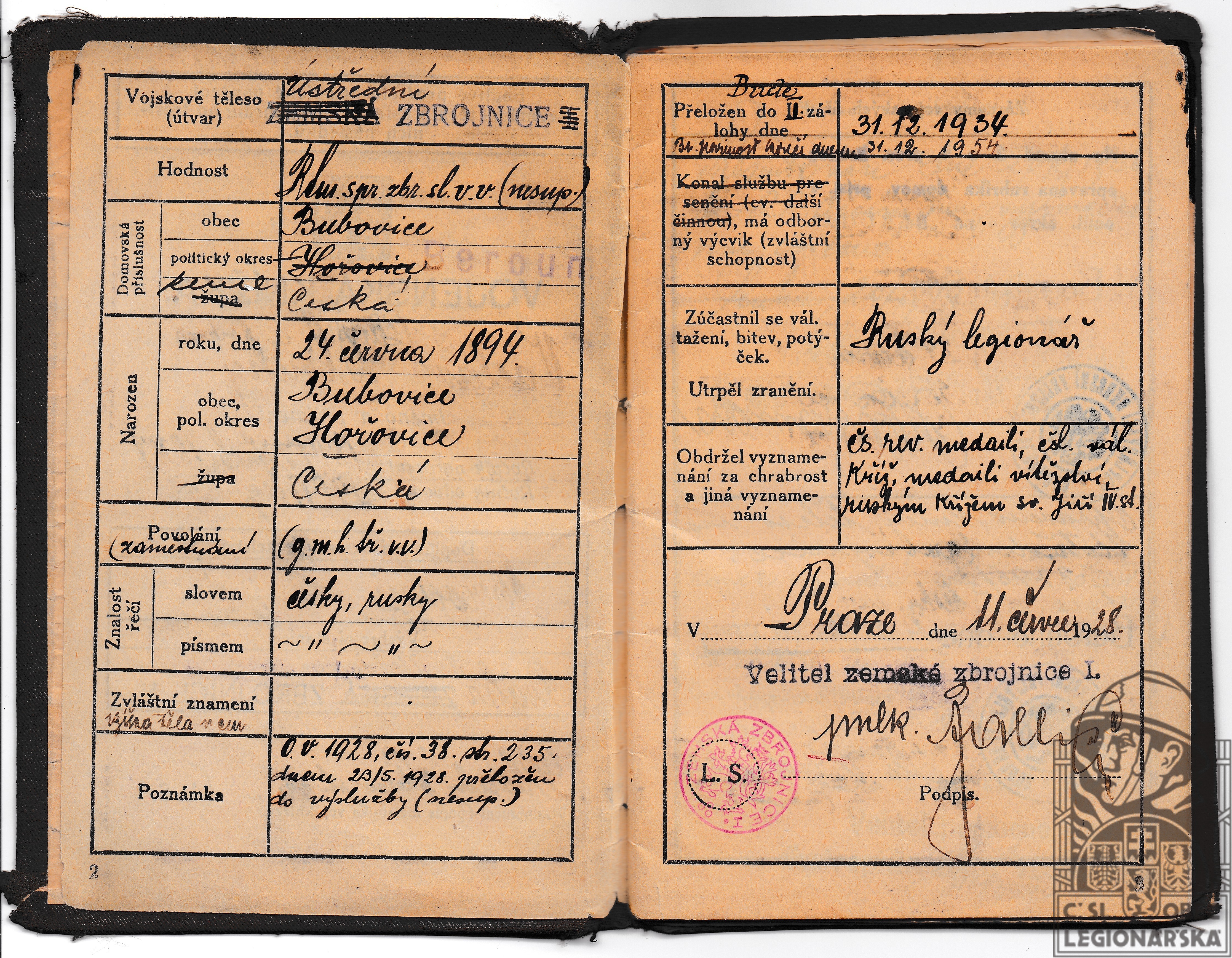 Zdroj informací: legionářský poslužný spis osobní karta legionáře