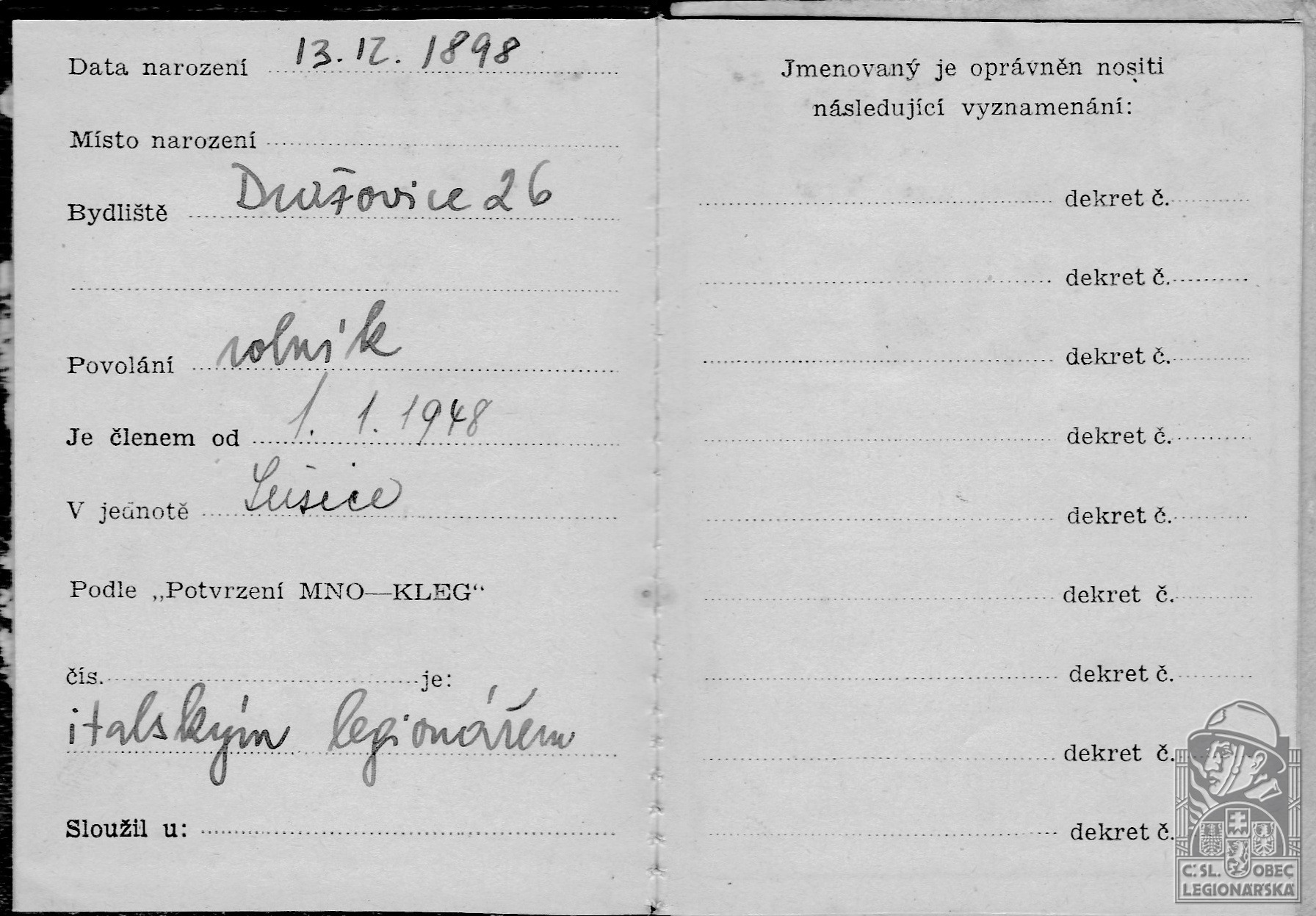 Zdroj informací: legionářský poslužný spis osobní karta legionáře