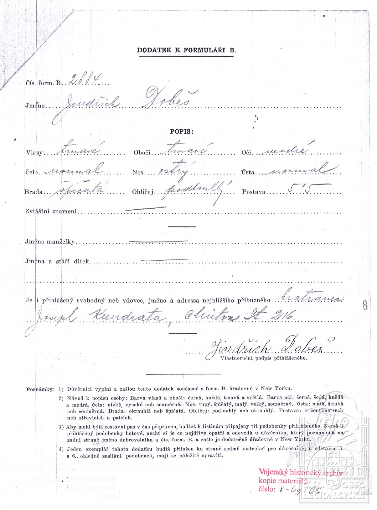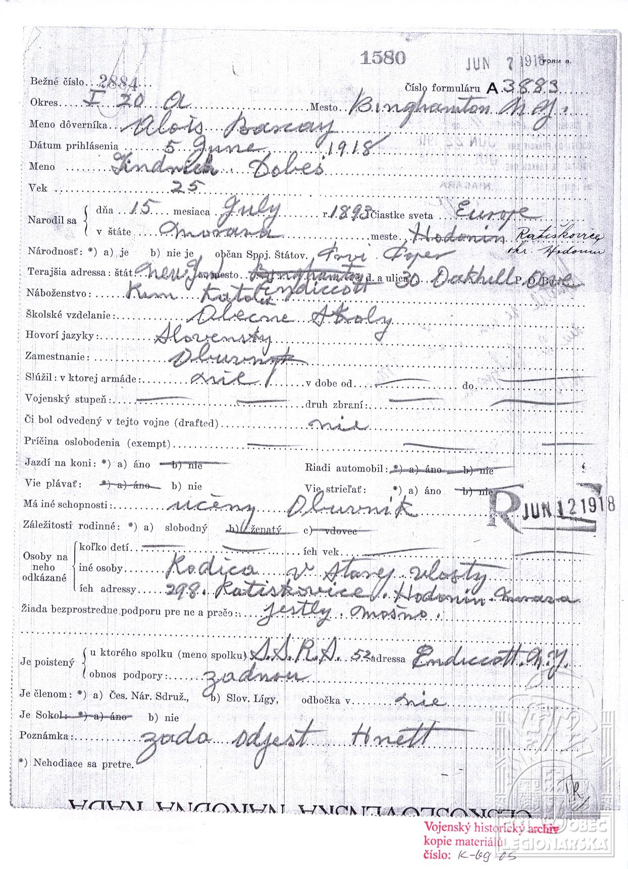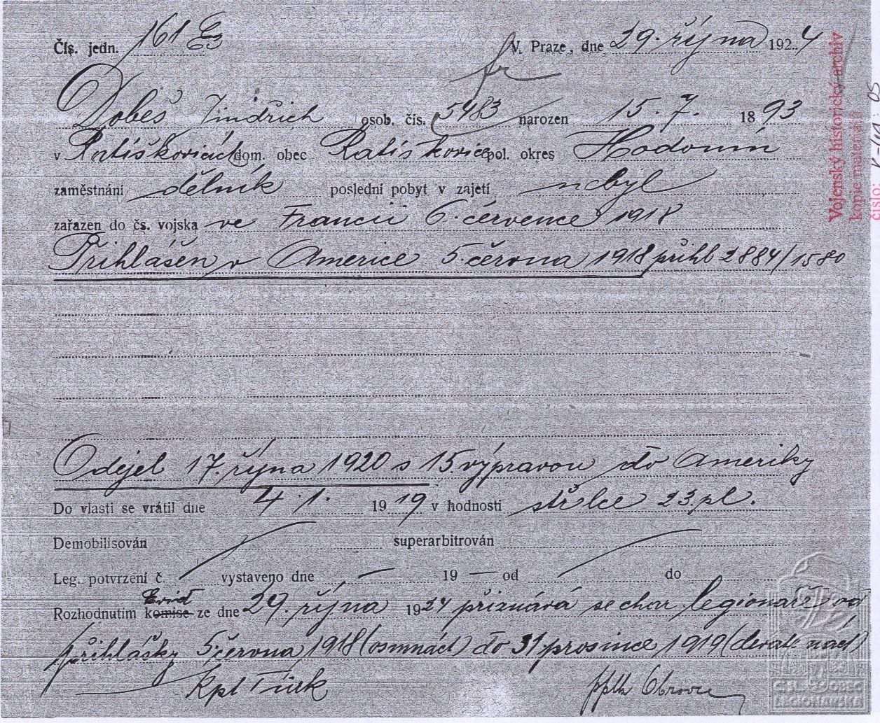 Datum podání přihlášky do legií:5.6.1918
