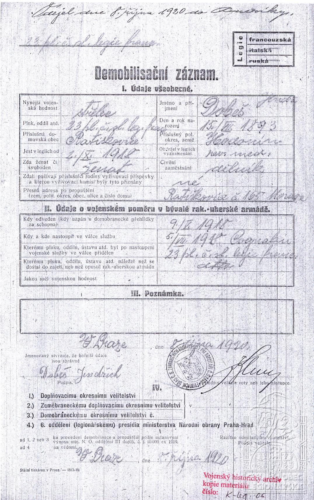 Konec v legiích:8.10.1920 ( Viz poznámku )