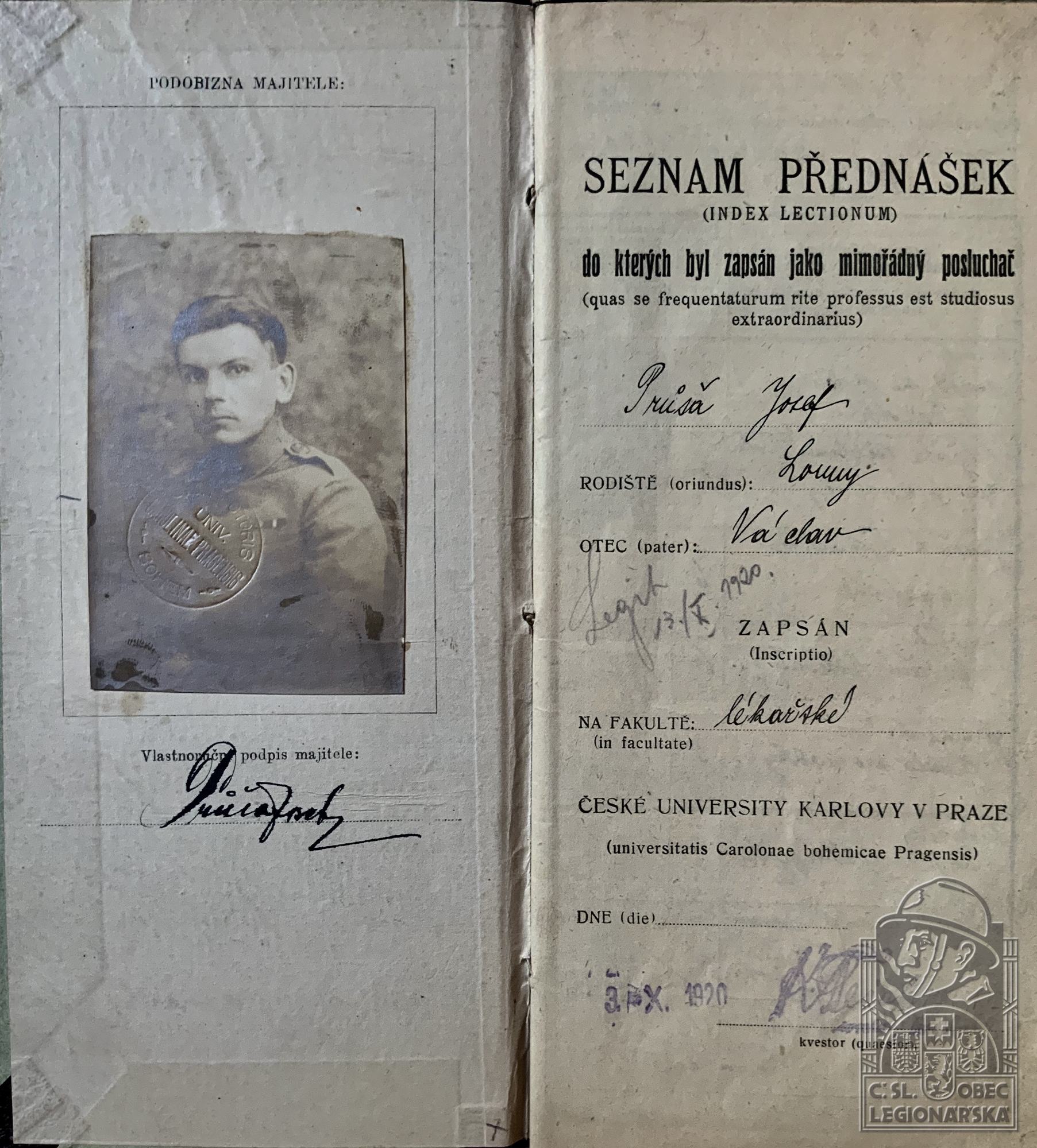 Zdroj informací: legionářský poslužný spis osobní karta legionáře