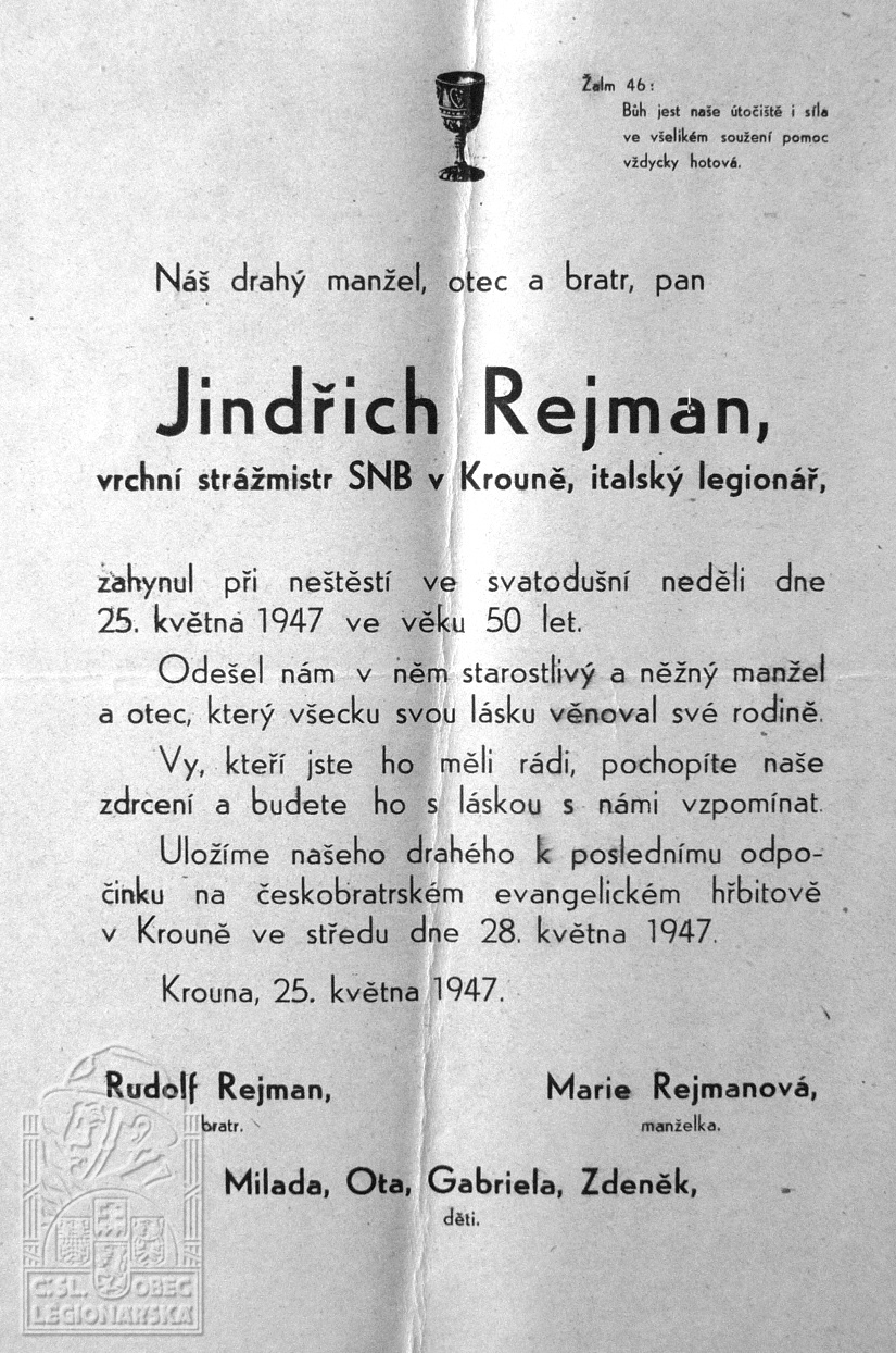 Životopis:Jindřich Rejman po skončení první světové války sloužil u četnictva. Službu v obci Krouna nastoupil 11.7.1939 po repatriaci ze Slovenska a 30.5.1942 byl jako legionář dán do výslužby. Dobrovolně nastoupil službu 7.5.1945 a účastnil se revolučních událostí. Zemřel 25.5.1947 v nemocnici v Poličce po vážné nehodě na soukromém motocyklu. Pohřben je v Krouně. (Dle dopisu badatele Ondřeje Červeného.)