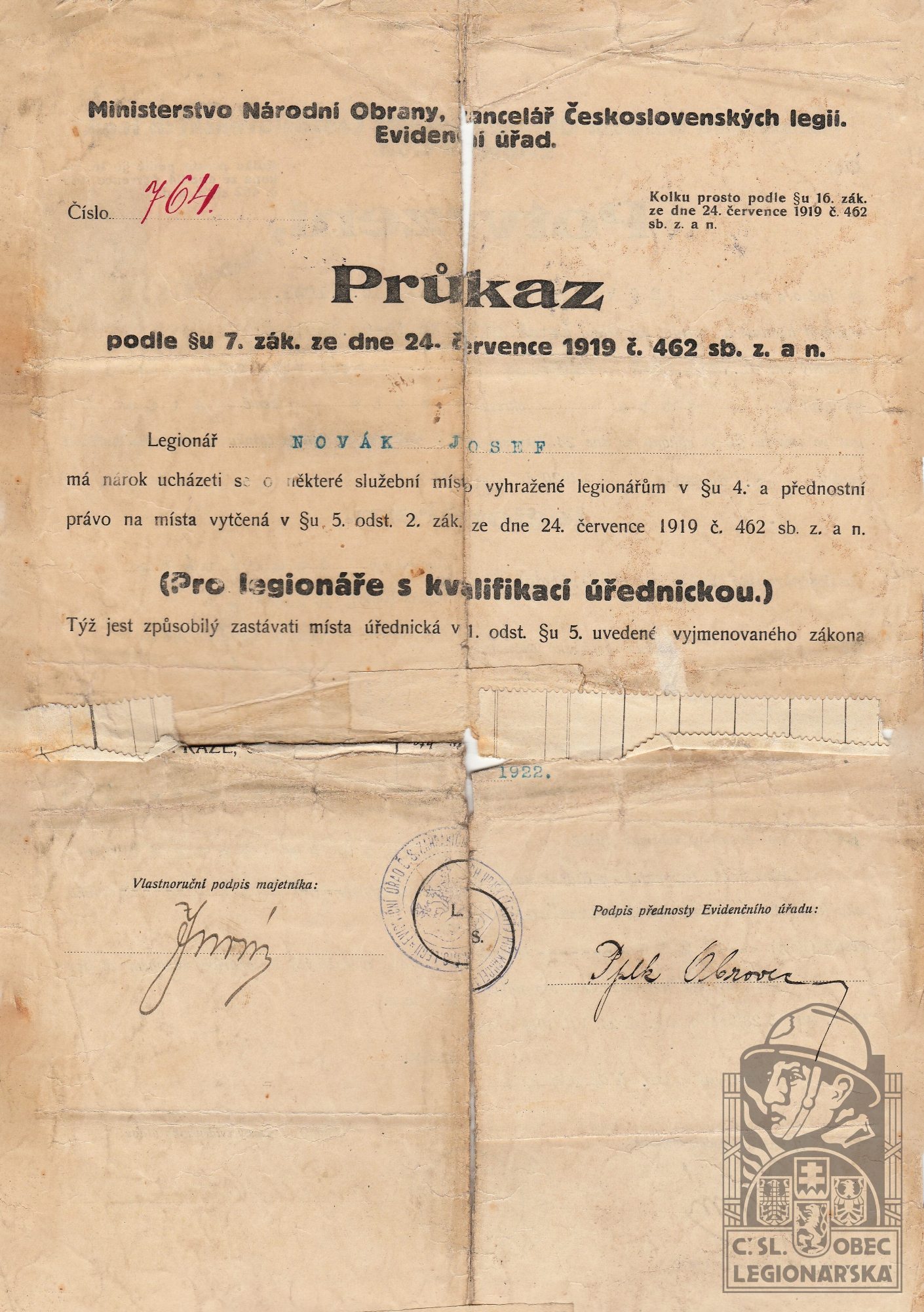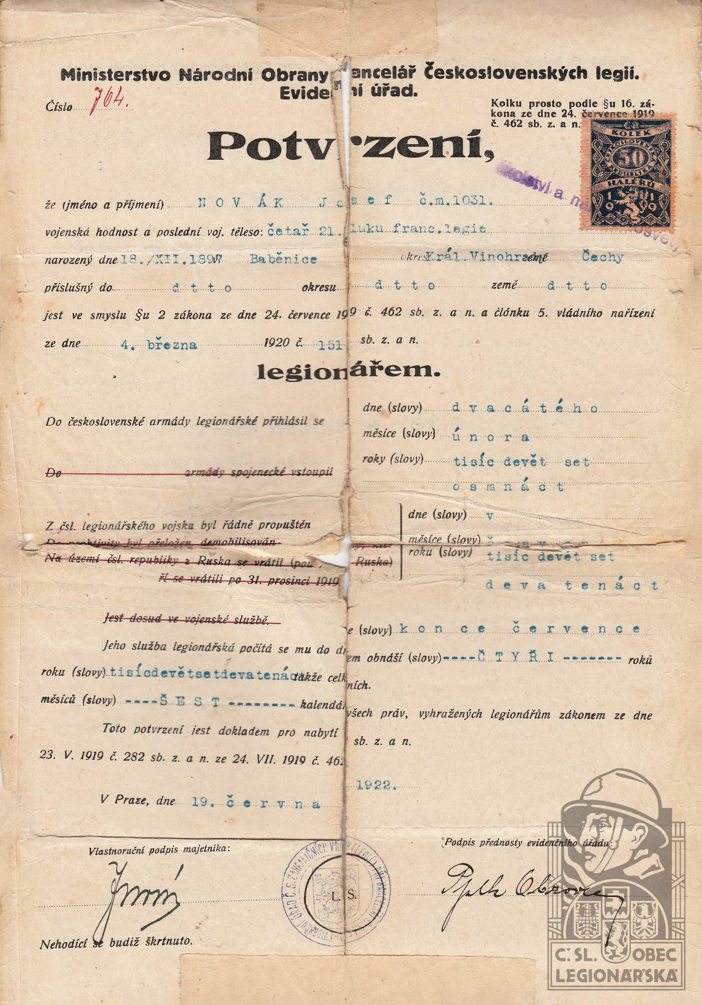 Datum podání přihlášky do legií:20.2.1918