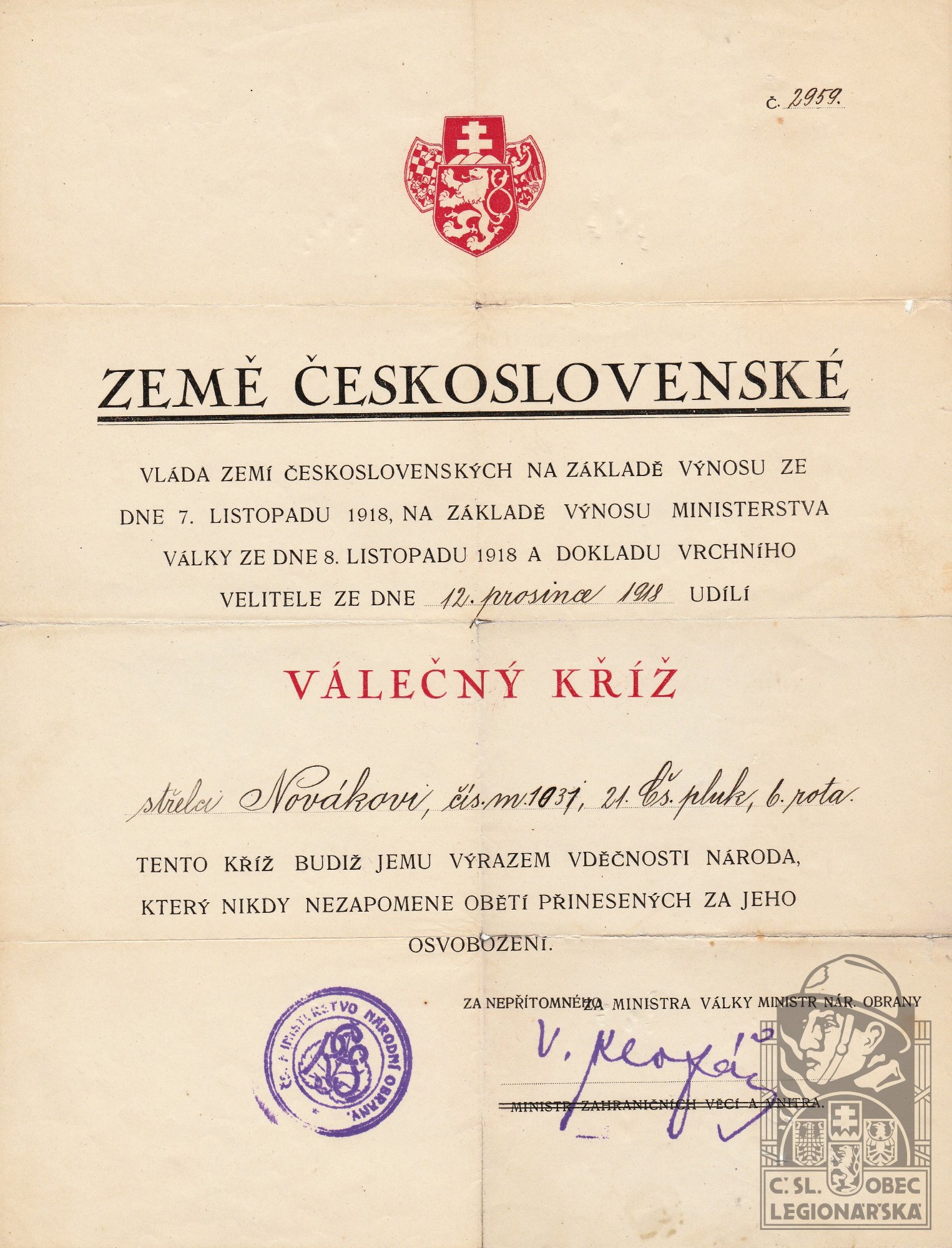 Jednotka v době zařazení:21.stř.pl. ( Čs. legie v Francii )