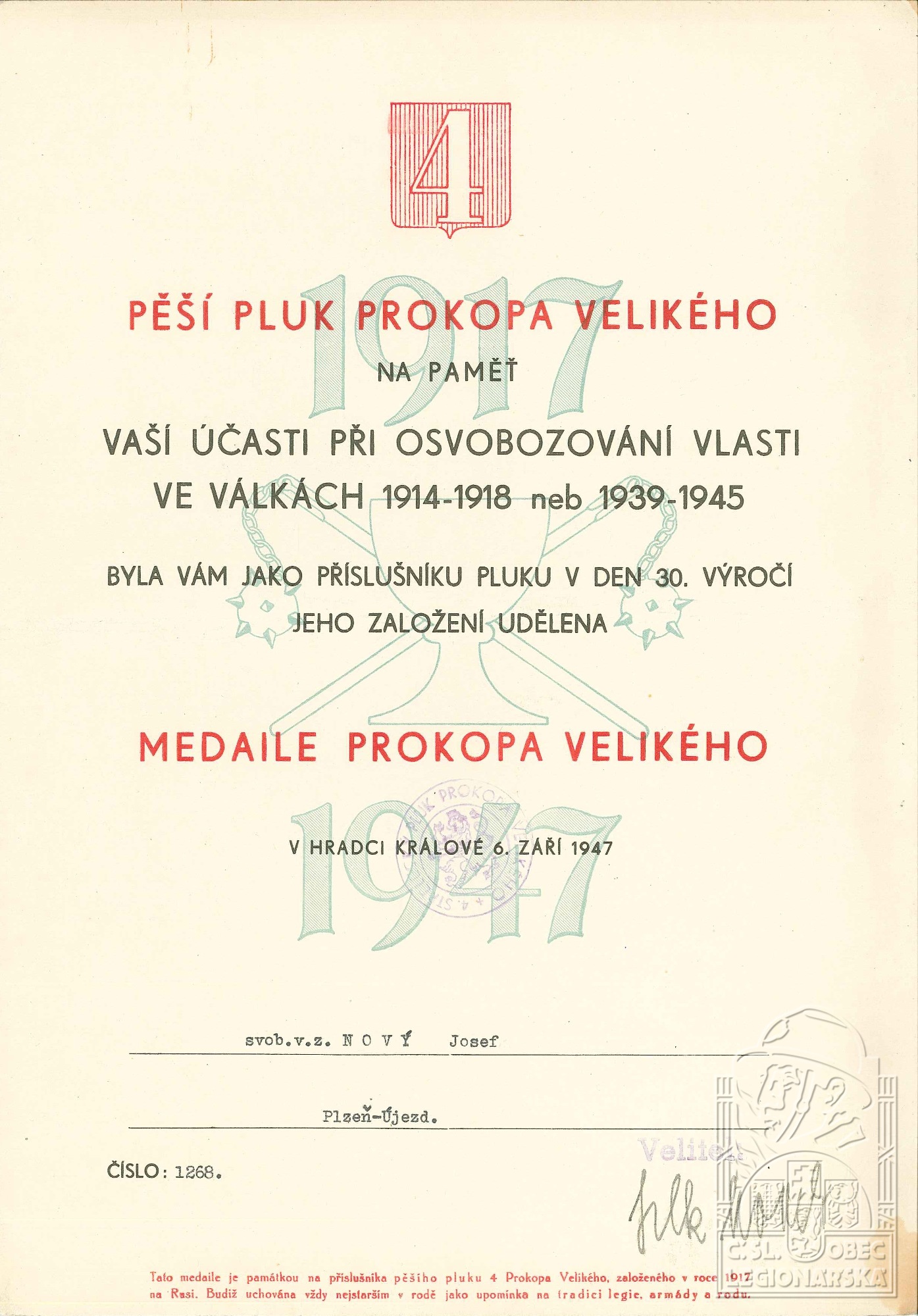 Jednotka v době zařazení:4.stř.pl. ( Čs. legie v Rusku )
