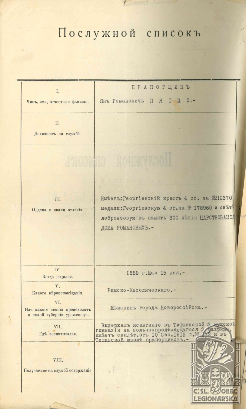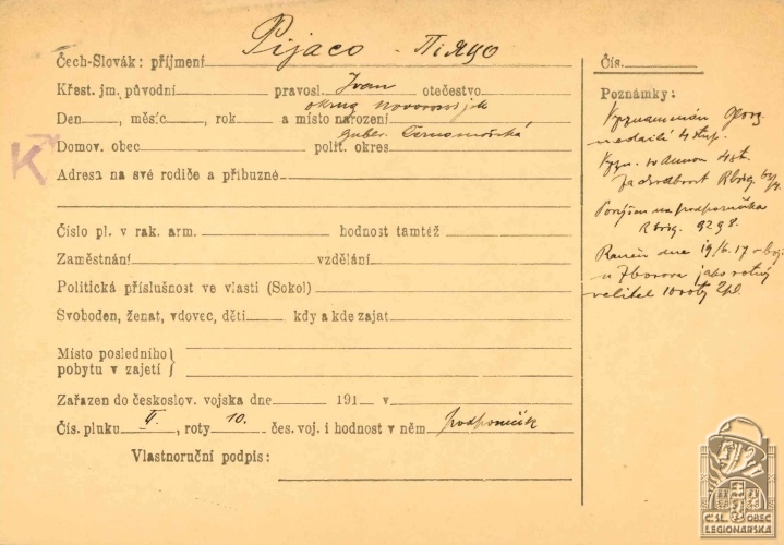 Zdroj informací: legionářský poslužný spis osobní karta legionáře
