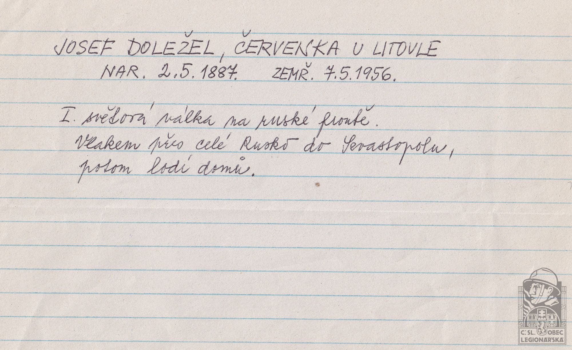 Zdroj informací: legionářský poslužný spis osobní karta legionáře