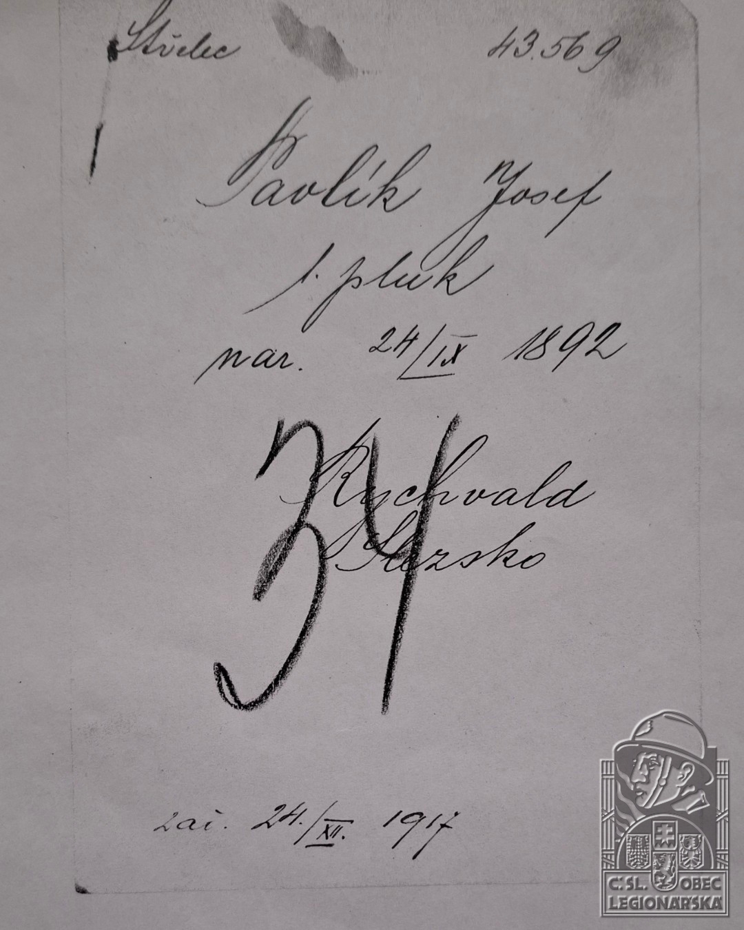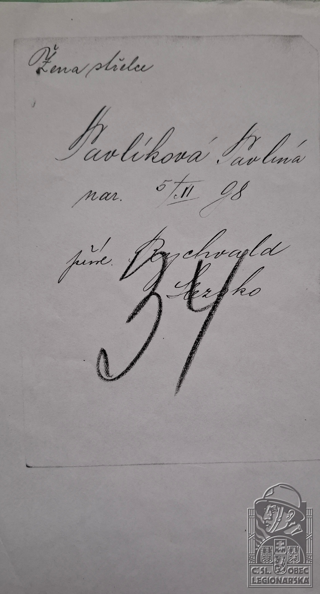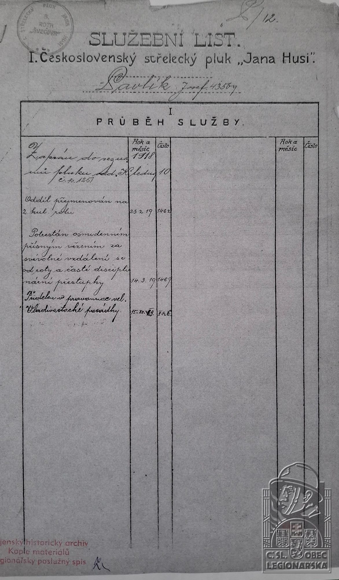 Zdroj informací: legionářský poslužný spis osobní karta legionáře