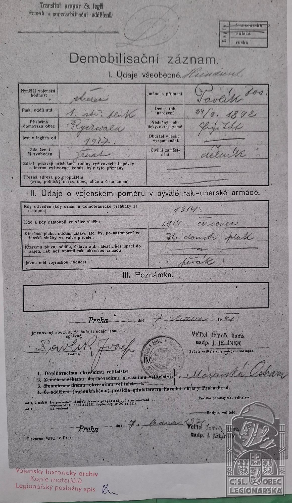 Konec v legiích:11.1.1921 ( Demobilizován )