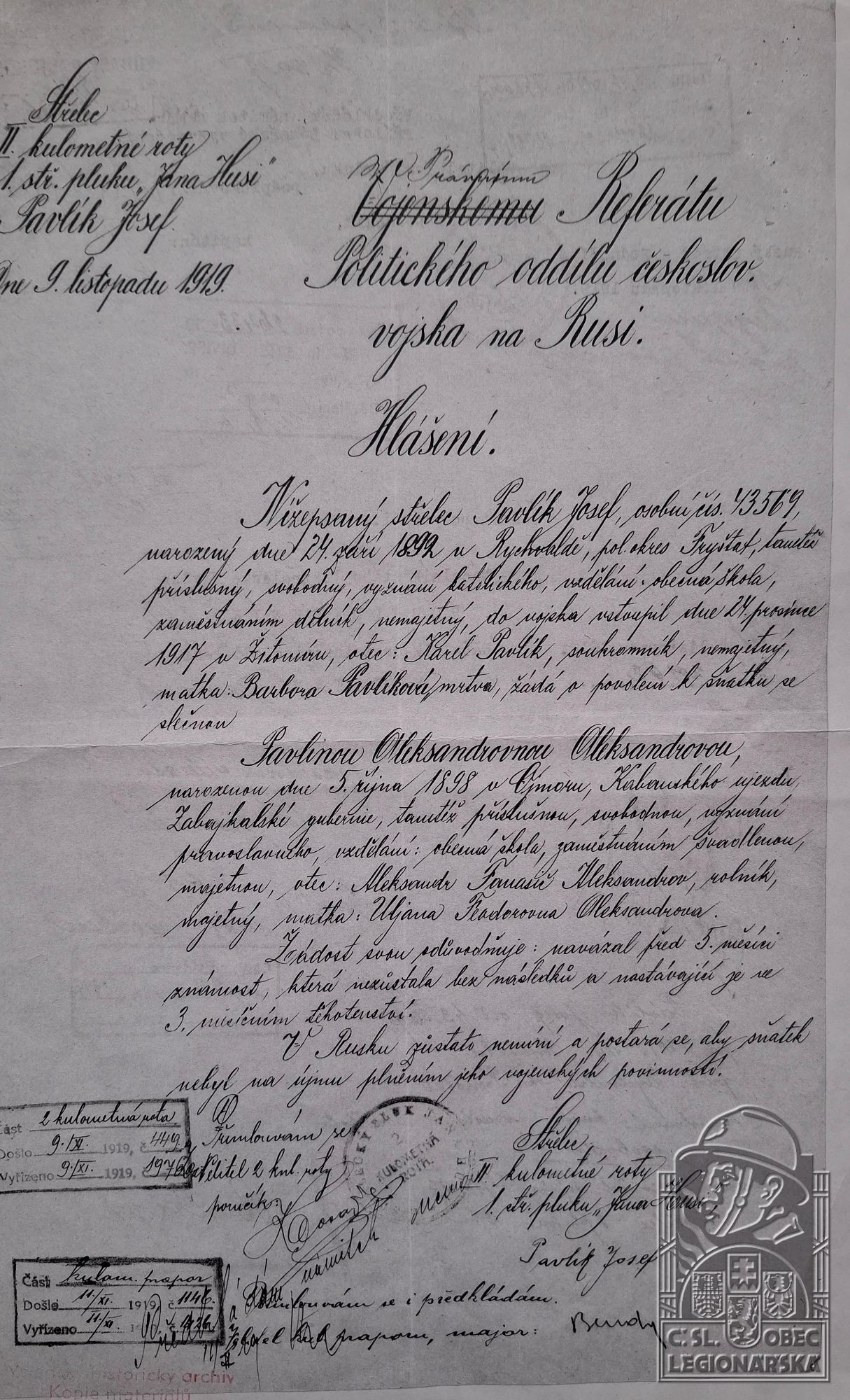 Misto podání přihlášky do legií:Běličevo, Chersonská gub.