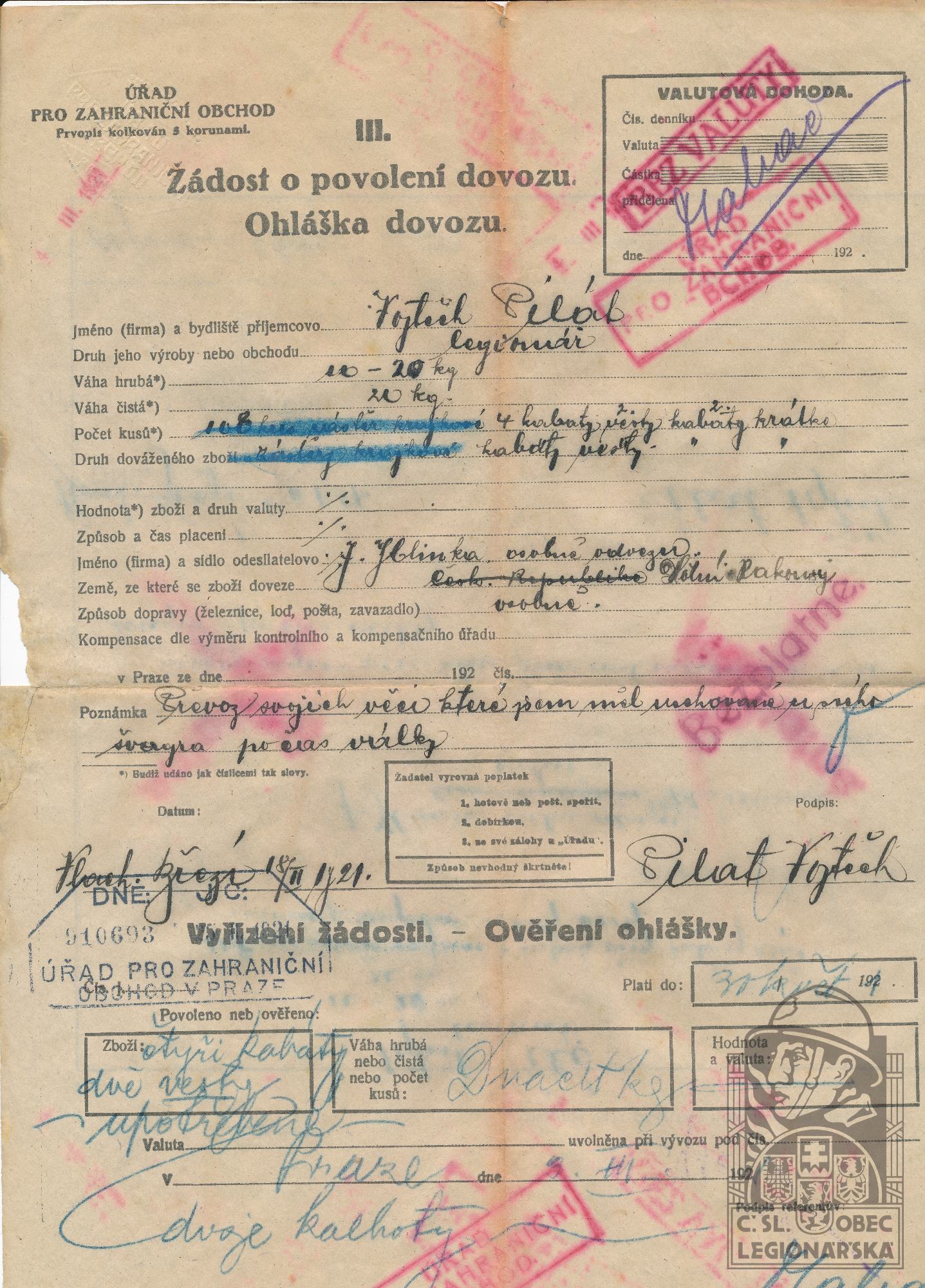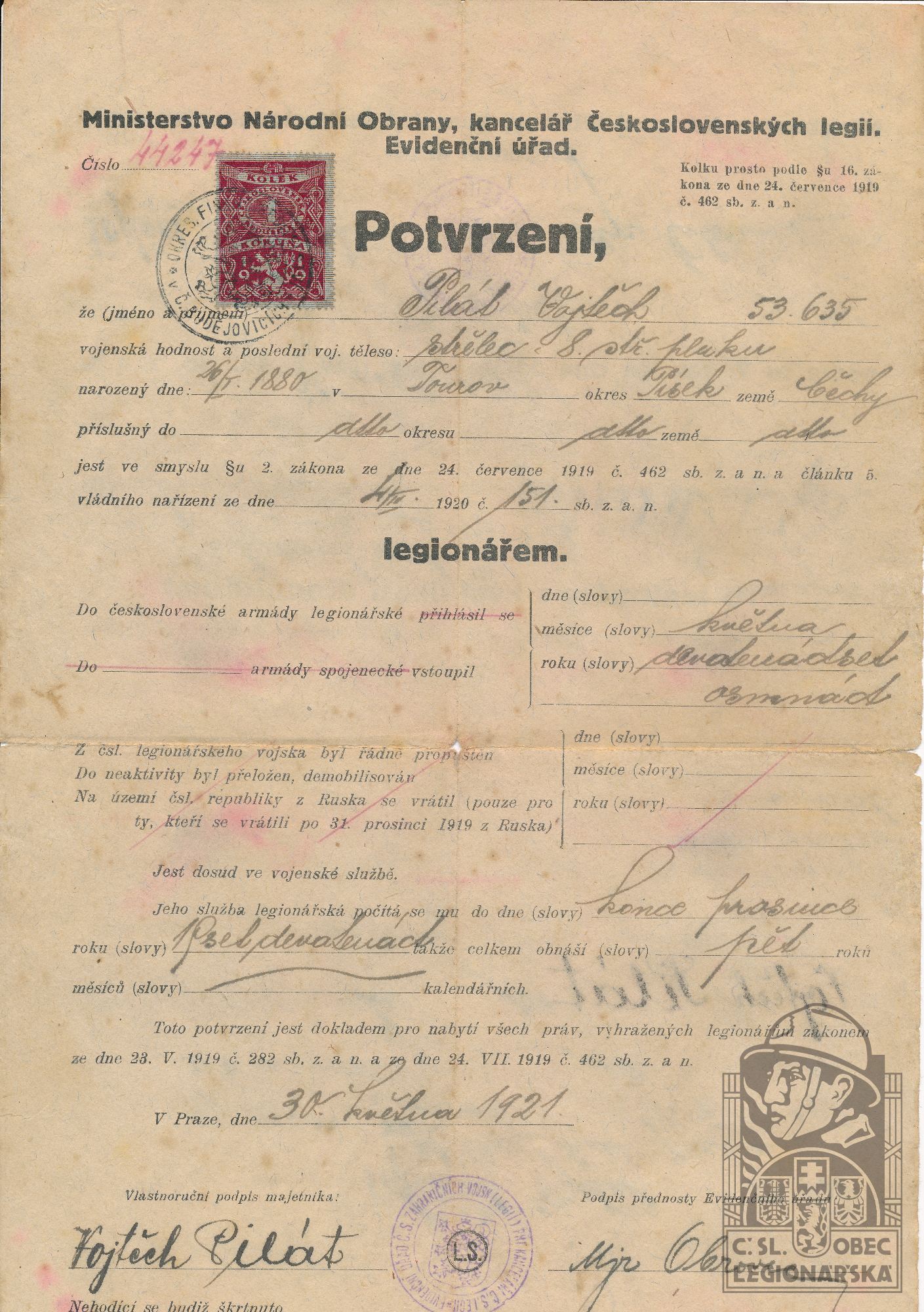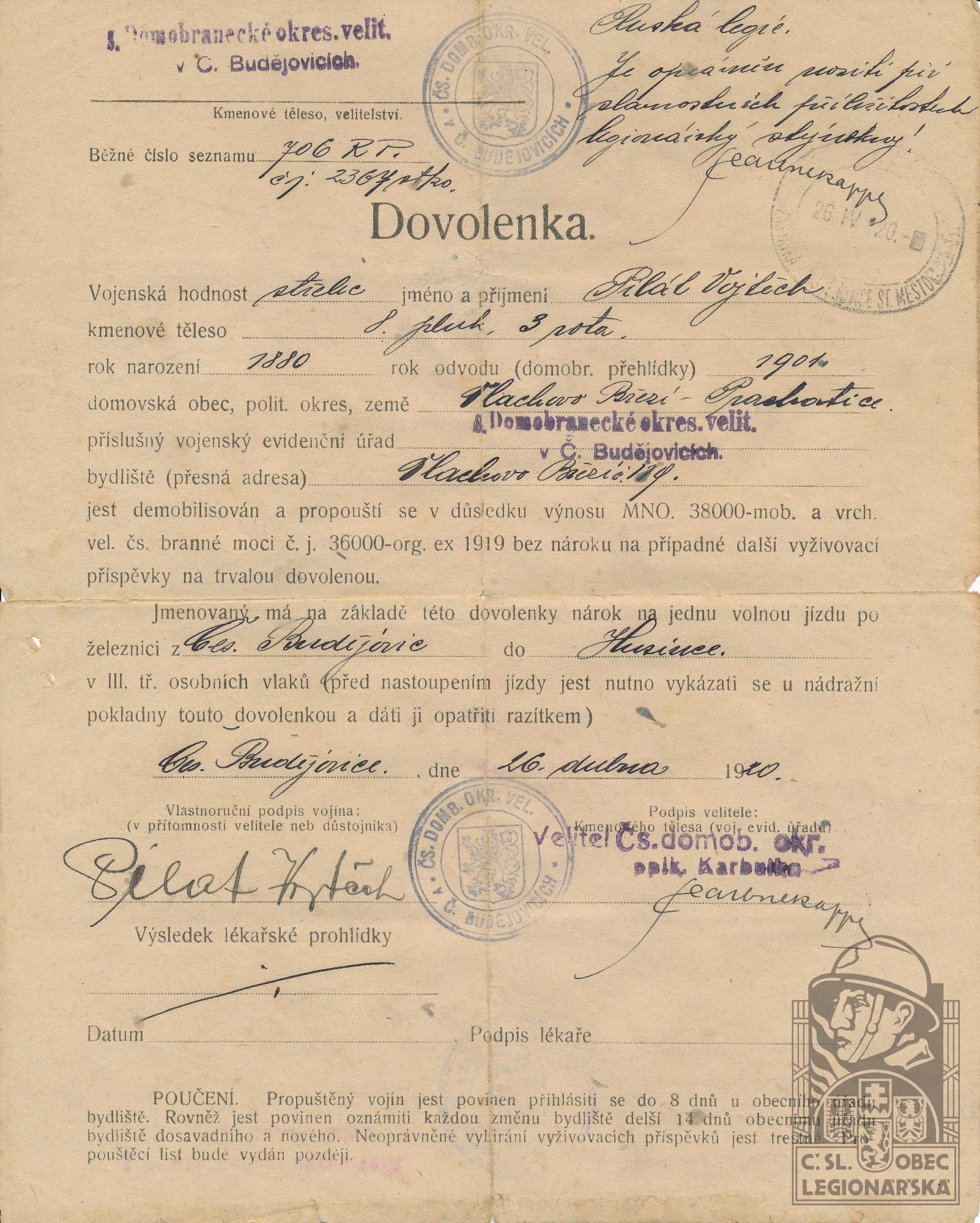 dokumenty spojené s osobou legionáře