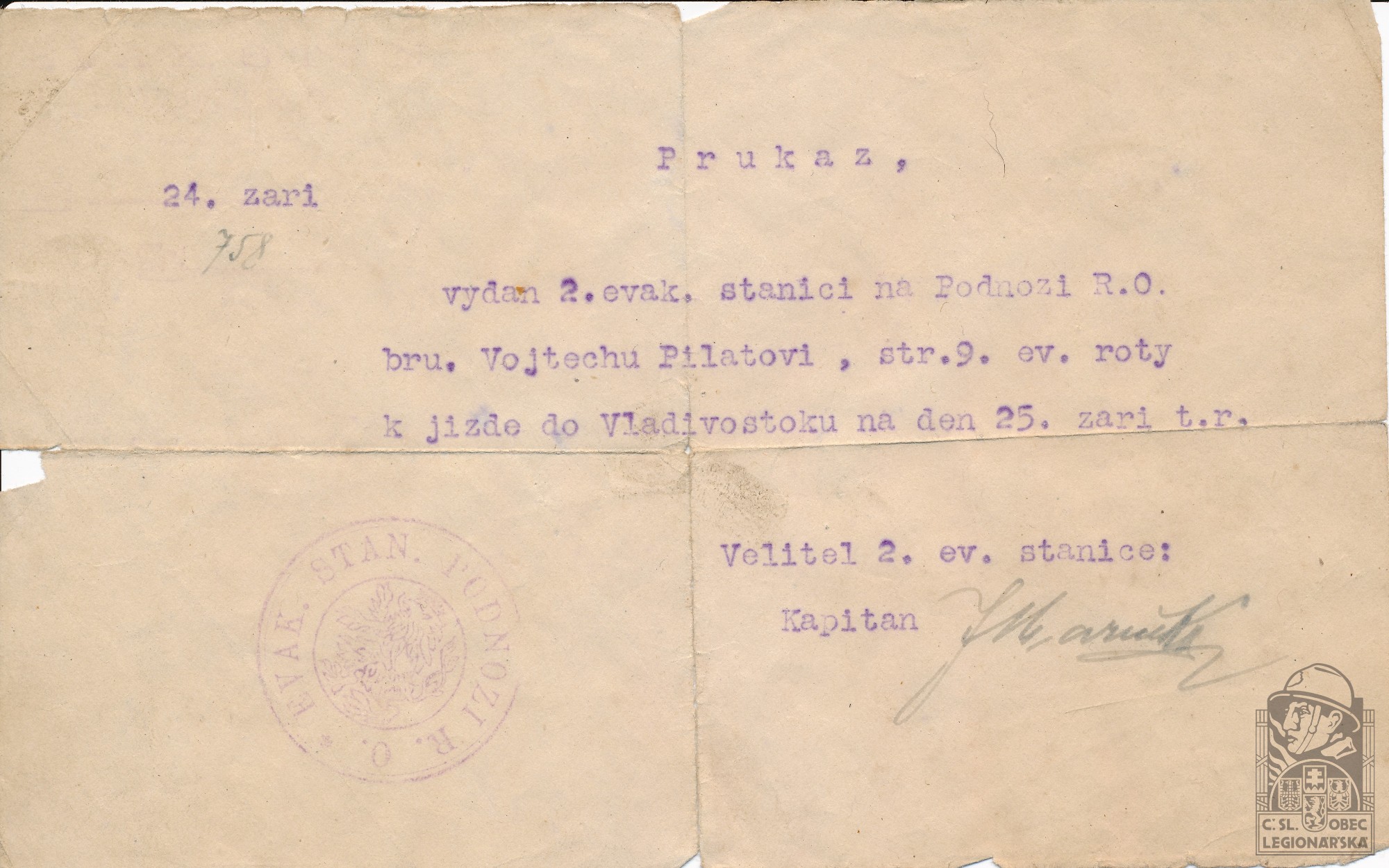 Jednotka v době zařazení:8.stř.pl. ( Čs. legie v Rusku )