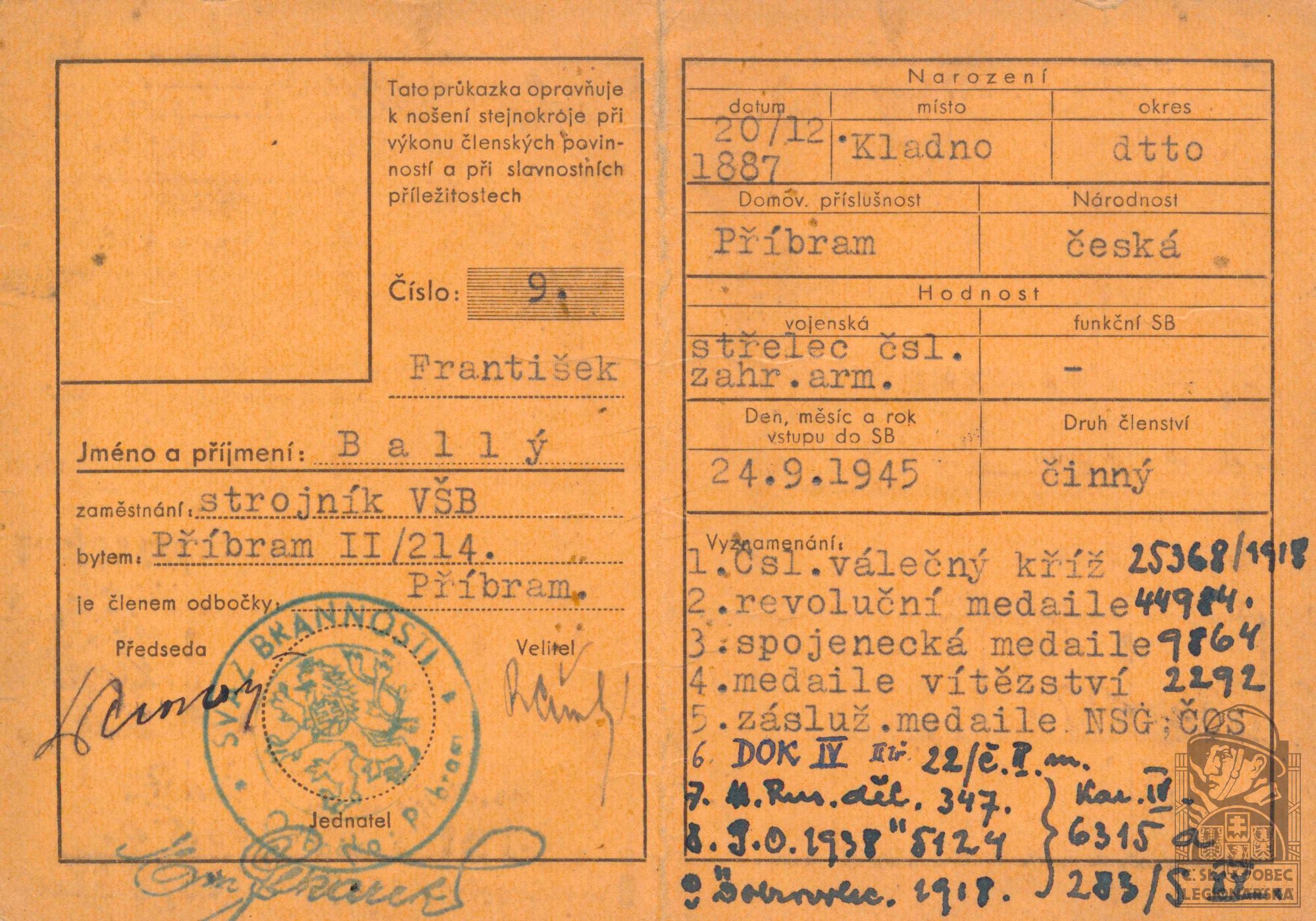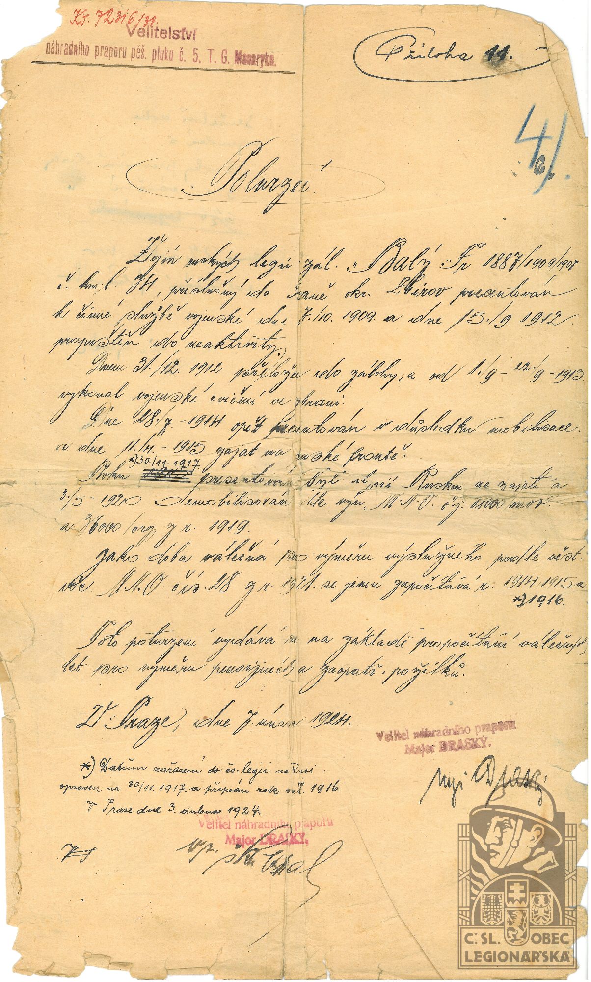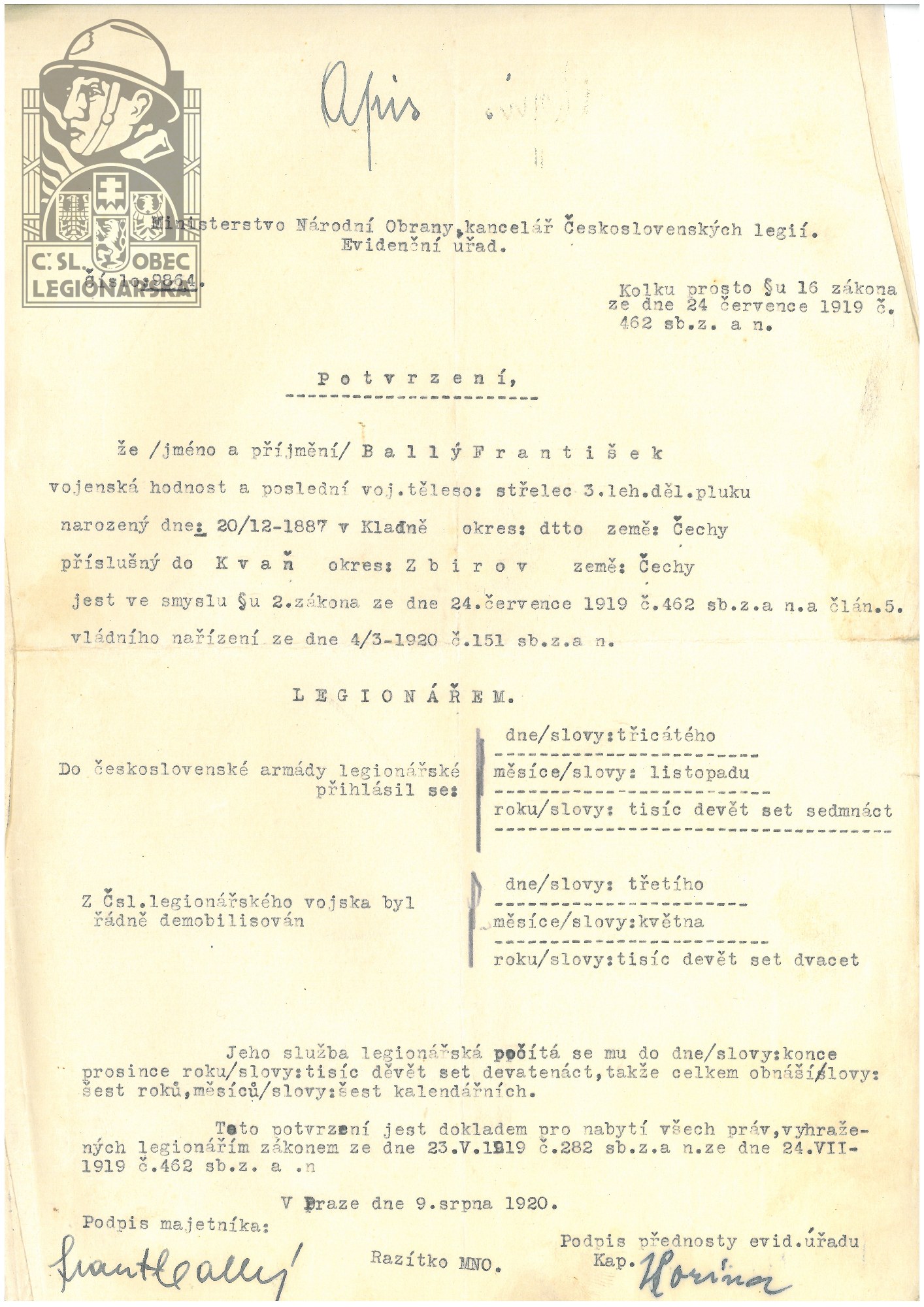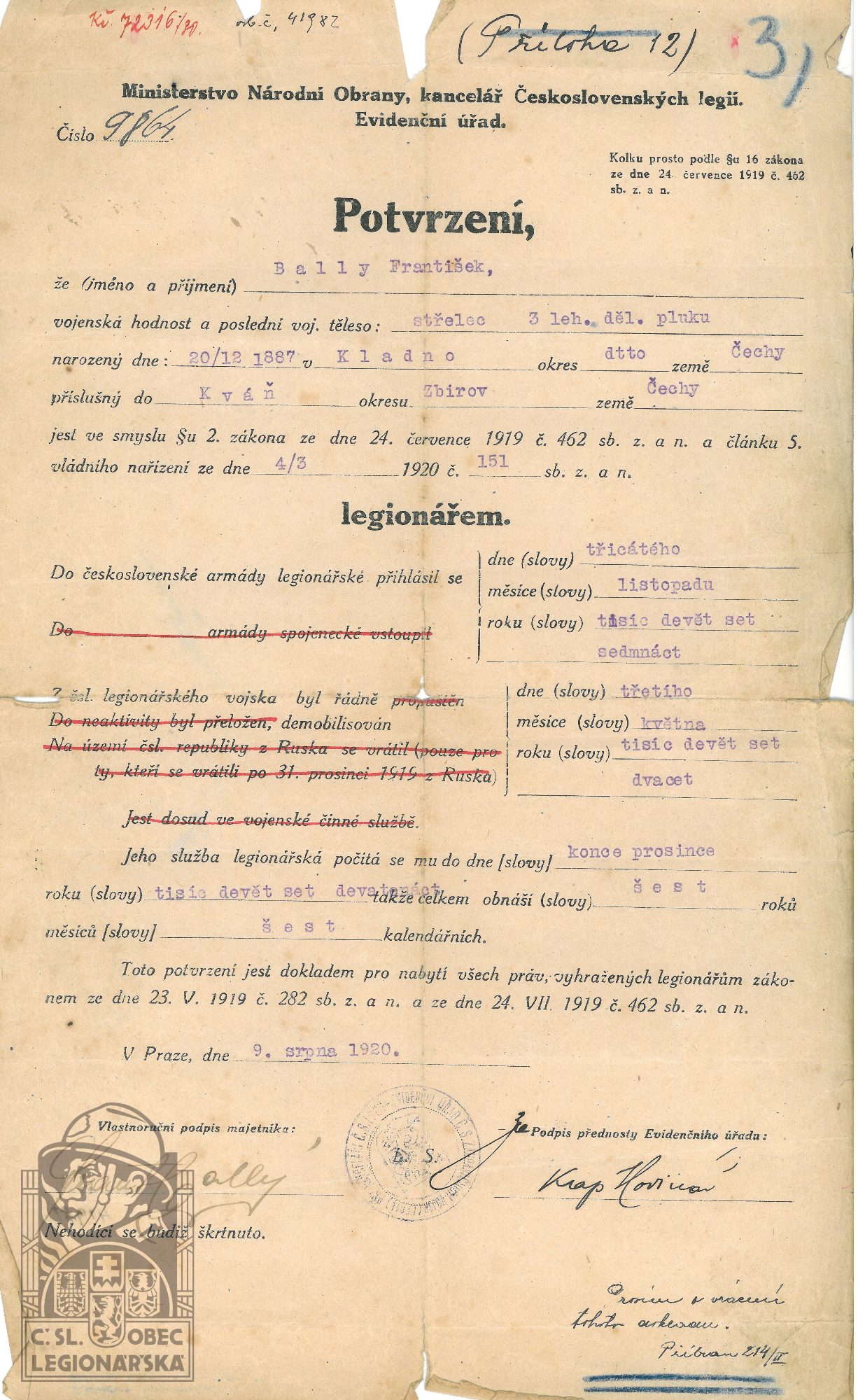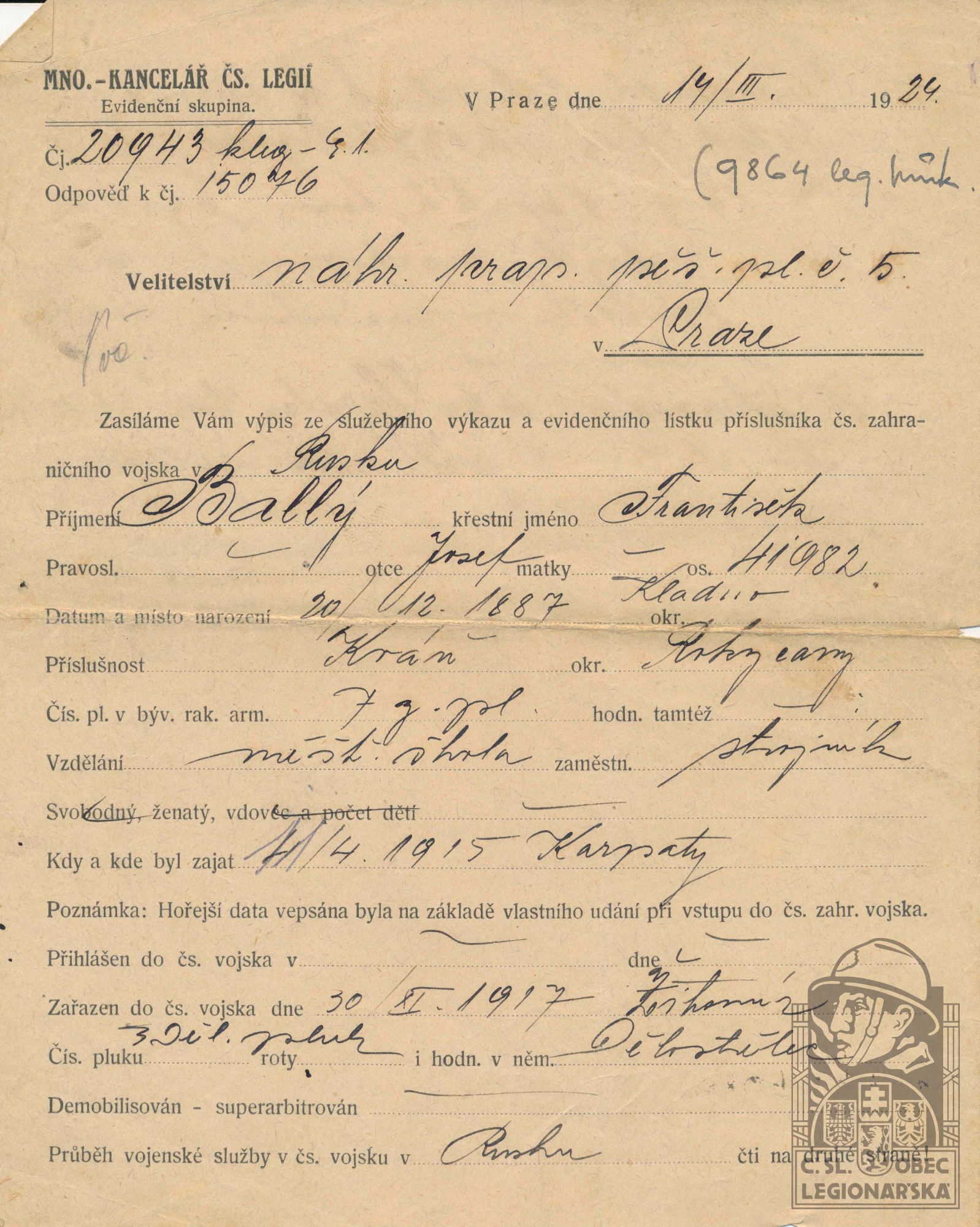 Poznámka:V legiích od 30.11.1917 do 31.12.1919.