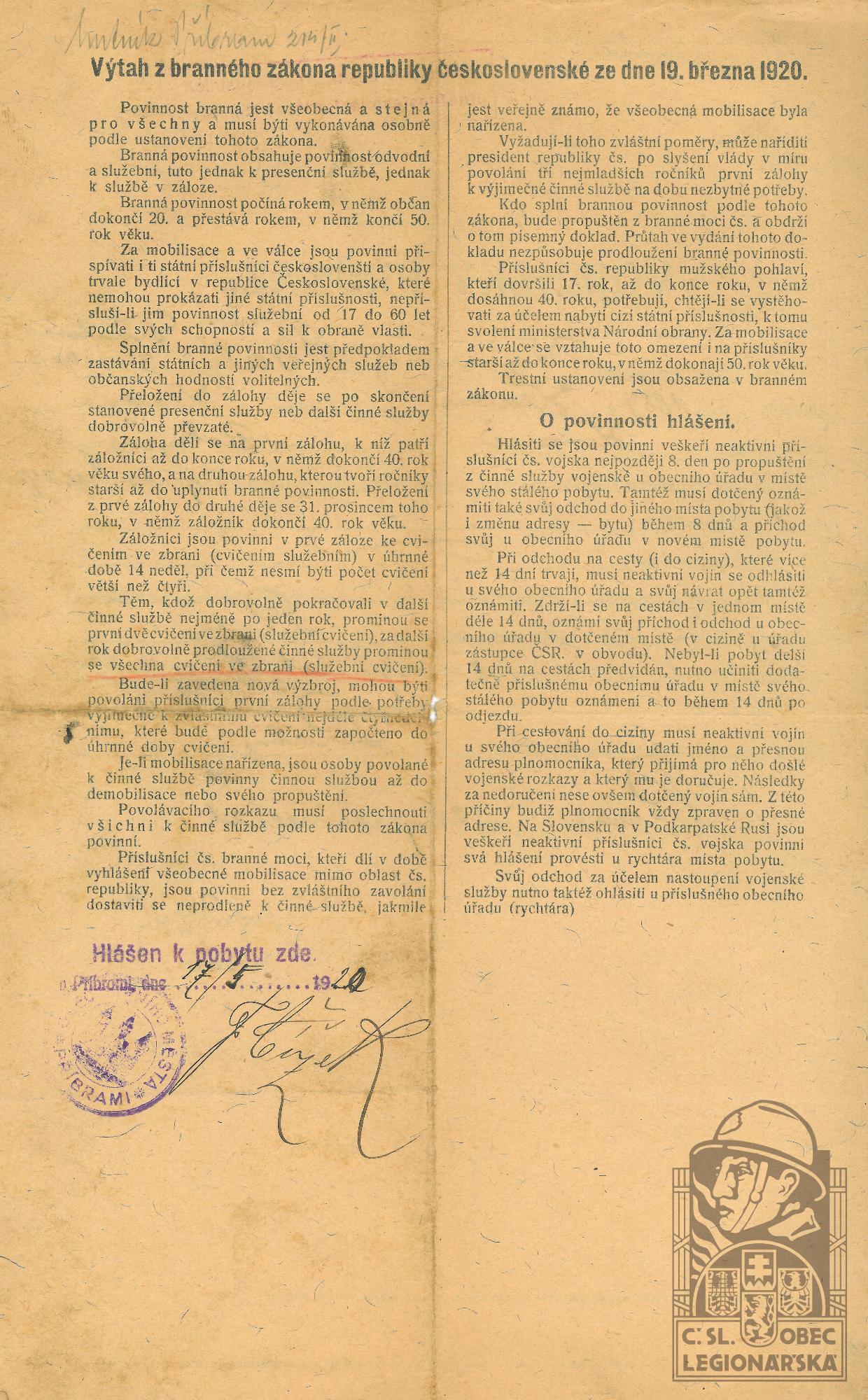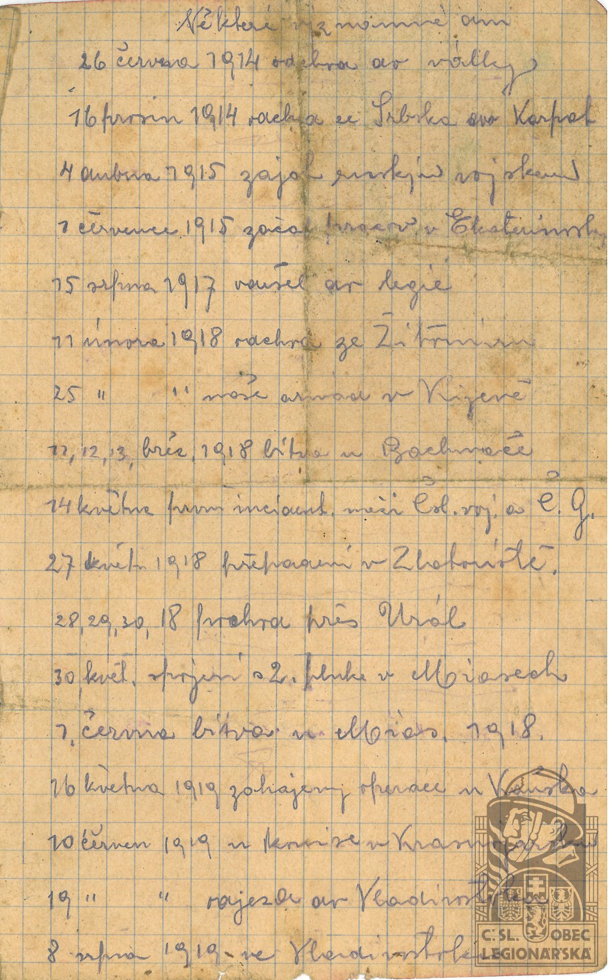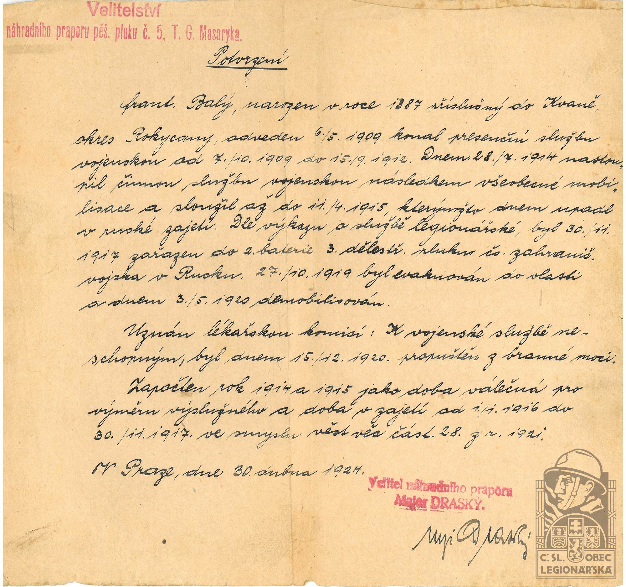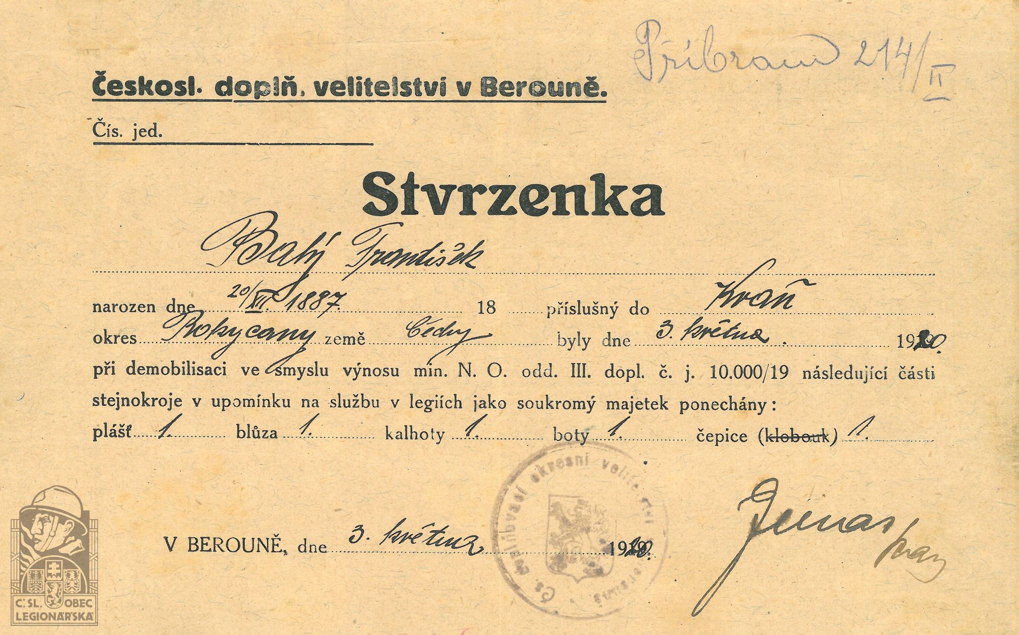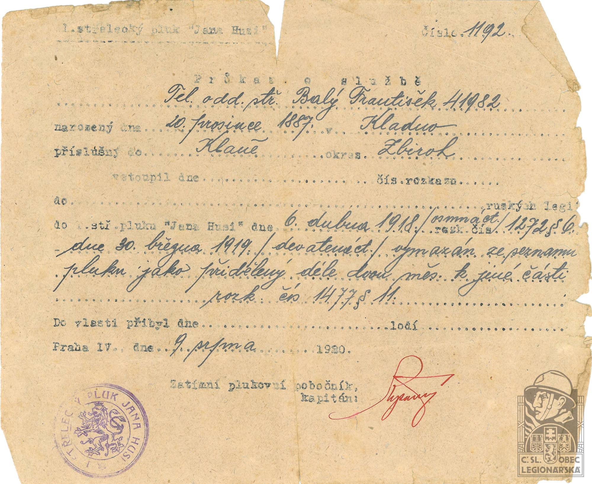Zdroj informací: legionářský poslužný spis osobní karta legionáře rodinný archiv